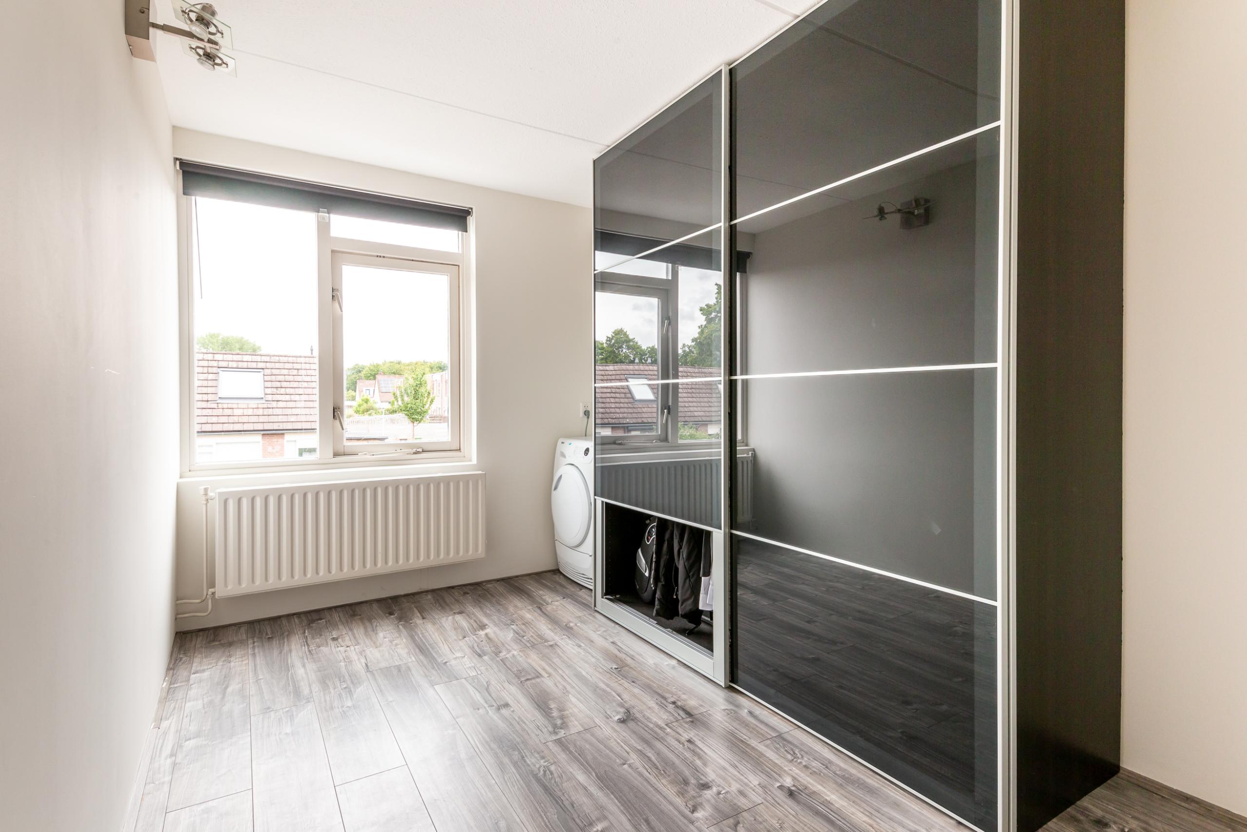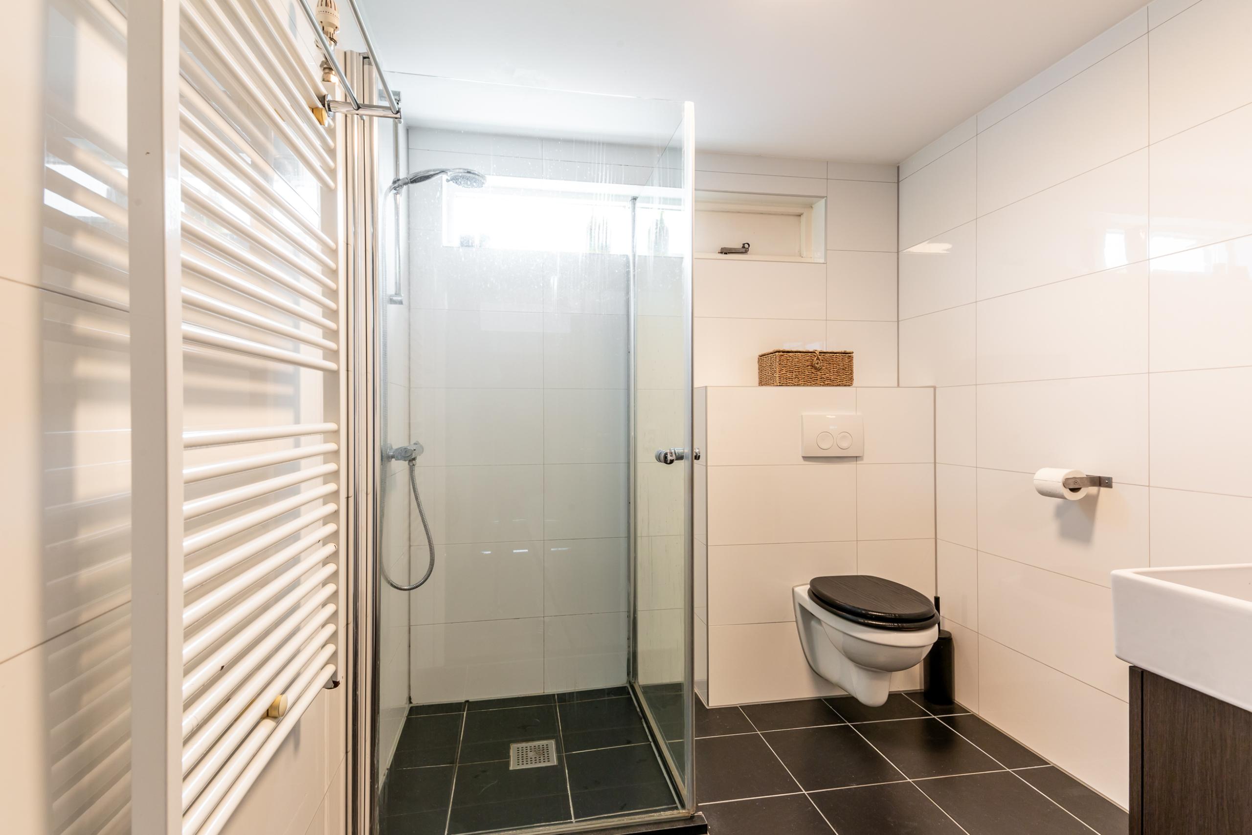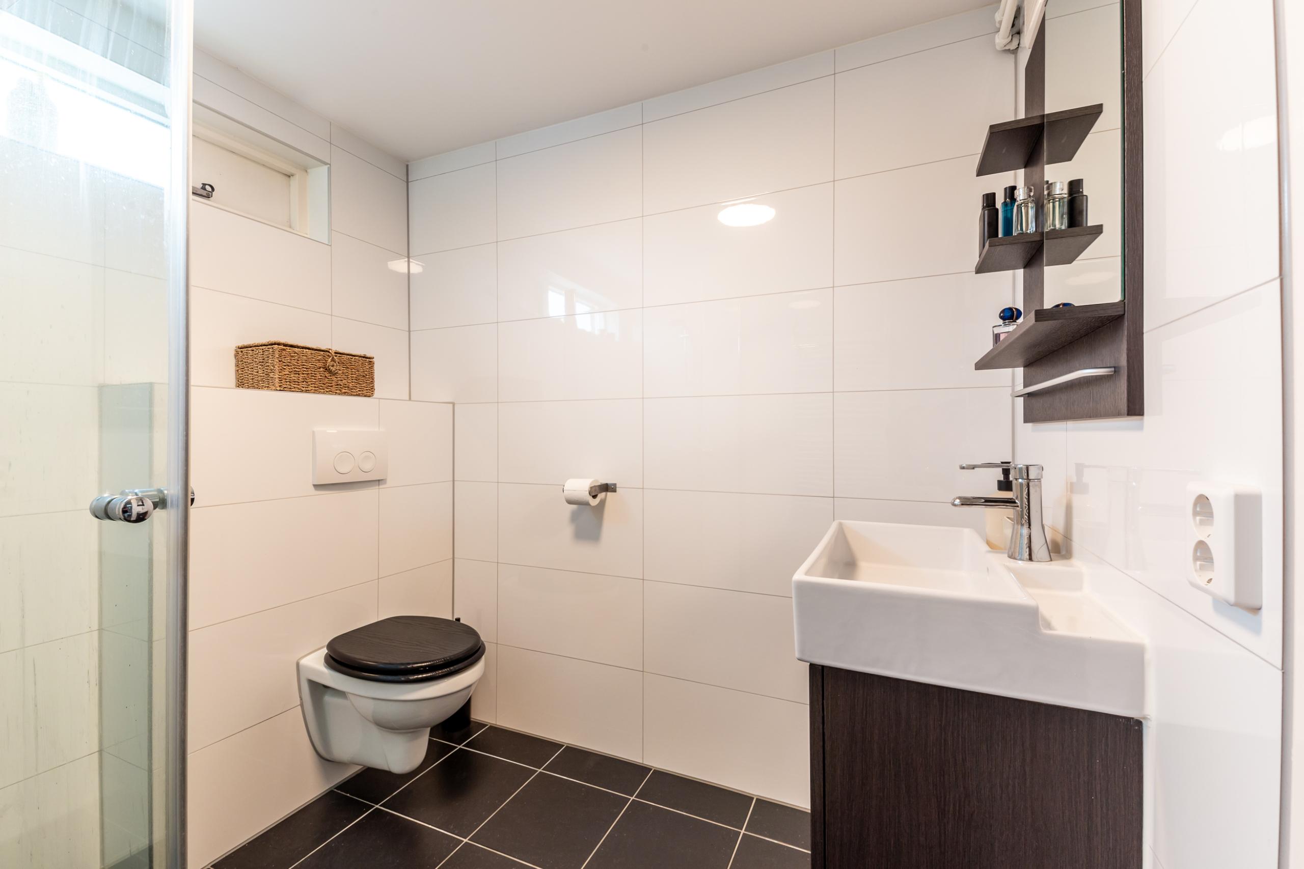 Eerste verdieping: Overloop met bergkast en een aparte ruimte met de CV- ketel (Intergas HR-e uit 2020) en de witgoedaansluitingen; drie slaapkamers van respectievelijk 8,9-, 9,8- en 11,8m²; in lichte kleurstelling uitgevoerde moderne badkamer uit 2019 met een douchehoek, badkamermeubel, tweede (hangend) toilet, designradiator en een raam voor natuurlijk lichtinval en ventilatie.