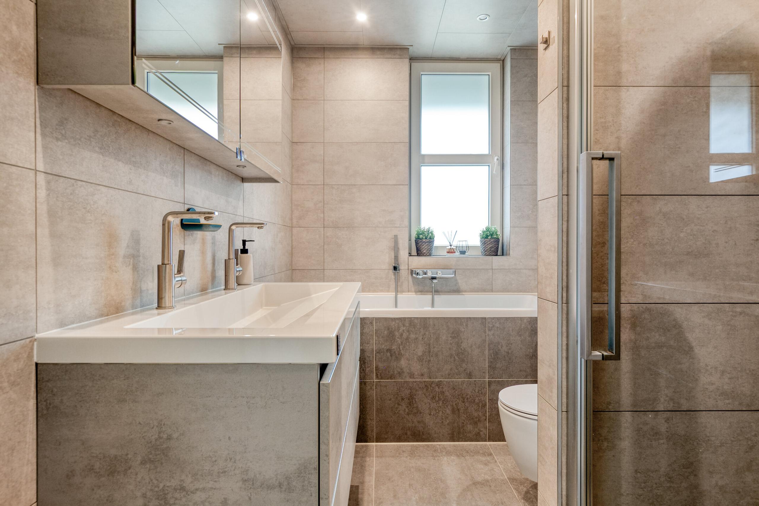 Eerste verdieping: Overloop; drie slaapkamers van 8,8-, 11,8- en 12,8m²; luxe uitgevoerde, in 2019 geplaatste, en volledig betegelde badkamer met een ligbad, tweede toilet, douche, wastafelmeubel met dubbele kraan en een verlaagd plafond met spots.