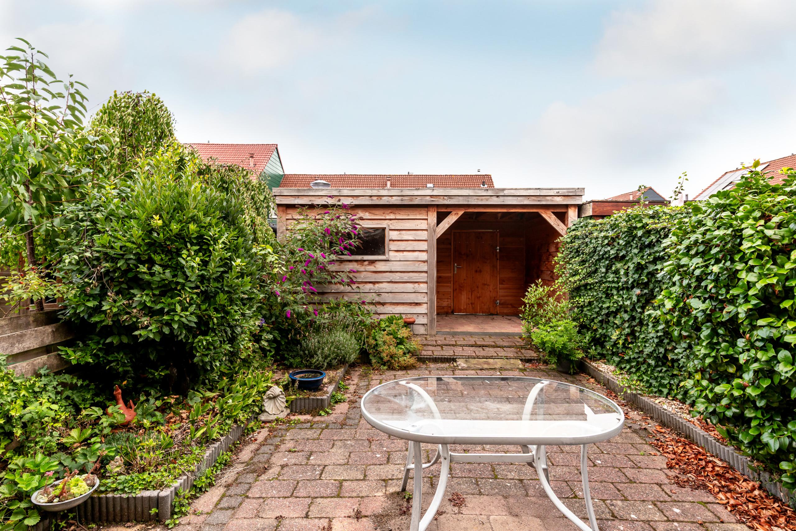 Tuin: Een bijna 8 meter diepe achtertuin op het zuiden georiënteerd welke is voorzien van bestrating, een houten berging (ca. 2,62 x 2,61 meter) met heerlijke overkapping / veranda (ca. 2,27 x 2,61 meter) en diverse beplanting. Via de overkapping heeft u tevens een achterom.