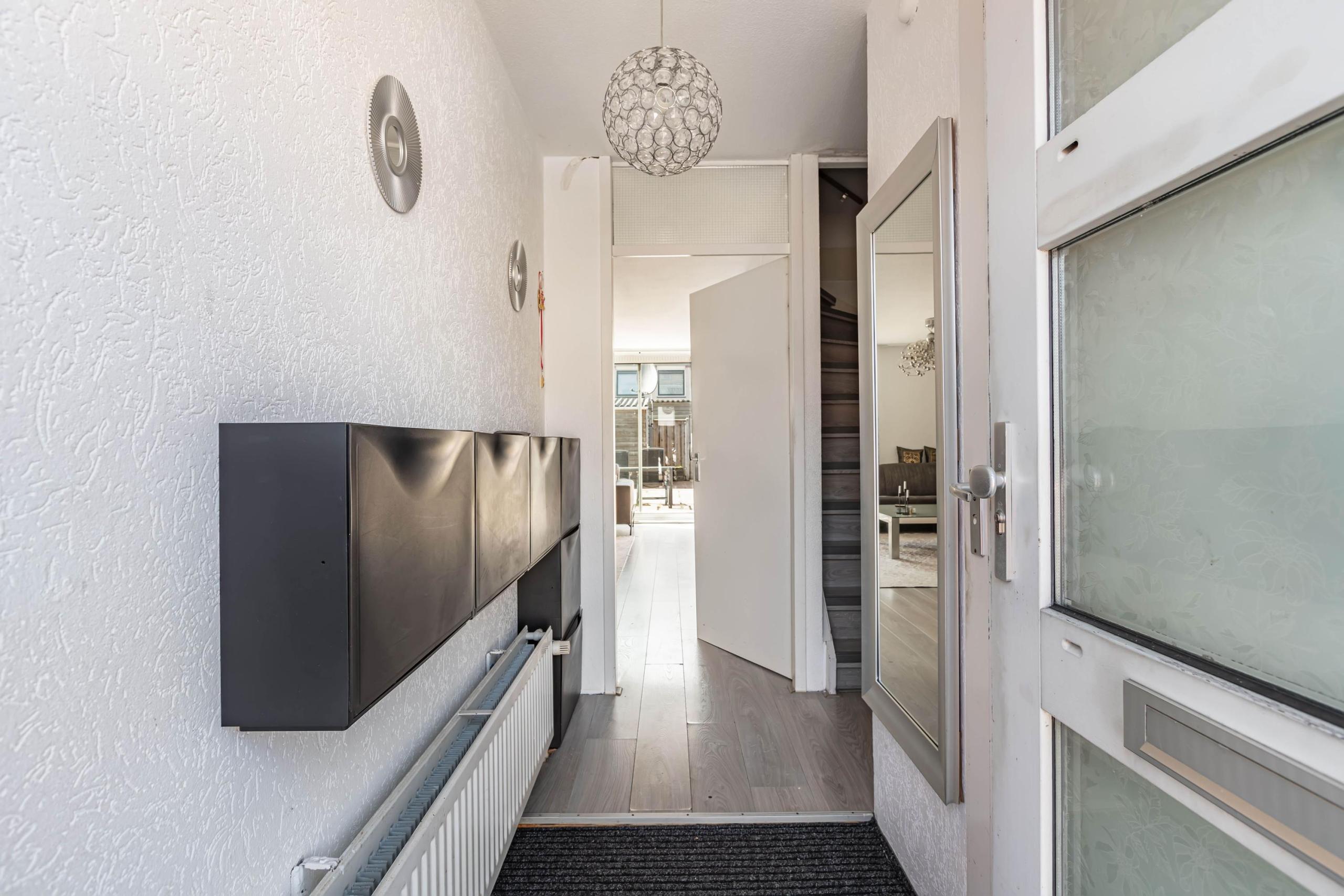 Begane grond: Entree, hal, meterkast, toilet met fonteintje en trapgang naar de eerste verdieping; tuingerichte woonkamer welke is voorzien van een schuifpui waardoor er veel natuurlijk lichtinval de woning binnenkomt; een in 2020 vernieuwde open keuken in U-opstelling welke is uitgevoerd in hoogglans en voorzien van de navolgende inbouwapparatuur: RVS afzuigschouw, inductie kookplaat, combi oven/magnetron, koelkast alsmede een volledig geïntegreerde vaatwasser.