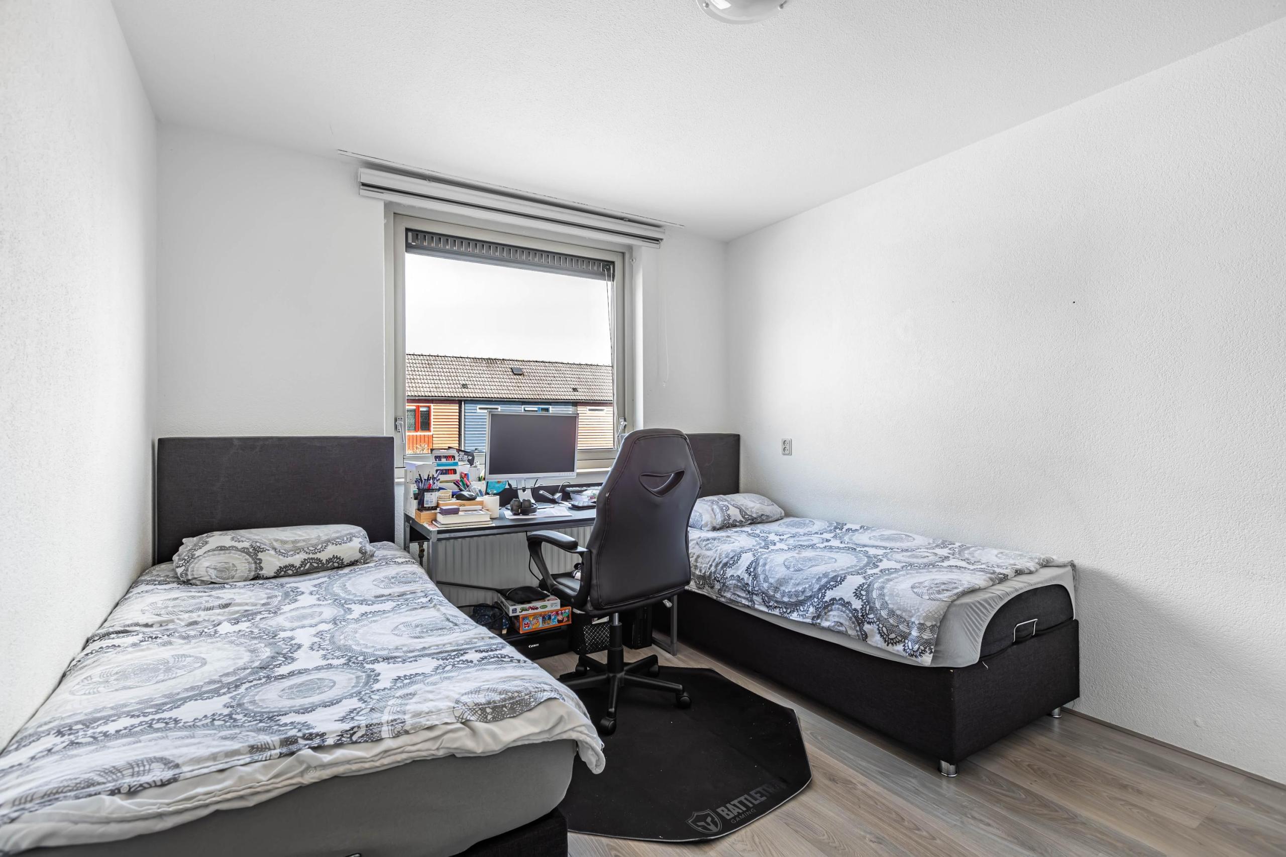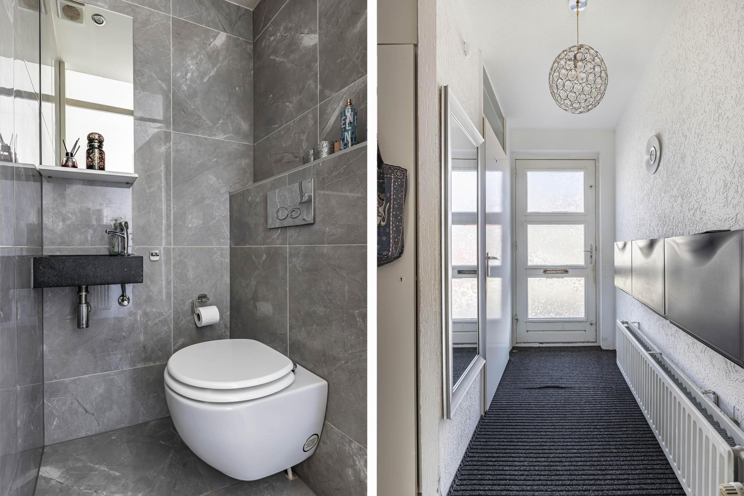 Eerste verdieping: Via de vast trap bereikt u de eerste verdieping welke beschikt over drie slaapkamers en de in 2019 vernieuwde, luxe betegelde badkamer welke is voorzien van een separate douchehoek, vrijhangend toilet, designradiator en badkamermeubel met dubbele wasbak. Door de aanwezigheid van een raam heb je naast de mechanische ventilatie ook natuurlijke ventilatie en daglicht in de badkamer.