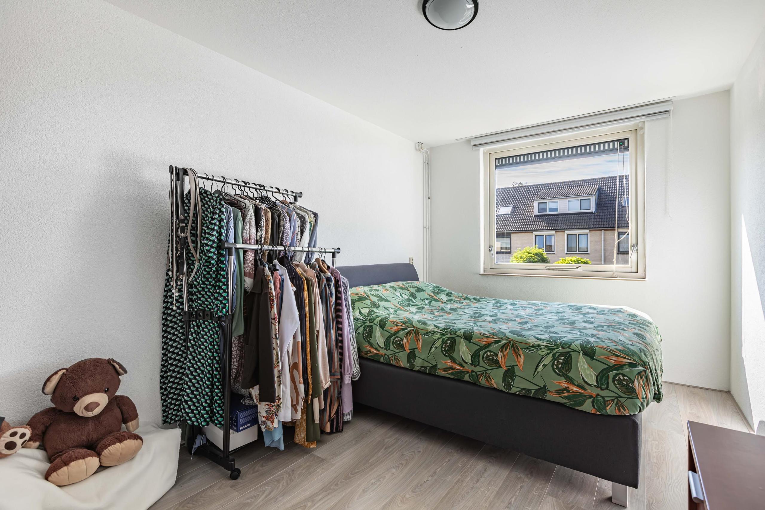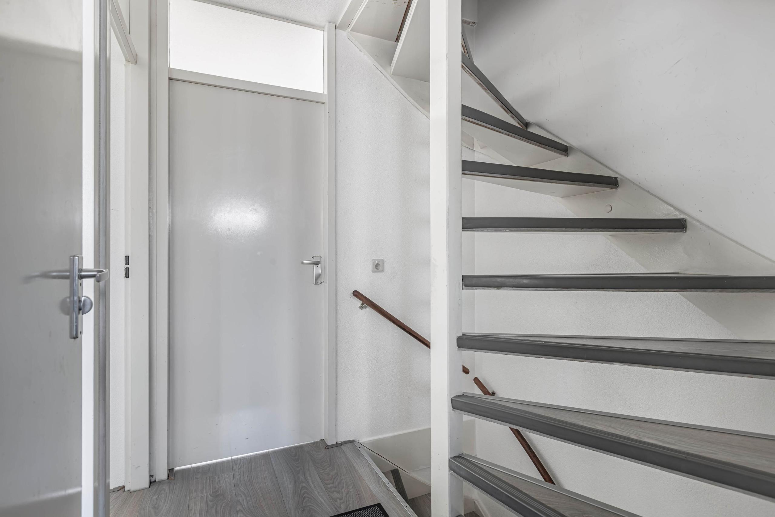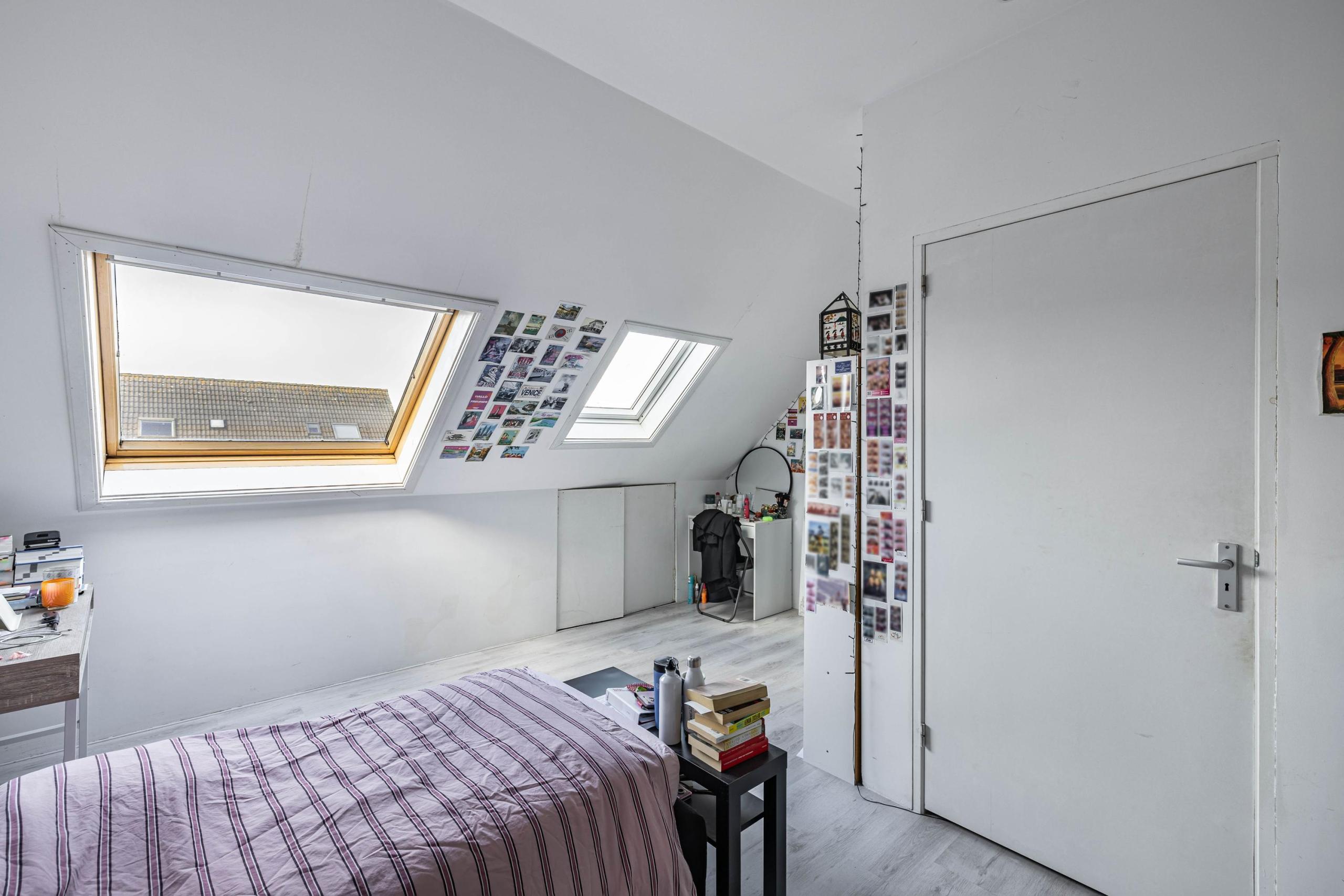 Tweede verdieping: Via een vaste trap bereik je de overloop en deur naar de slaapkamer. Op de overloop tref je de opstelplaats voor je wasmachine en droger. De ruime slaapkamer is volledig gestukt, voorzien van inbouwverlichting en heeft een extra Velux dakraam voor lichtinval.