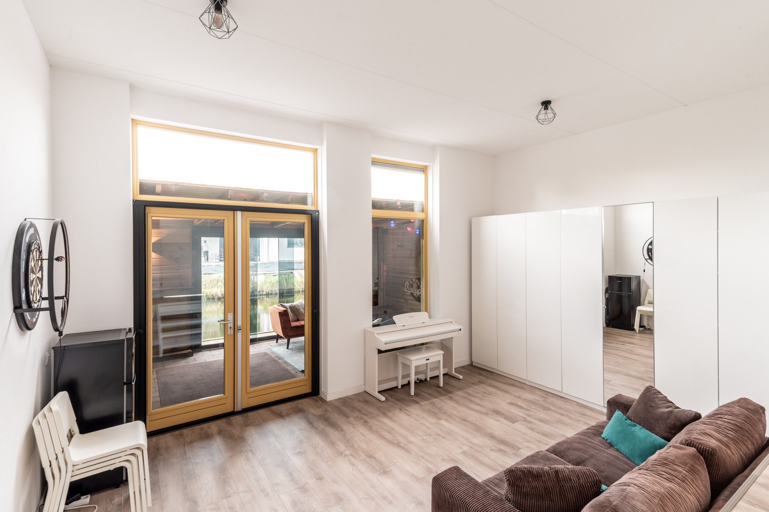 Deze in 2020 gebouwde woning beschikt over een multifunctionele ruimte op de begane grond met een plafondhoogte van 3,45 meter. Hier kan een heerlijke extra tv-/ zithoek of werkplek worden gerealiseerd om maximaal te kunnen genieten van de serre en het terras aan het water, maar daarnaast ove