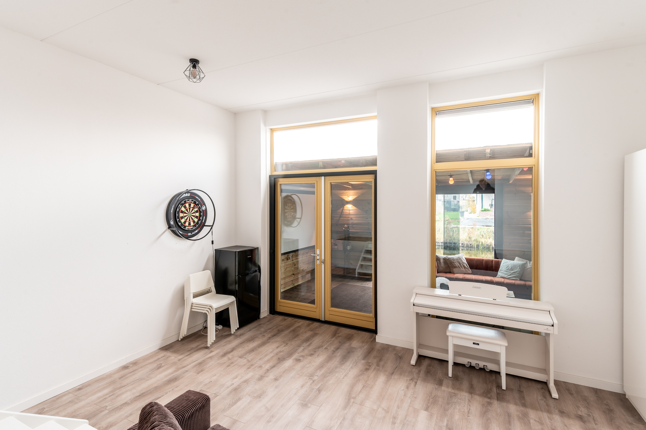 Begane grond: Entree; hal met meterkast, garderobe, toilet, doorgang naar de multifunctionele ruimte; inpandige berging van 14,9m² met witgoedaansluitingen en een bergkast voor de techniek; heerlijke ruimte van 21,6m² met 3,45 mtr. hoge plafonds welke momenteel gebruikt wordt als hobbyruimte; openslaande deuren naar de serre / het terras dat aan het water grenst.
