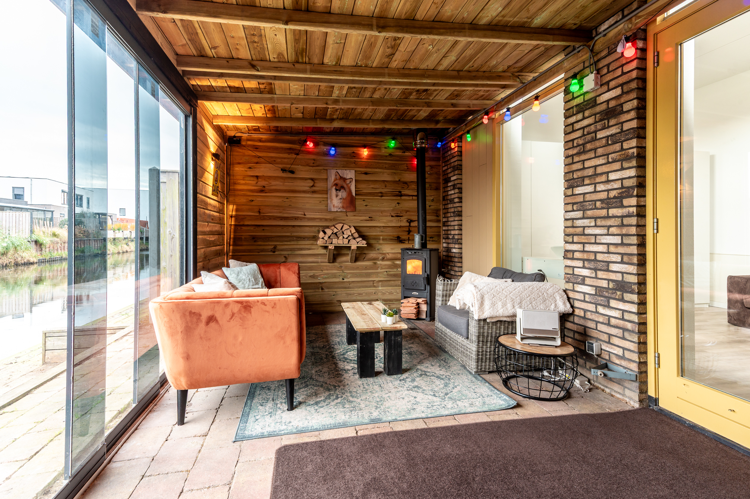 Tuin: De achtertuin is gesitueerd op het noordoosten en daar is een (6 meter x 5,65 meter), is voorzien van een fraaie serre met schuifwanden en houtkachel en is direct aan het water gelegen. In de voortuin op het zuidwesten (6 meter x 9,5 meter) kunt u heerlijk zitten en is er mogelijkheid tot het parkeren van meerdere auto's op eigen terrein.