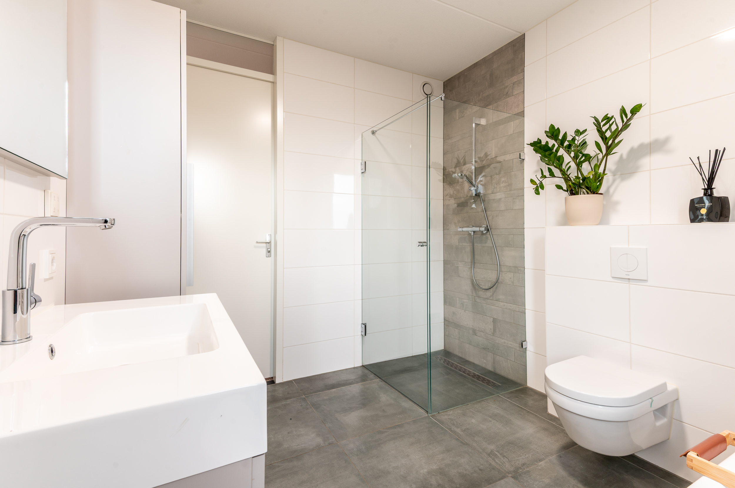 Ook de eerste verdieping is voorzien van een laminaatvloer met vloerverwarming met individuele thermostaten per vertrek.