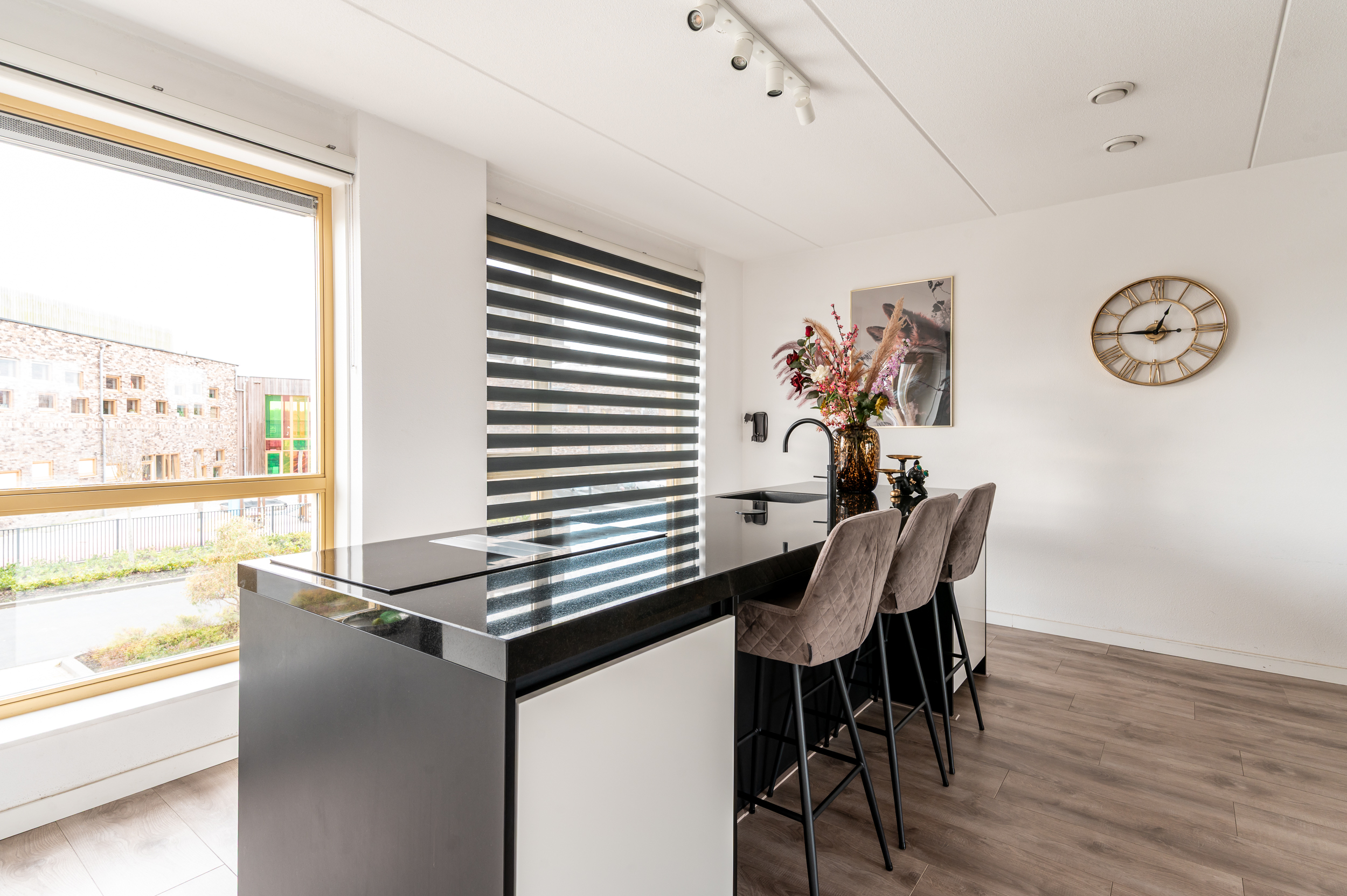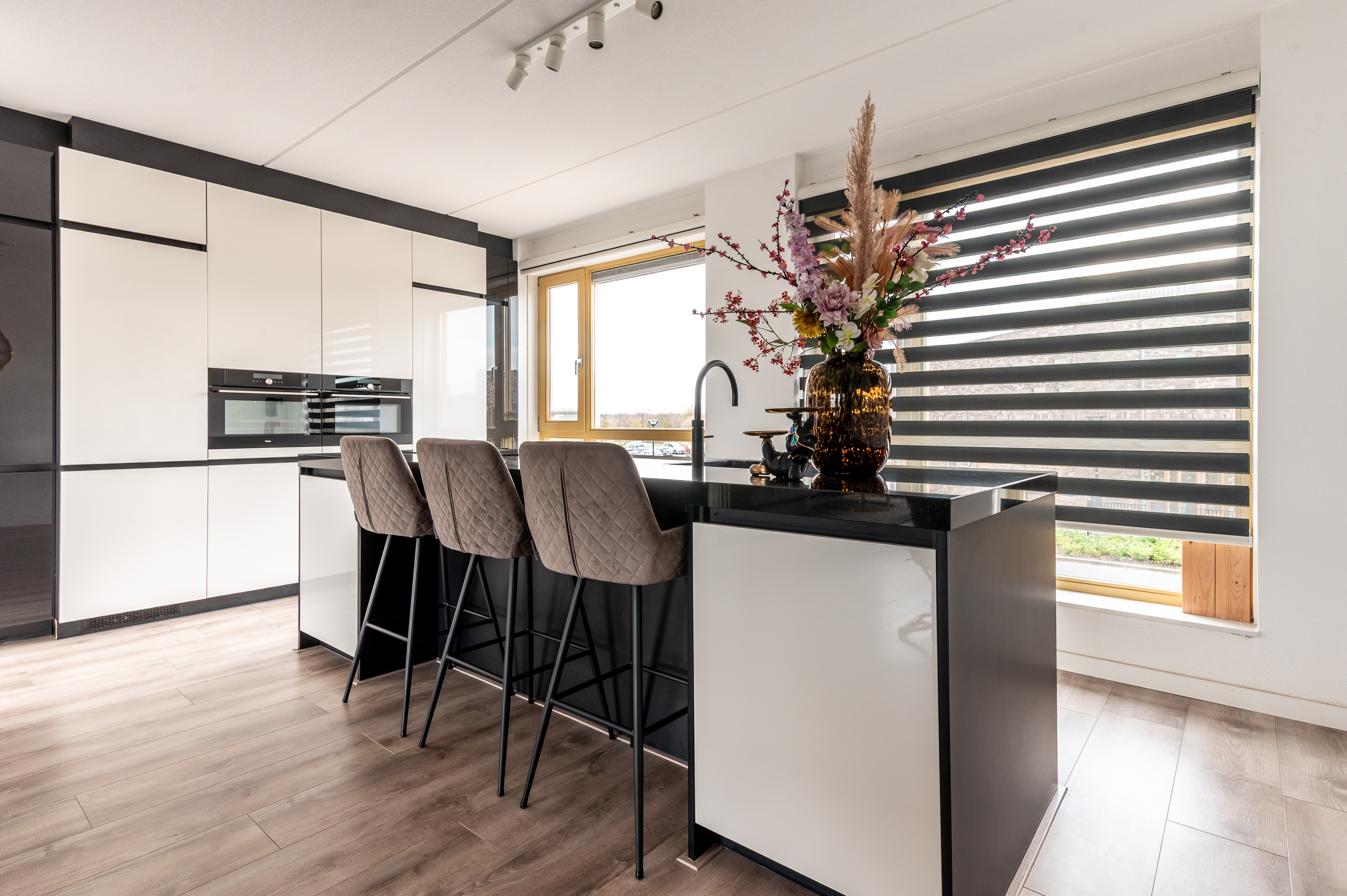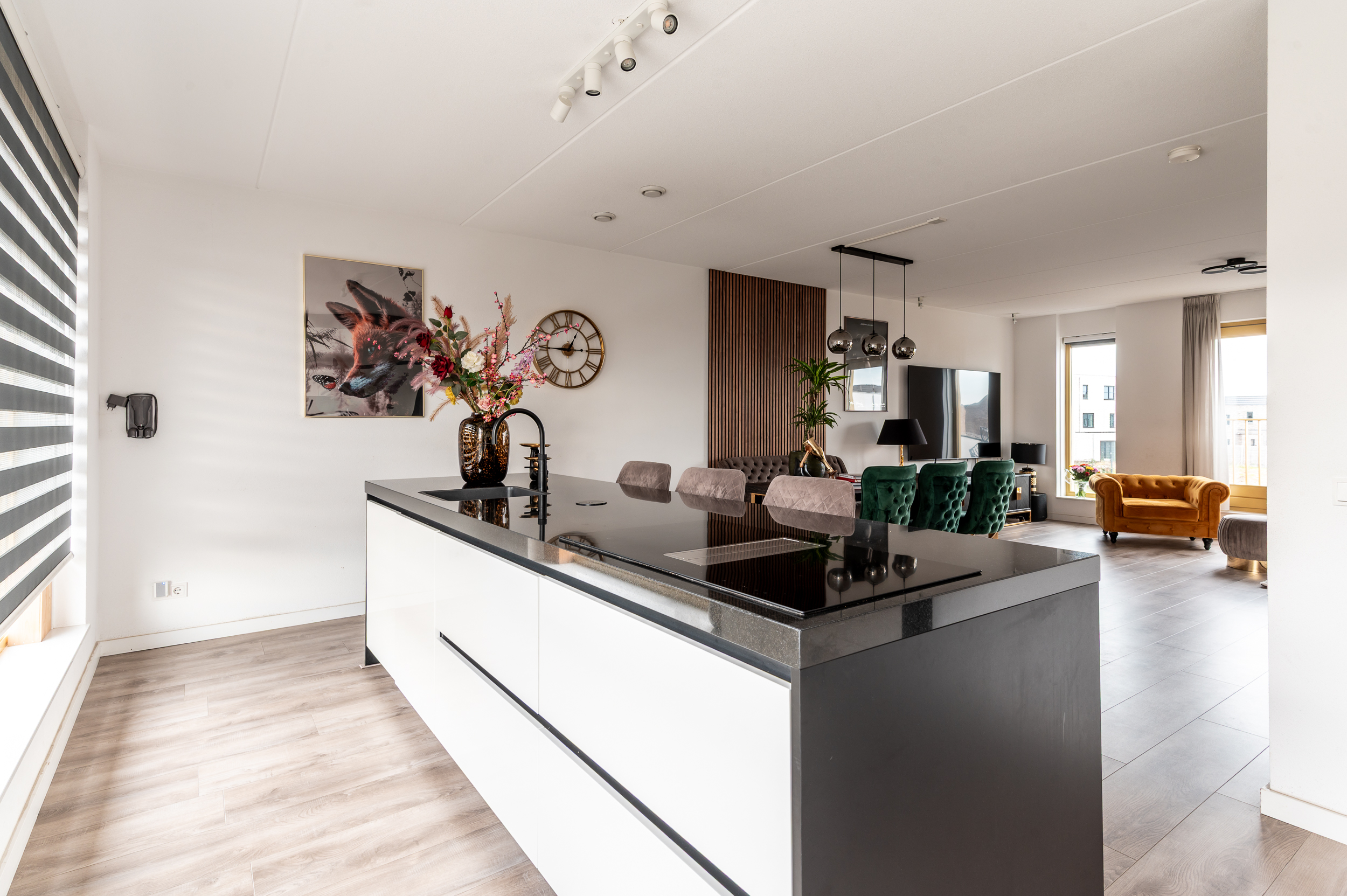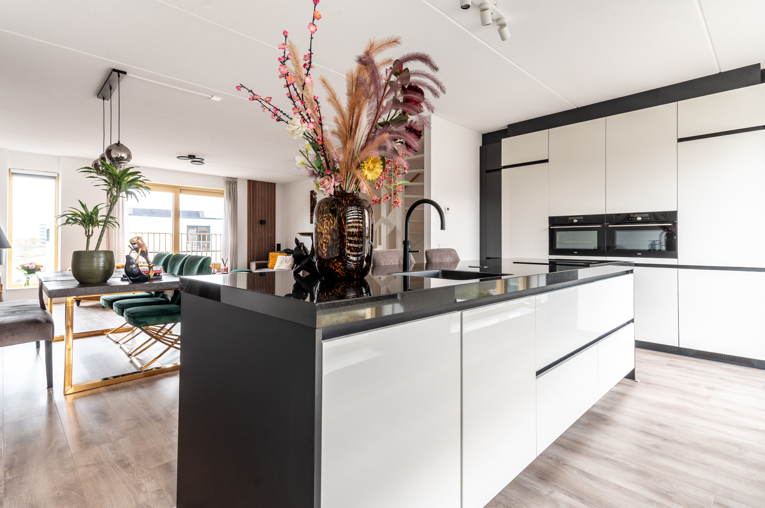 Eerste verdieping: Woonverdieping van 53m² welke is opgedeeld in een woonkamer aan de achterzijde van 34,6m² met een schuifpui met zicht op het water en aan de voorzijde een royale keukenruimte van 18,4m²; keuken met kookeiland in moderne kleurstelling welke is voorzien van ondermeer een volledig geïntegreerde vaatwasser, inductiekookplaat met interne afzuiging, dubbele oven, koelkast, ladenvriezer, Quooker, een natuurstenen werkblad en kastruimte.