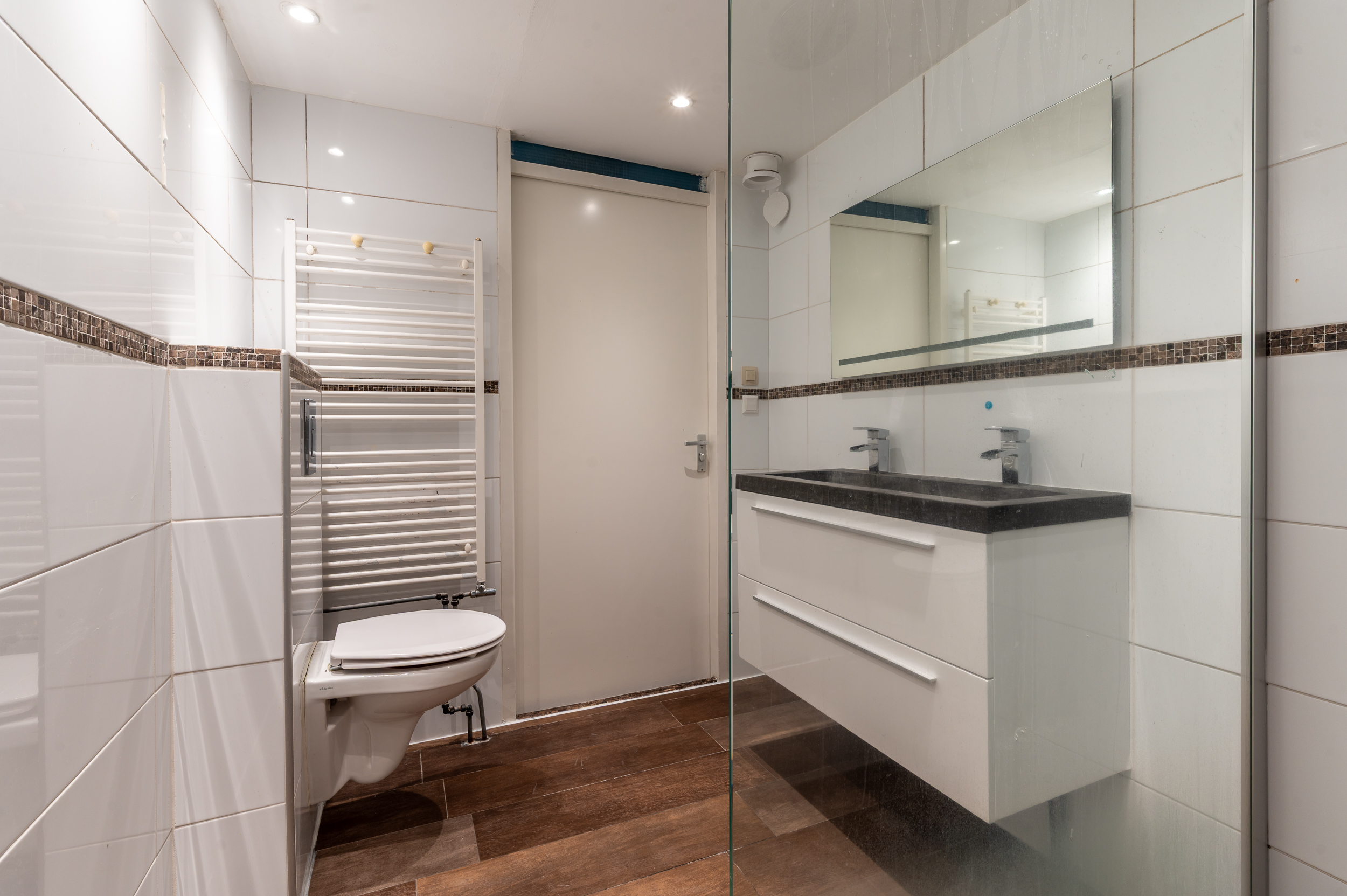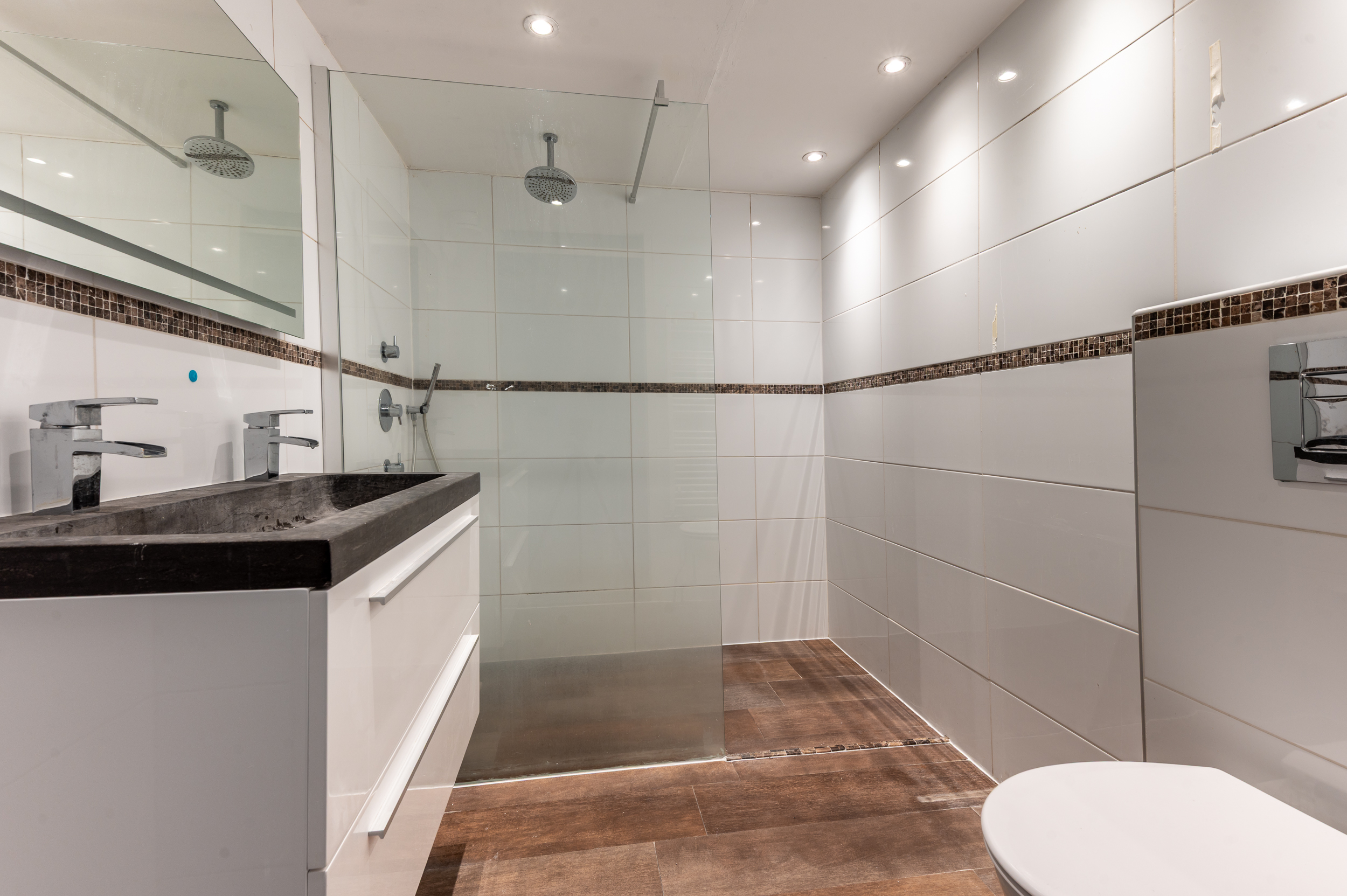 Eerste verdieping: overloop; drie slaapkamers van respectievelijk 6,2-/ 9,4- en 15,5m²; volledig betegelde badkamer welke is voorzien van een inloopdouche; wastafelmeubel met twee kranen; tweede toilet en een designradiator.