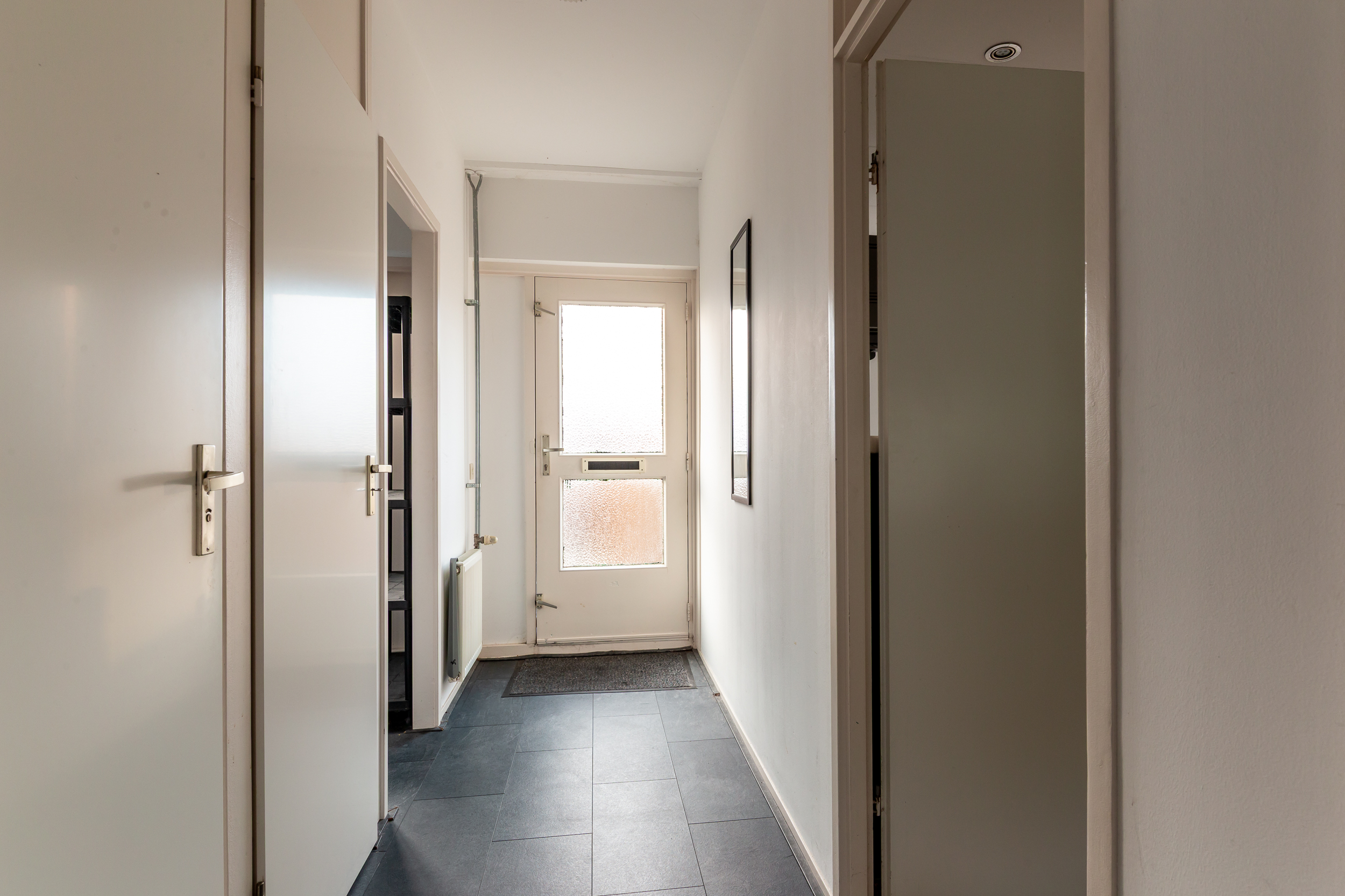 Tuin: De kleine, op het noord/oosten georiënteerde achtertuin/plaats loopt taps toe en is voorzien van volledig bestrating. Een slanke, voor de woning lang lopende, op het zuid/westen gesitueerde voortuin waarin u kunt genieten van het vrije uitzicht, maar vooral van de middag- en ondergaande zon, is een verrassend extraatje wat je normaliter niet verwacht.