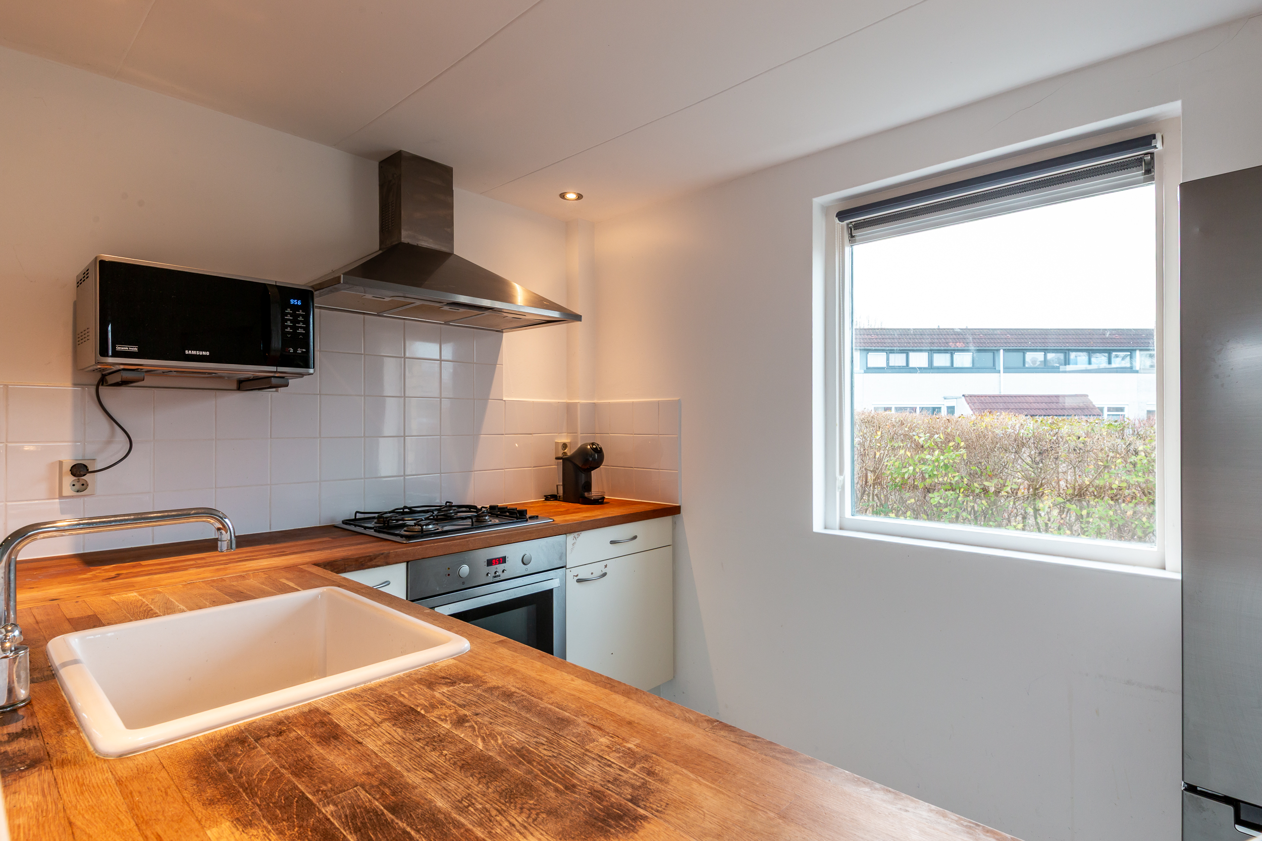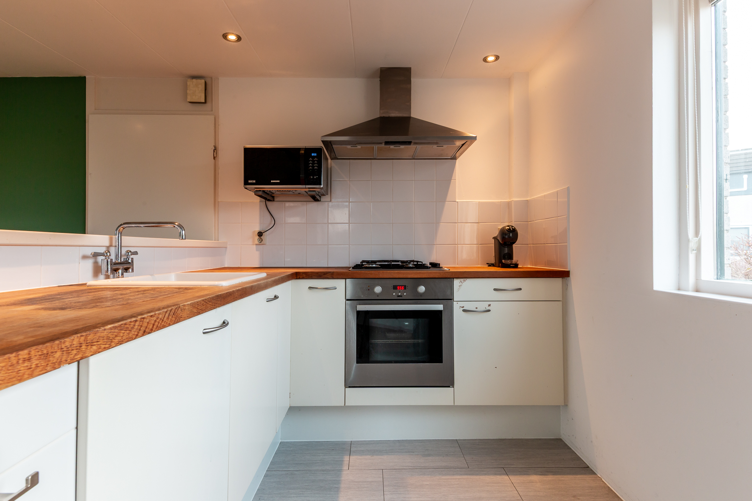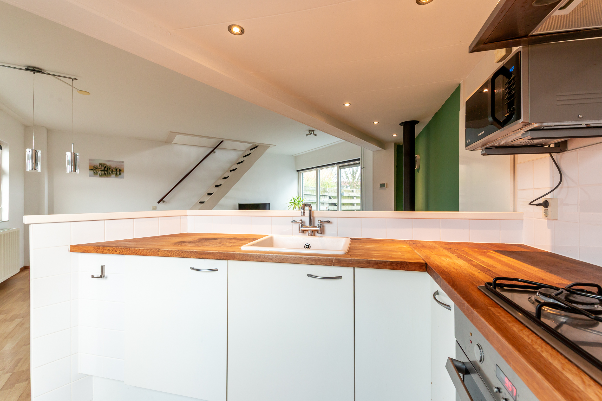 Begane grond: Entree; hal met meterkast, separate ruimte voor de wasmachine- en droger aansluiting; toilet met fonteintje, inpandige berging en toegang tot de zeer lichte, speels vormgegeven woonkamer met houtkachel en open trap; eenvoudige open keuken in L-opstelling welke is voorzien van de navolgende inbouwapparatuur: 4-pits gas kookplaat, afzuigschouw en een combi oven/magnetron. De begane grond is grotendeels voorzien van een laminaatvloer.