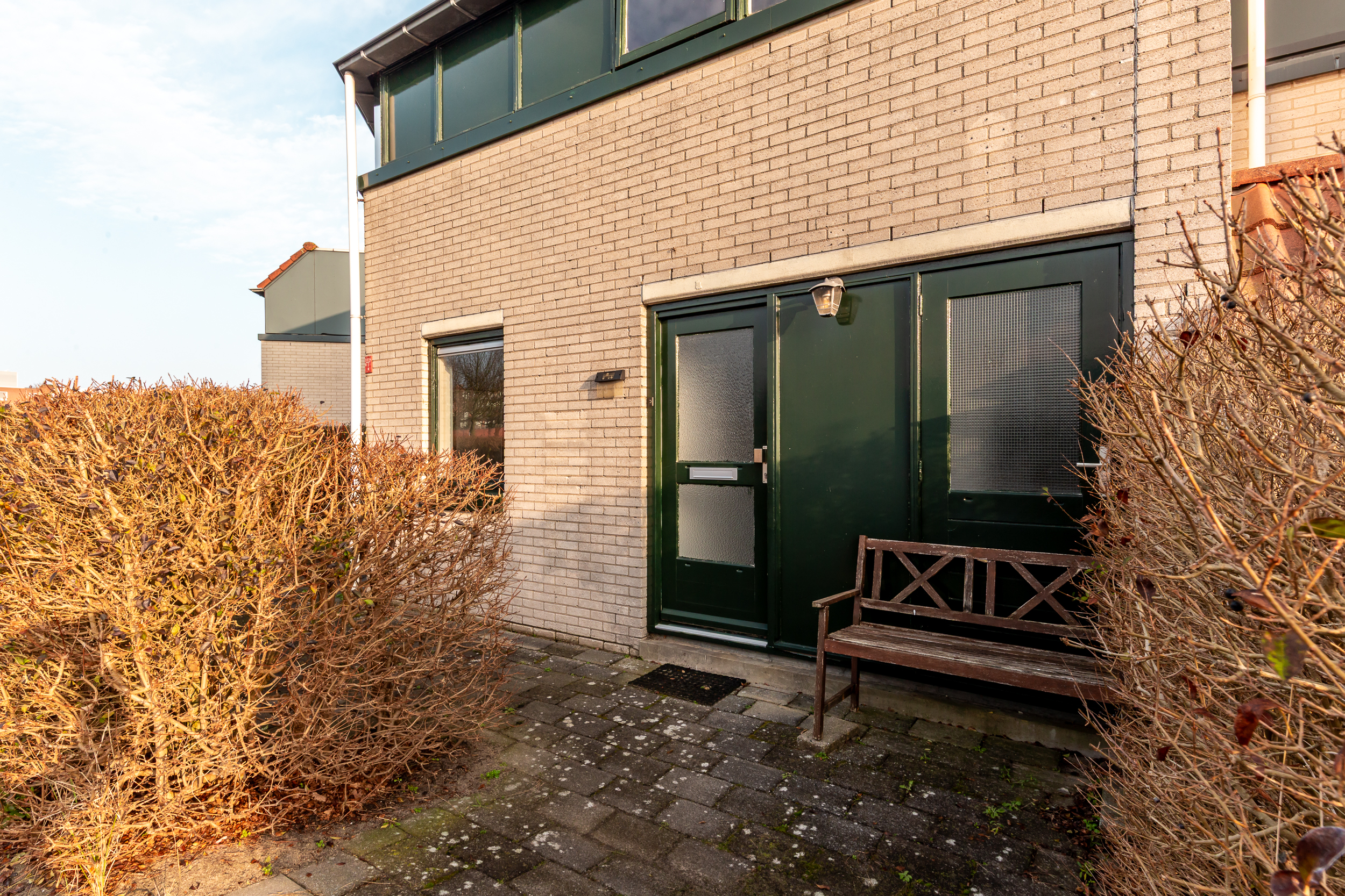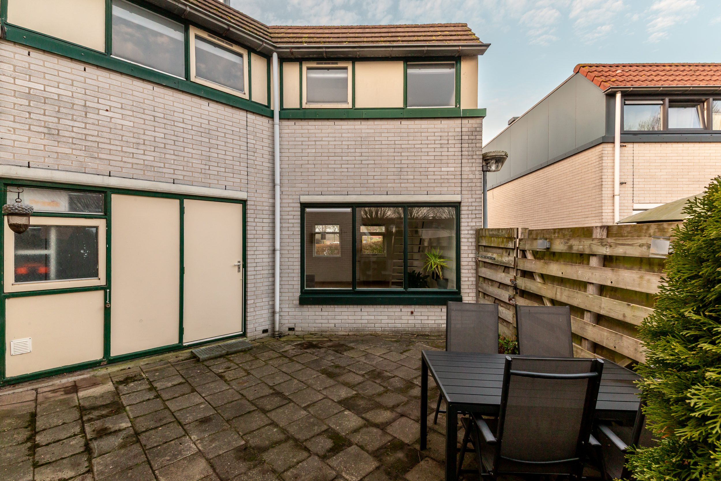 • Kleine, taps toelopende en volledig bestraatte achtertuin, maar een voortuin waar u volop van de zson kunt genieten