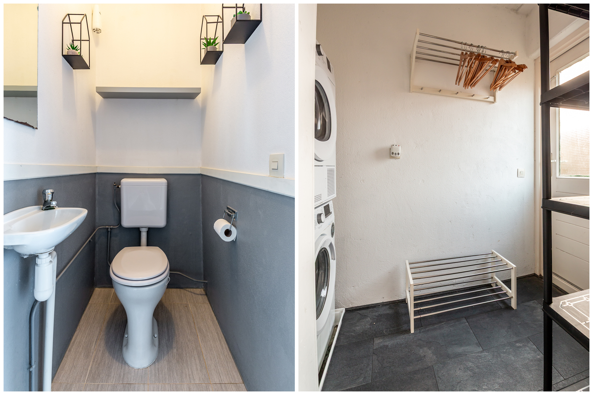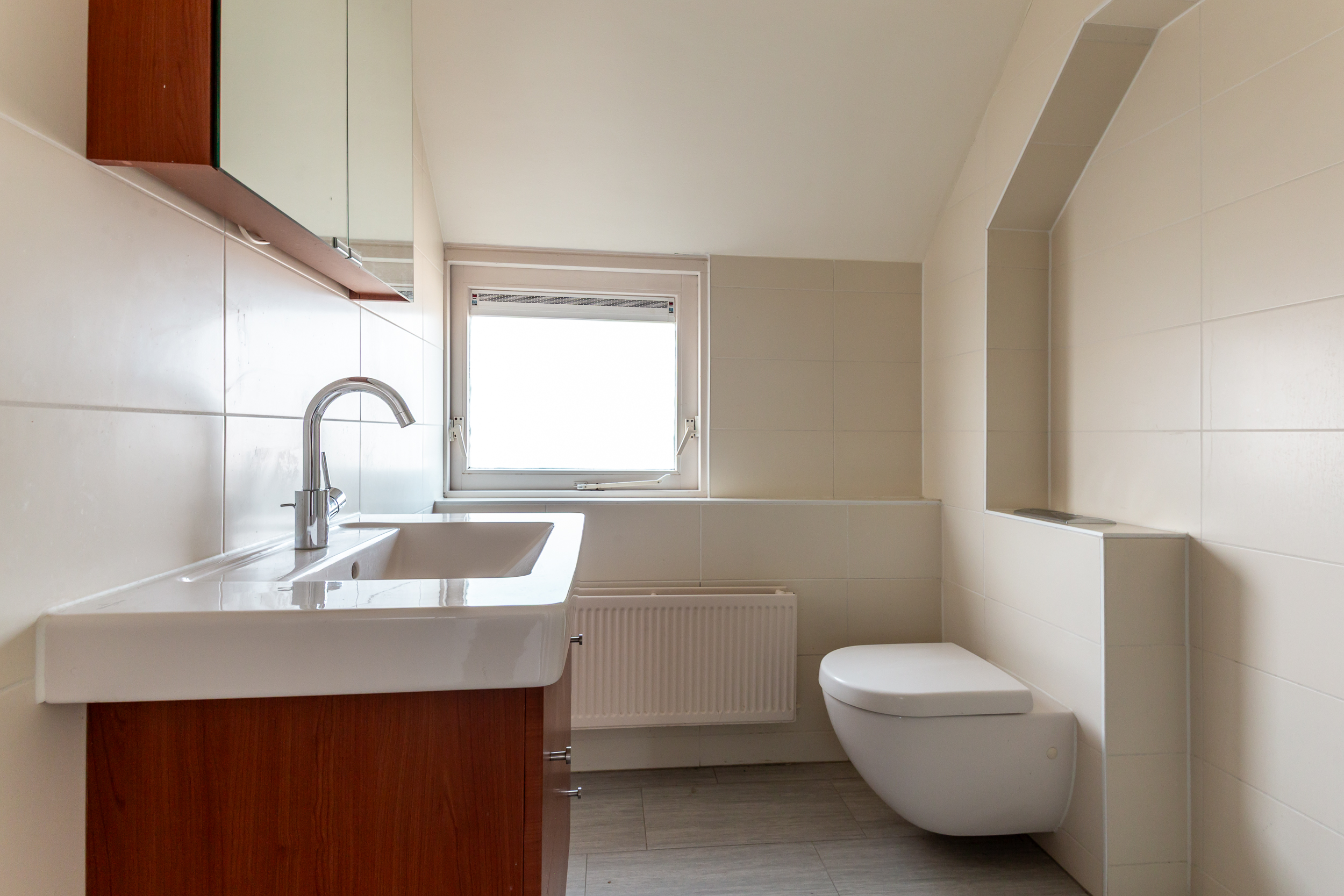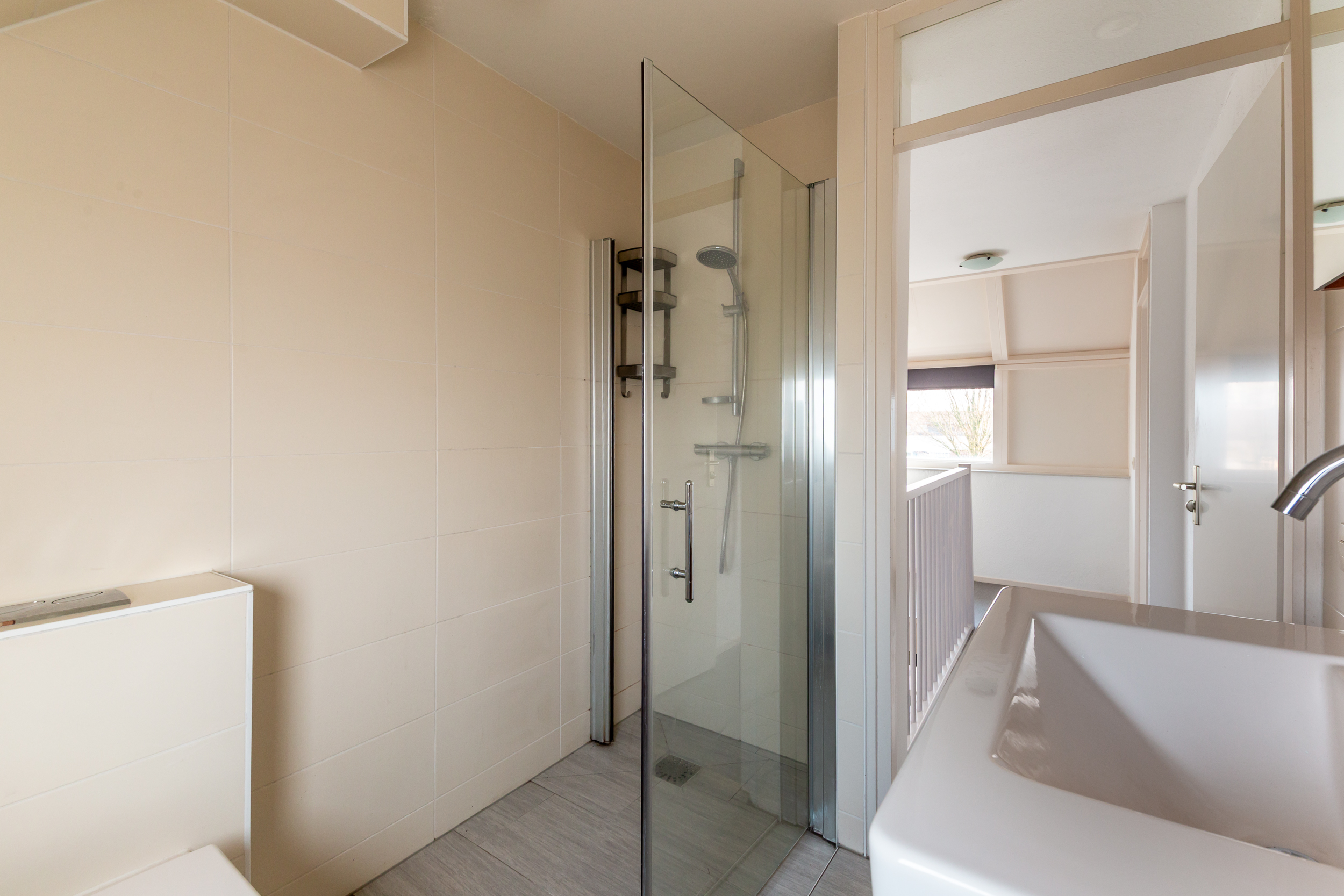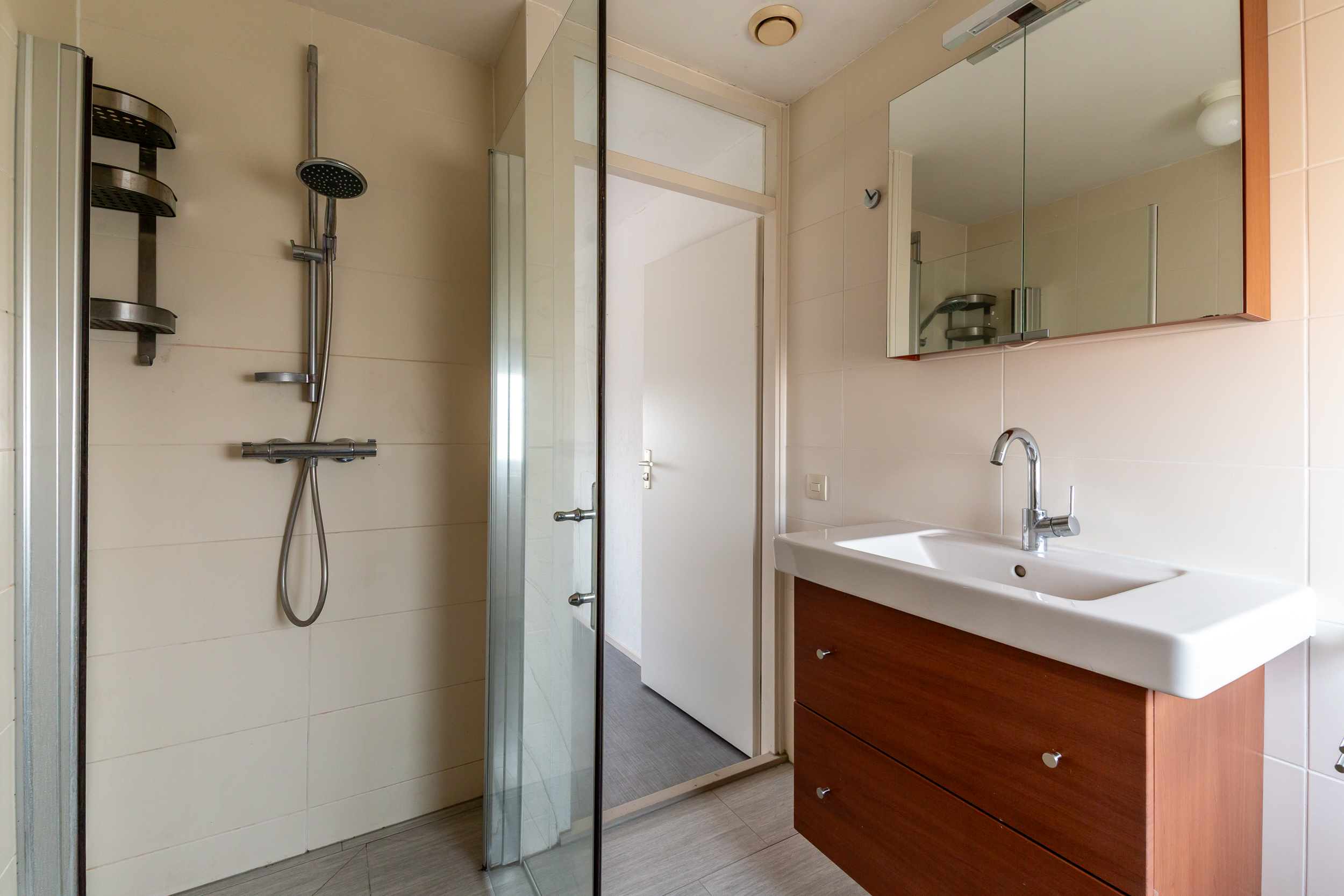 • Volledig betegelde badkamer met een douchehoek, tweede toilet en een wastafel meubel