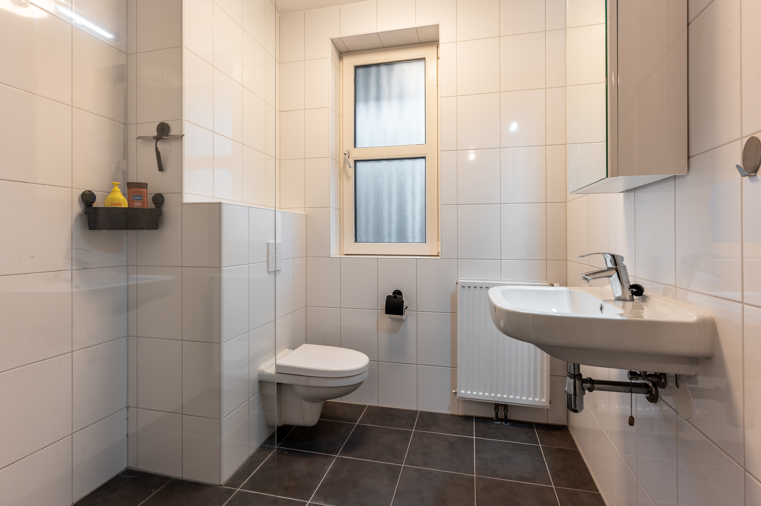 Eerste verdieping: Overloop met toegang tot drie in grote variërende slaapkamers (respectievelijk 6,7 / 10,3 en 13,8m²); in moderne kleurstelling uitgevoerde, volledig betegelde badkamer welke is voorzien van een douchehoek, 2e toilet (vrijhangend), wastafel, radiator en raam voor daglichttoetreding en natuurlijke ventilatie. De verdieping is voorzien van een keurige PVC vloer.
