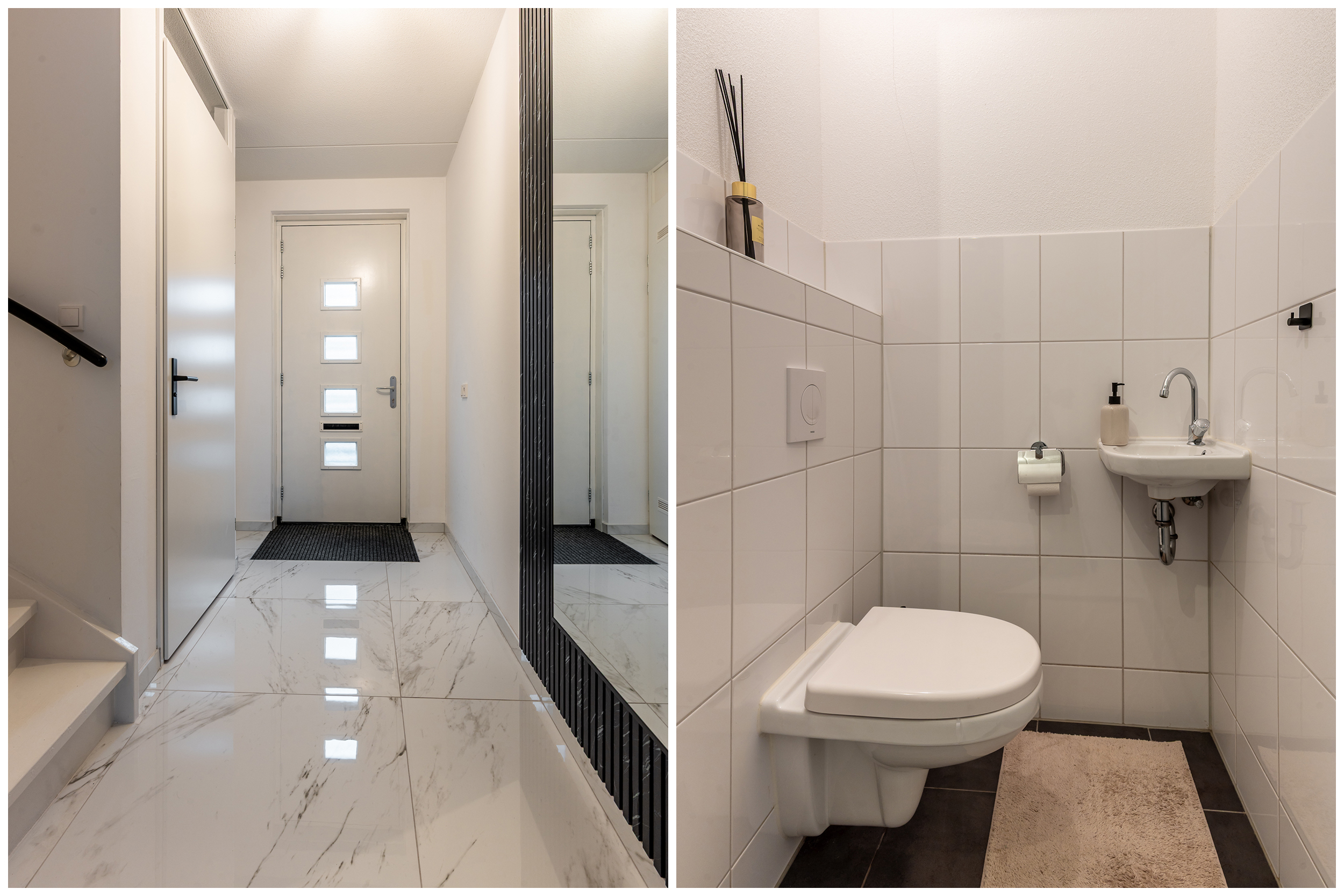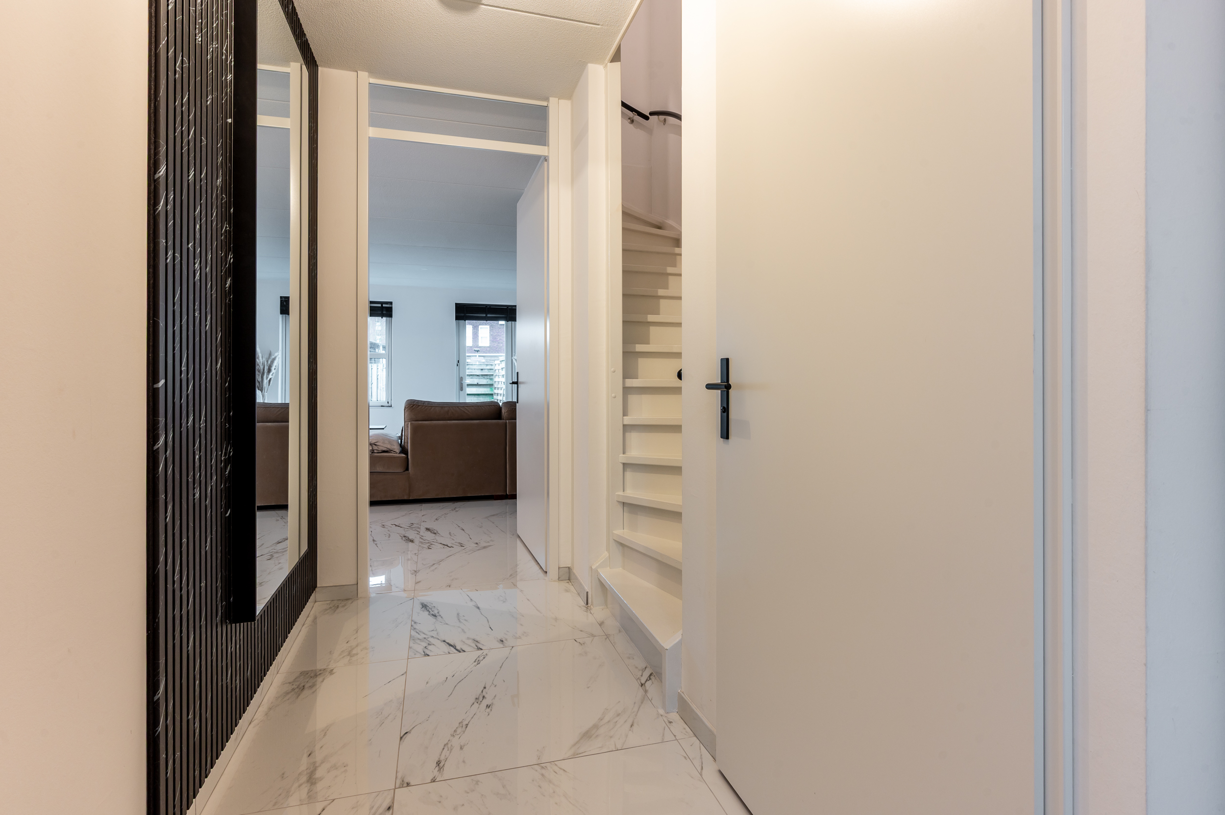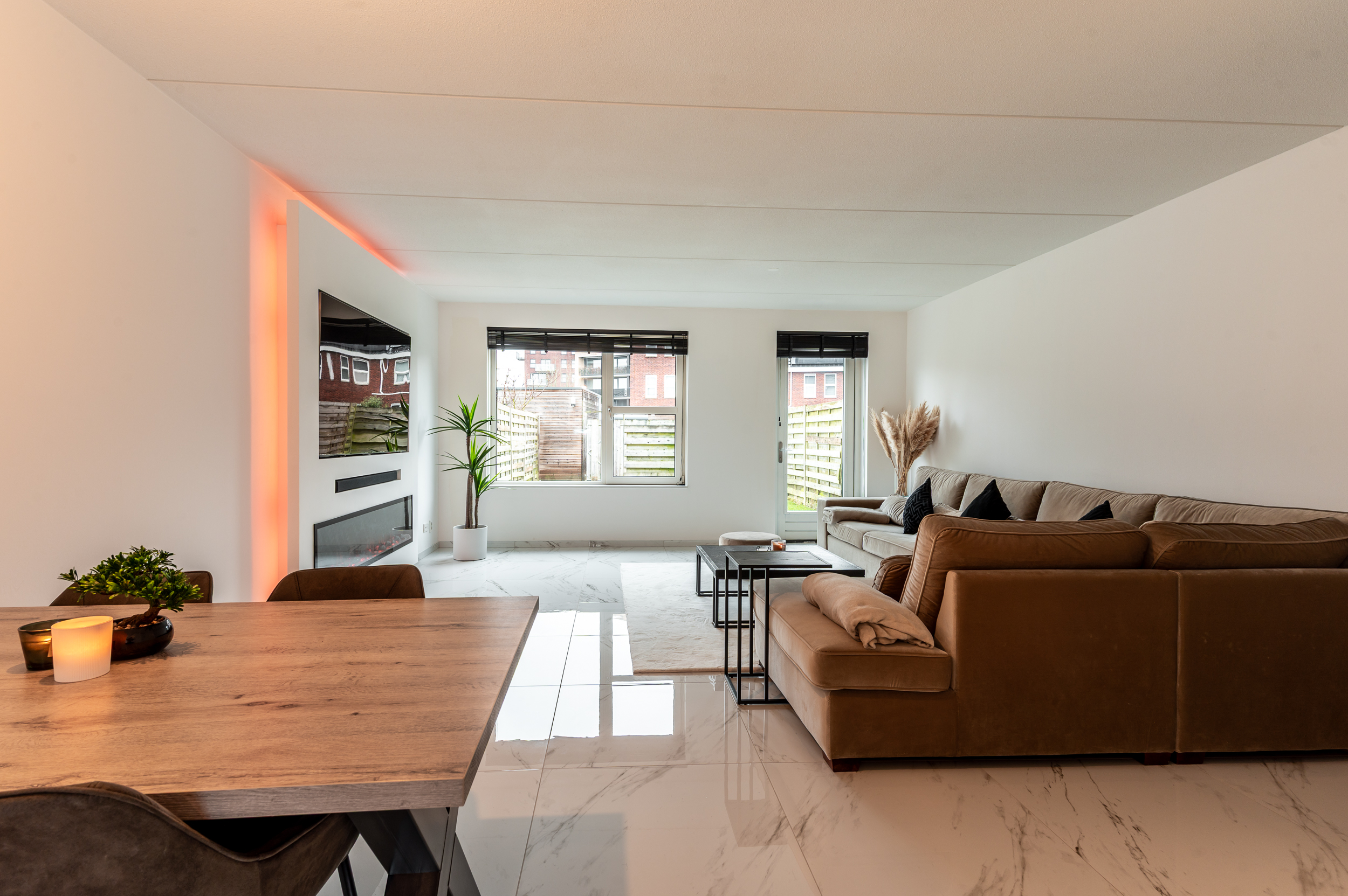Begane grond: Entree, hal, vrijhangend toilet met fonteintje, meterkast, trapopgang naar de verdieping; vergrootte tuingerichte woonkamer met trapkast en een cinewall met elektrische haard; aan de straatzijde bevindt zich de moderne inbouwkeuken in L-opstelling, welke voorzien is van de volgende inbouwapparatuur: volledig geïntegreerde vaatwasser, koel/vriescombinatie, combi magnetron, 4 pits gas kookplaat en een RVS afzuigschouw. De begane grond is voorzien van een chique (marmerdesign) plavuizen vloer met vloerverwarming.