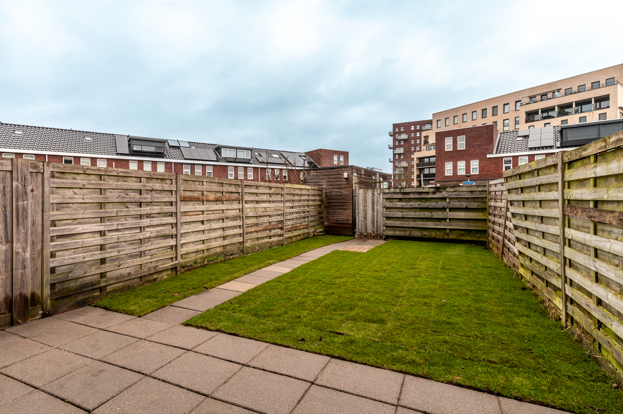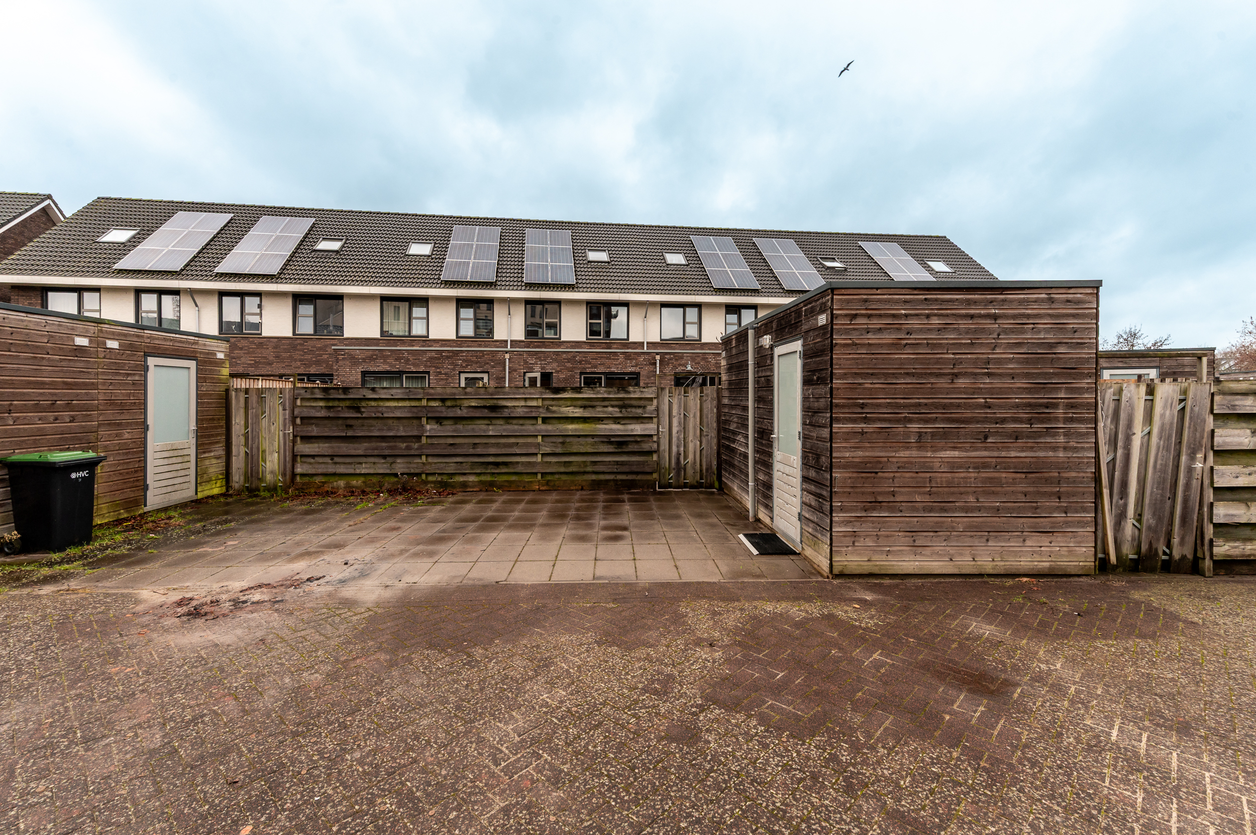 Tuin:De achtertuin is gelegen op het oosten en voorzien van bestrating, een gazon, vrijstaande houten berging, erfafscheiding en parkeergelegenheid op eigen terrein.