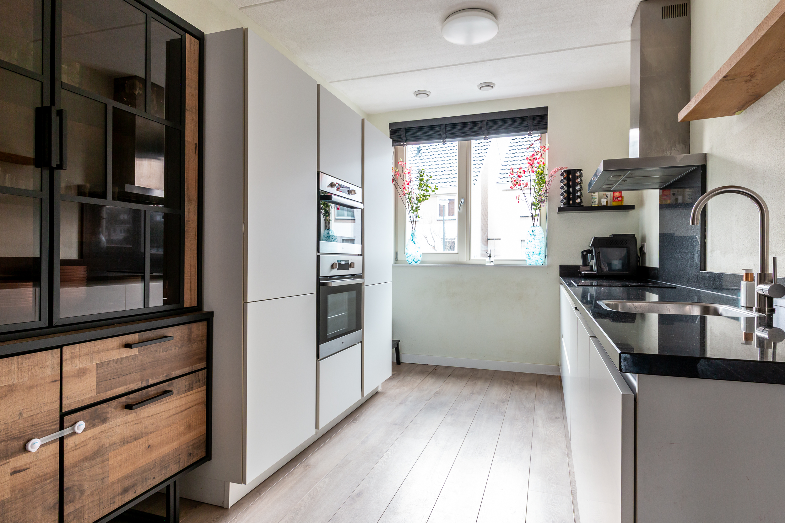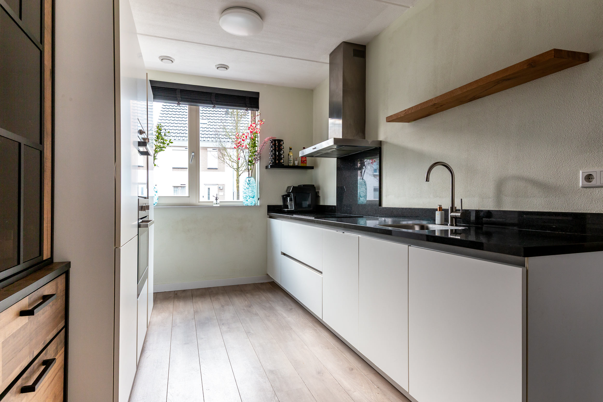 Begane grond: Entree; hal met meterkast, betegeld en vrijhangend toilet met fonteintje; tuingerichte en uitgebouwde woonkamer van ruim 35m² met openslaande deuren welke toegang geven tot de tuin; straatgerichte open keuken in dubbele rechte opstelling welke is uitgevoerd in hoogglans witte kleurstelling, beschikt over een natuurstenen werkblad en is voorzien van ondermeer een RVS afzuigschouw, 4-pits inductiekookplaat, volledig geïntegreerde vaatwasser, koelkast, ladenvriezer, oven, combimagnetron en kastruimte.