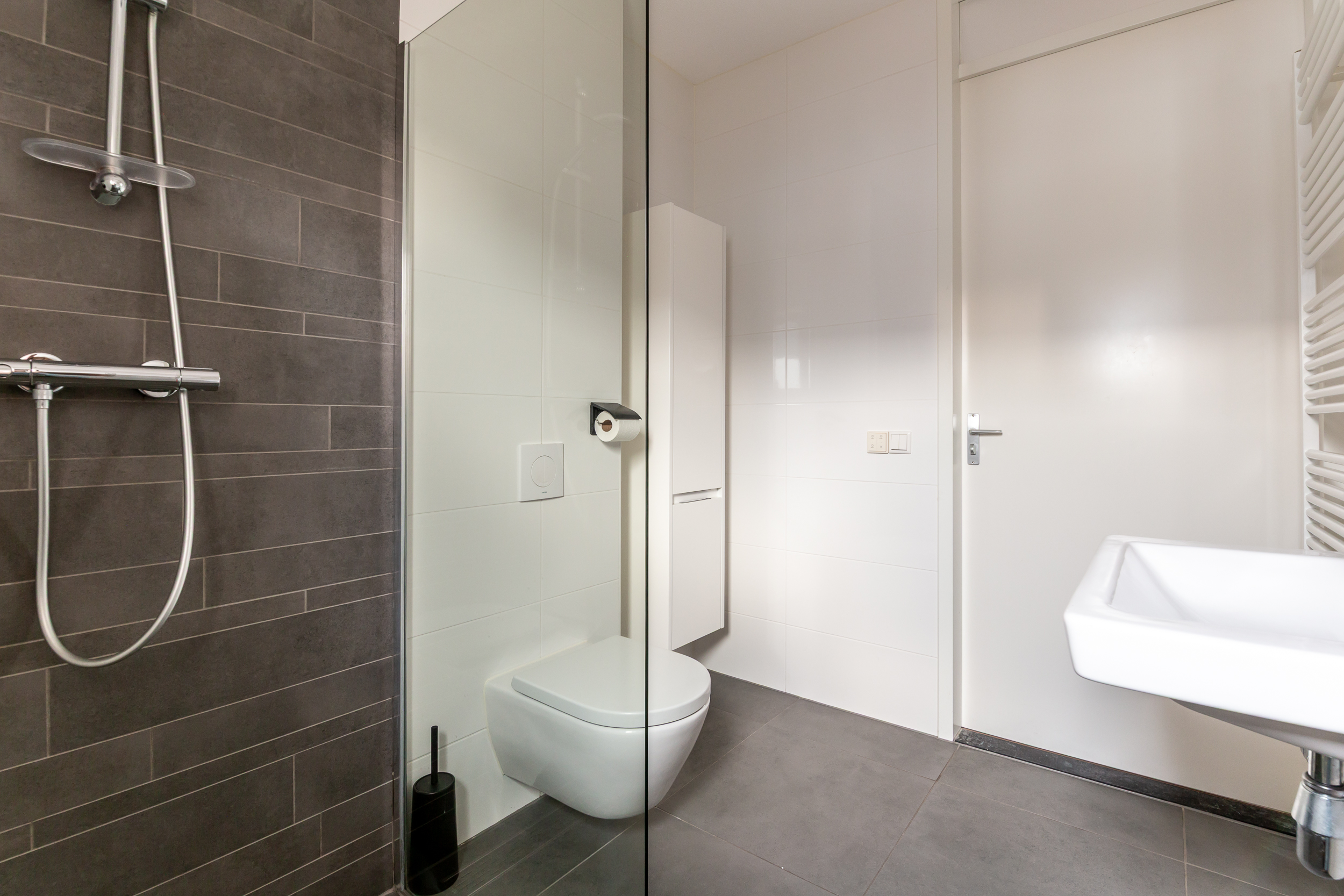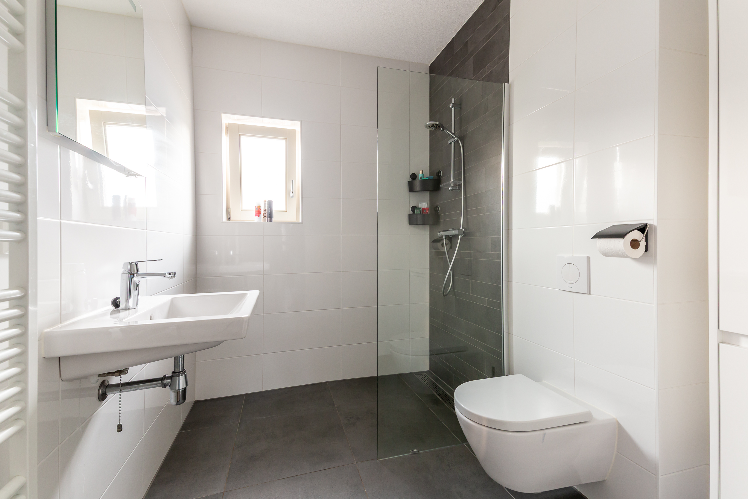 Eerste verdieping: Overloop; drie slaapkamers van respectievelijk 5,2-, 10,1- en 12,5m²; volledig betegelde badkamer welke is uitgevoerd in moderne kleurstelling en voorzien van een inloopdouche, een tweede (eveneens vrijhangend) toilet, designradiator, vloerverwarming en een wastafel.