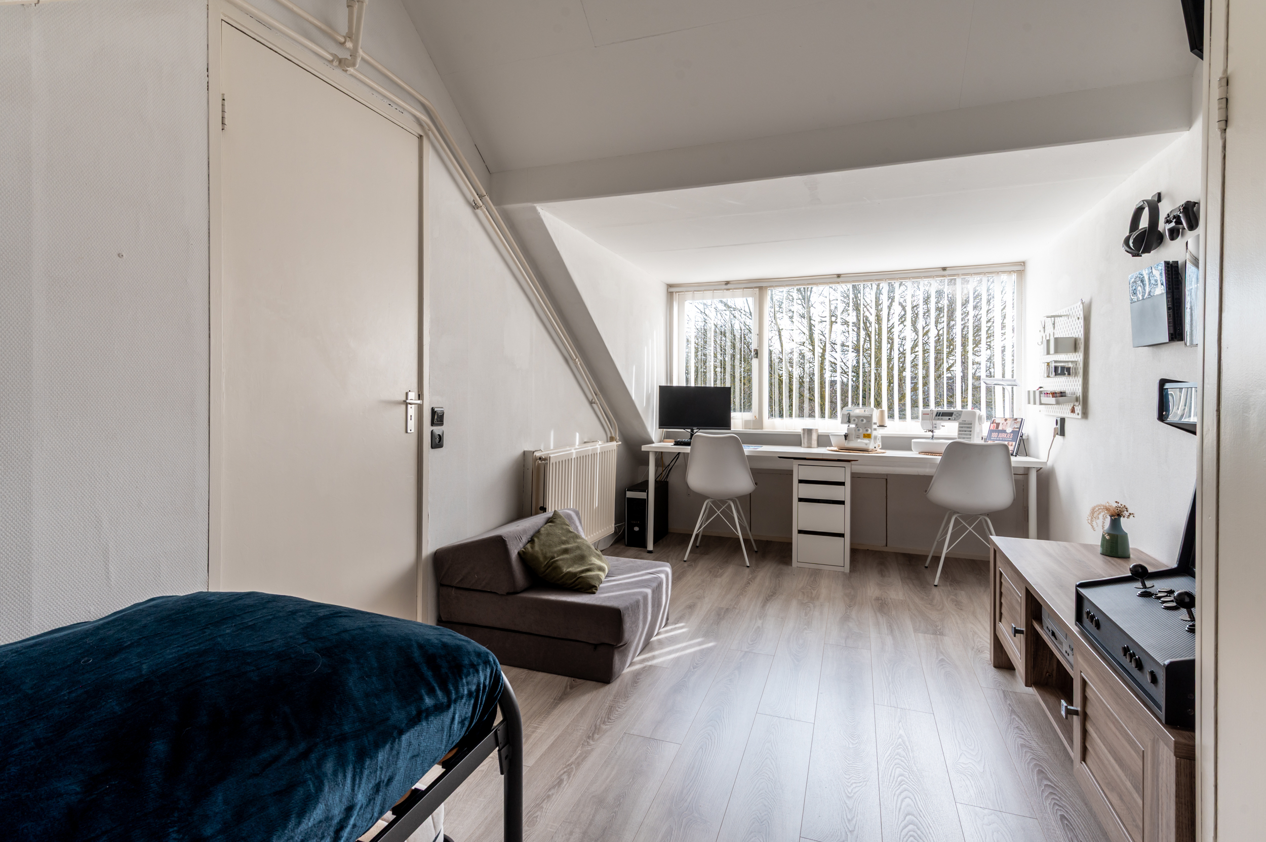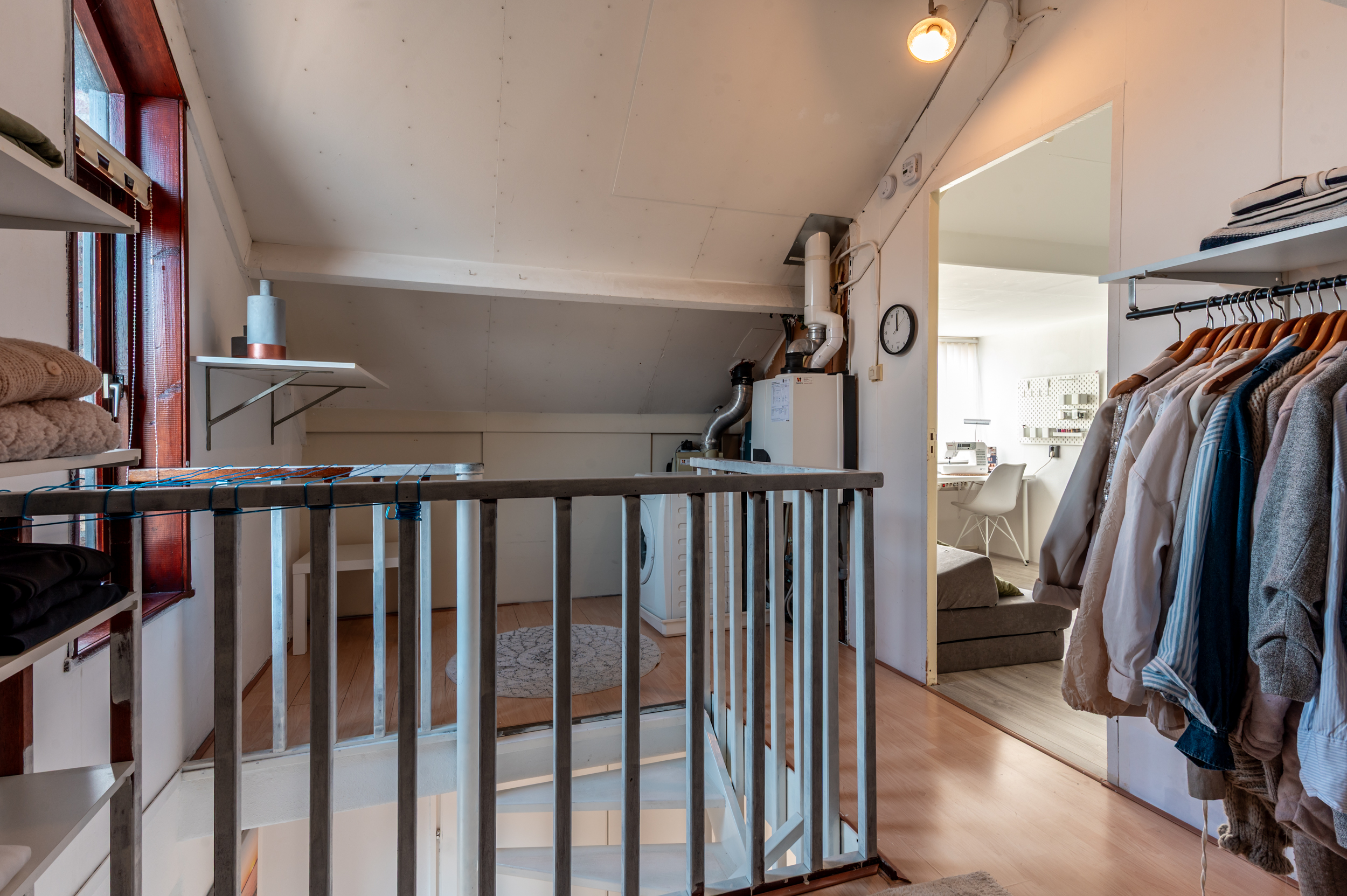 Tweede verdieping: Voorzolder met de CV (ATAG hr-combi uit 2015), de witgoedaansluitingen en flink wat bergruimte; een vierde slaapkamer van bijna 14m² met een vaste kast en een dakkapel.