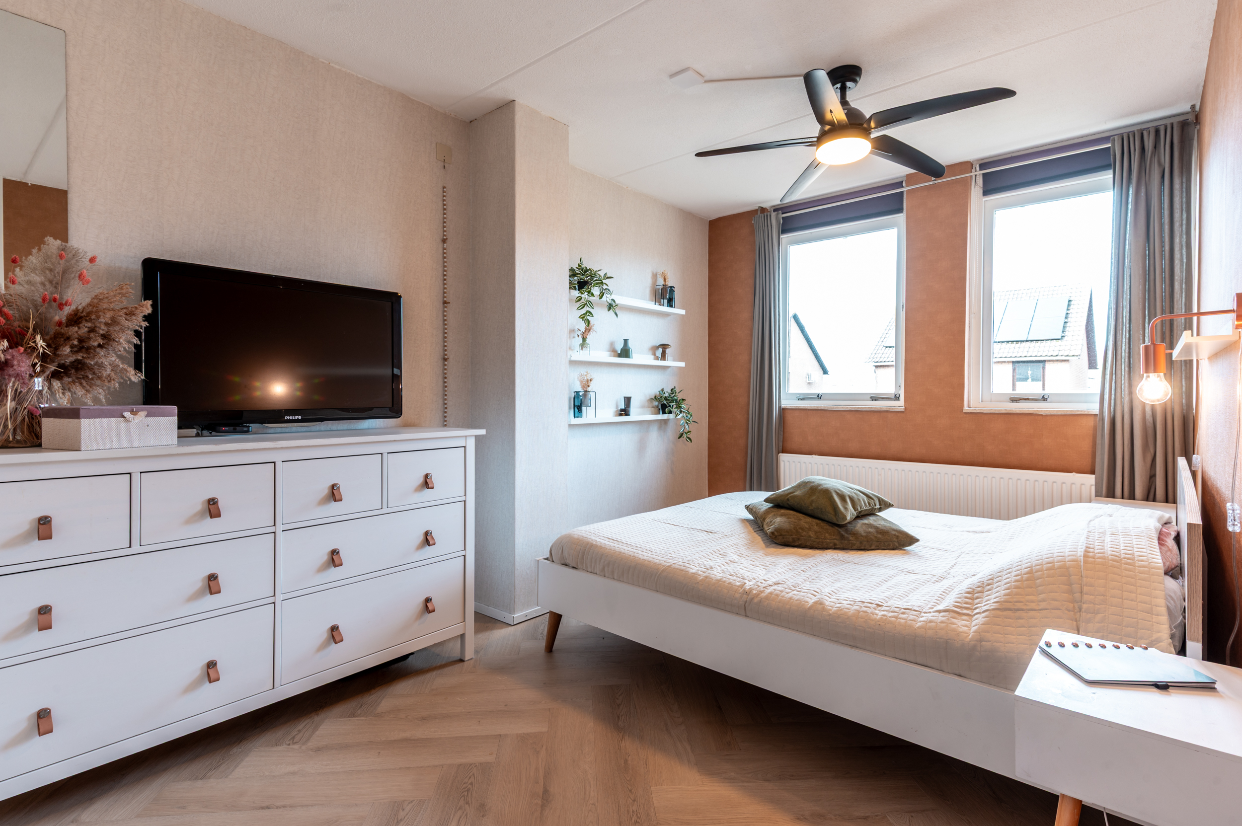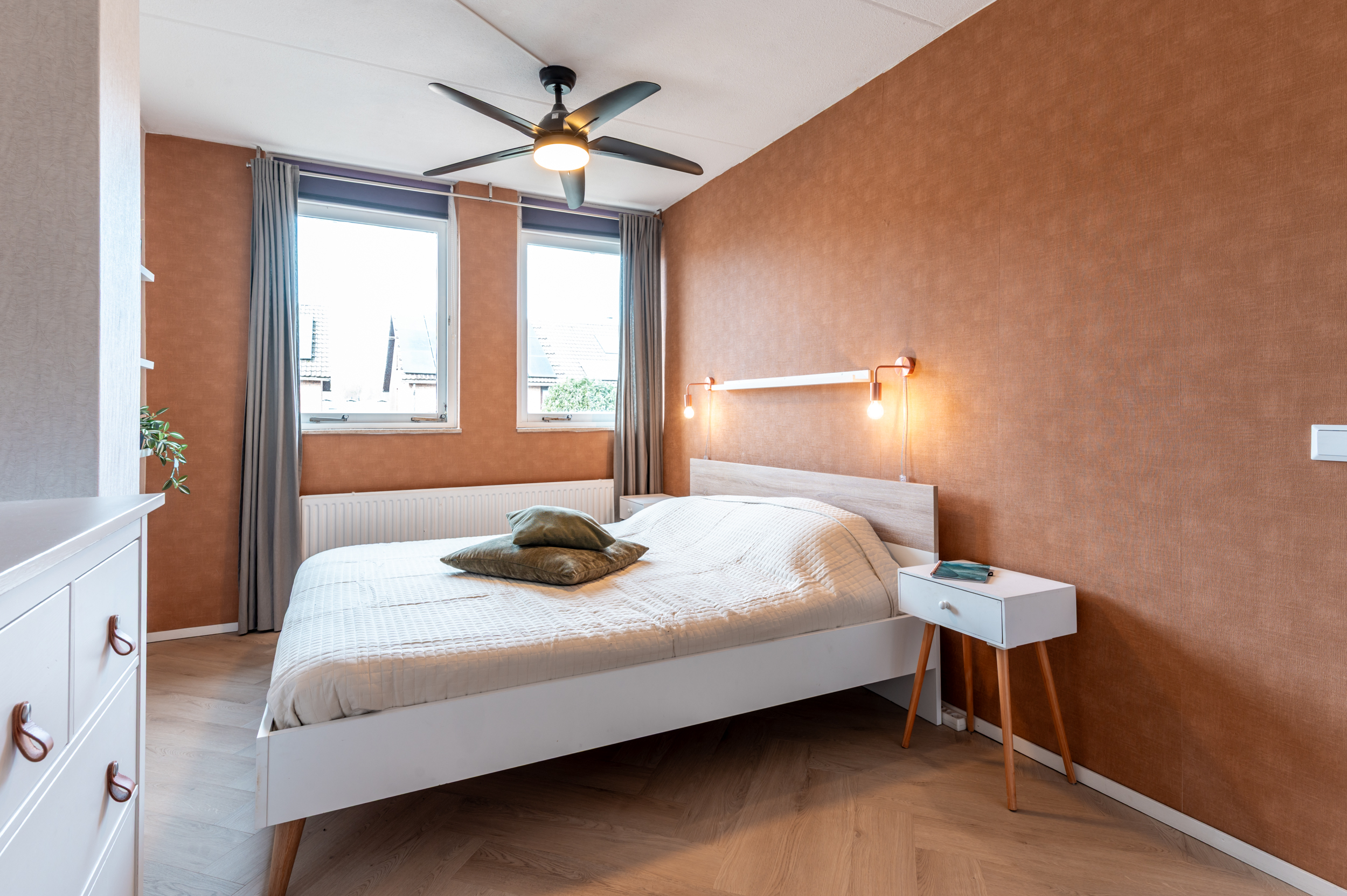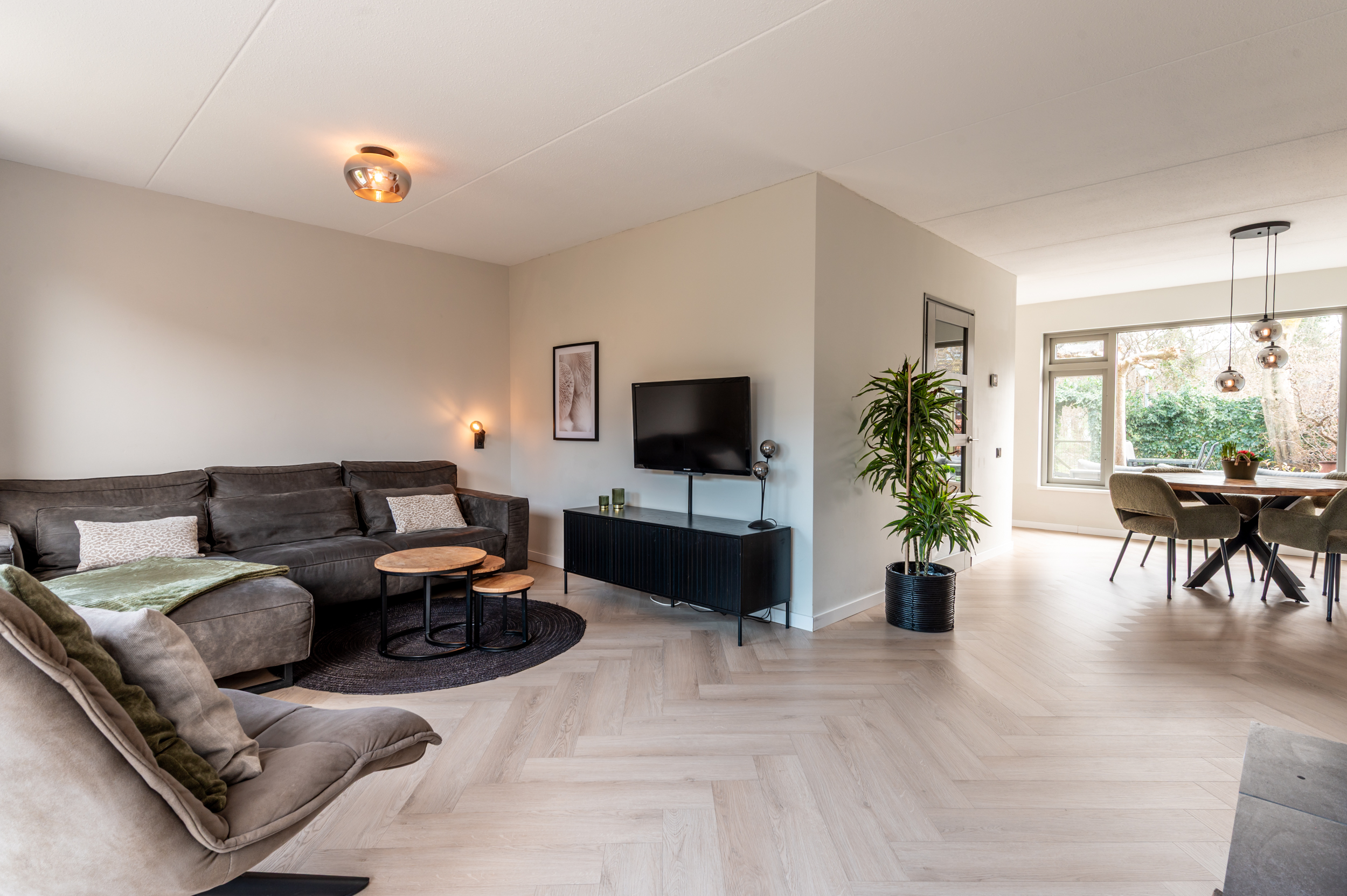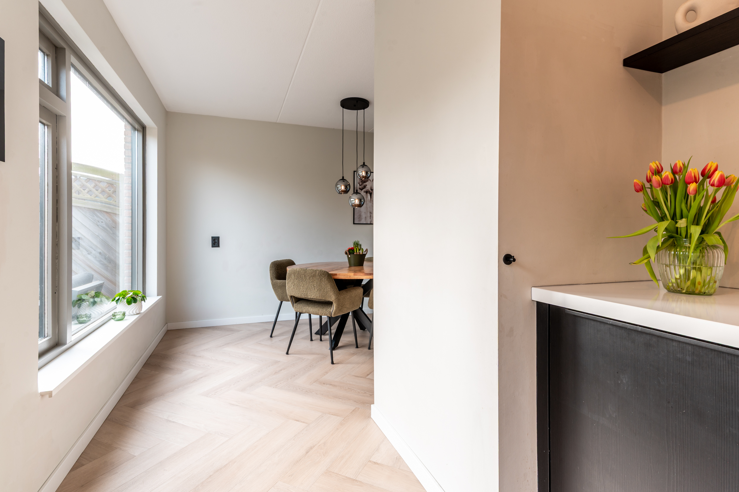 De begane grond is voorzien van een visgraat PVC vloer met vloerverwarming en glad gestuukte wanden