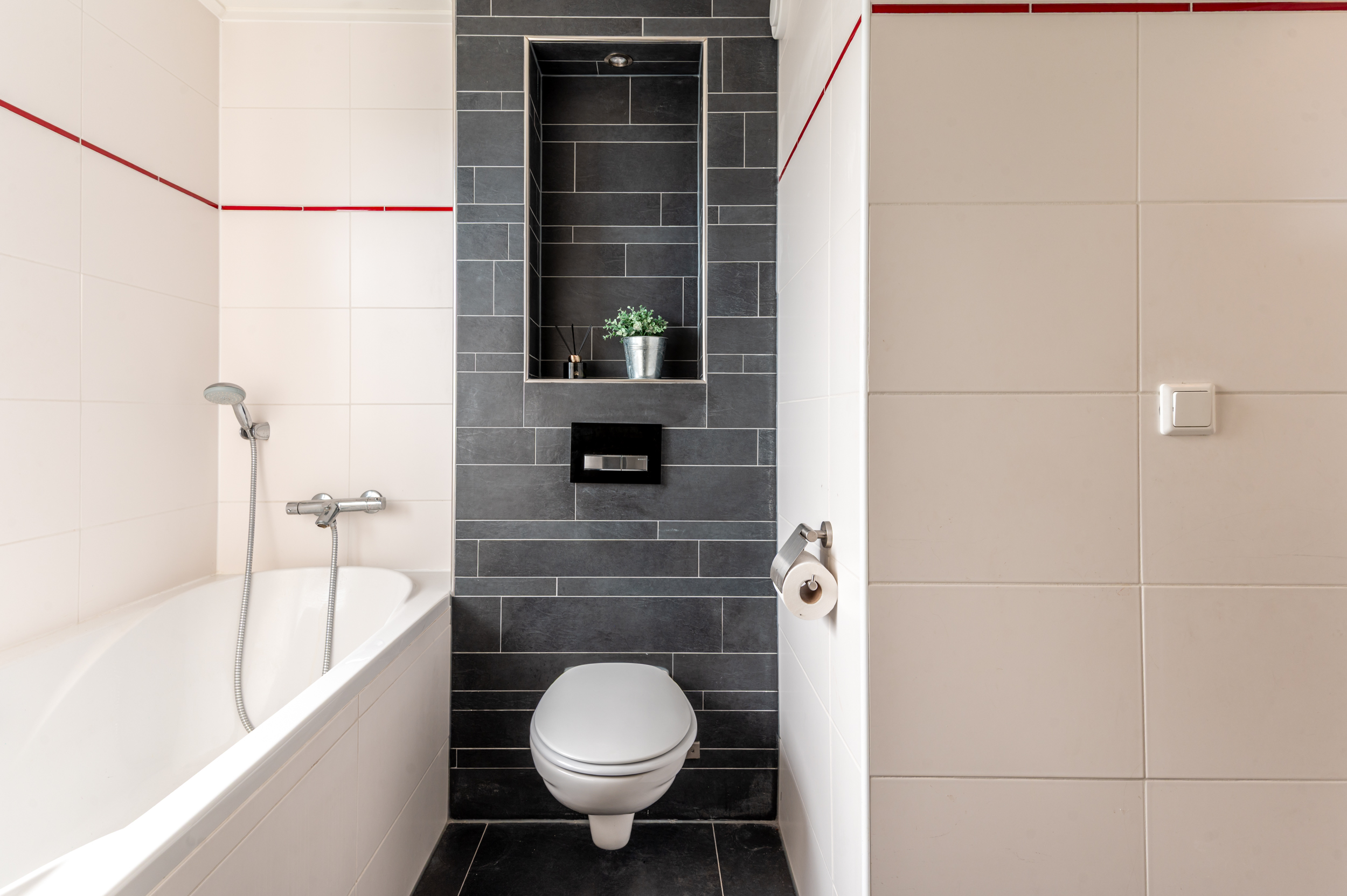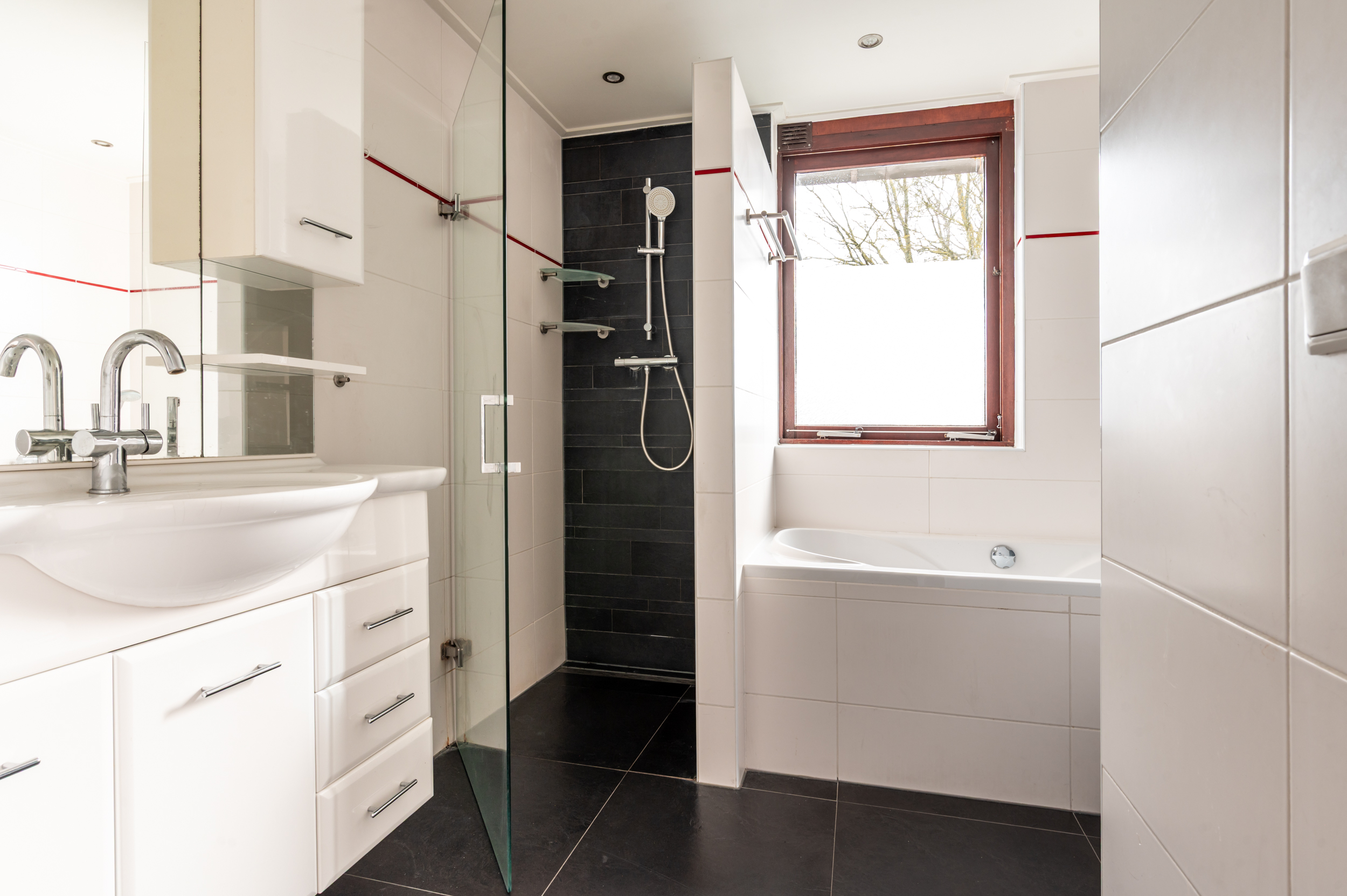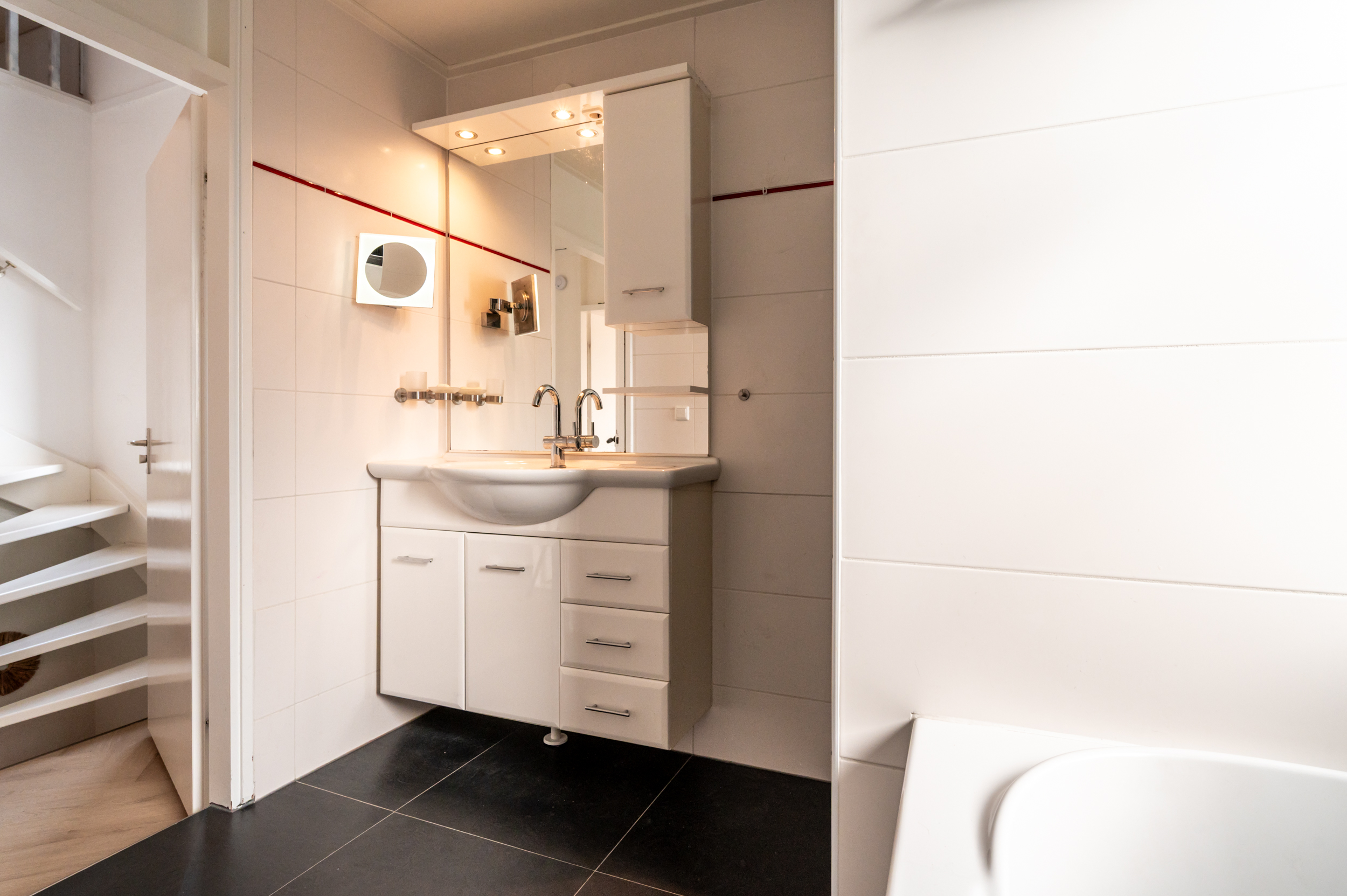 Eerste verdieping: Overloop met bergkast; drie flinke slaapkamers van respectievelijk 9,6-, 10,6- en 13,1m²; keurige en volledig betegelde badkamer (vervangen in 2012) welke is voorzien van volledige betegeling, een ligbad, douche, tweede (eveneens hangend) toilet en een wastafelmeubel.