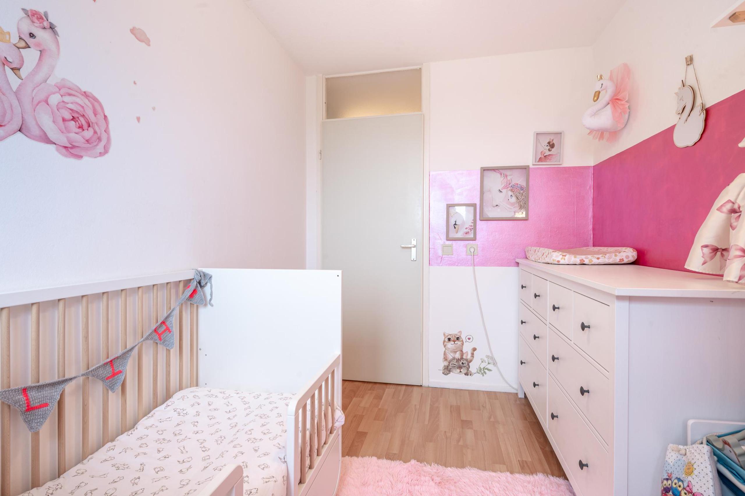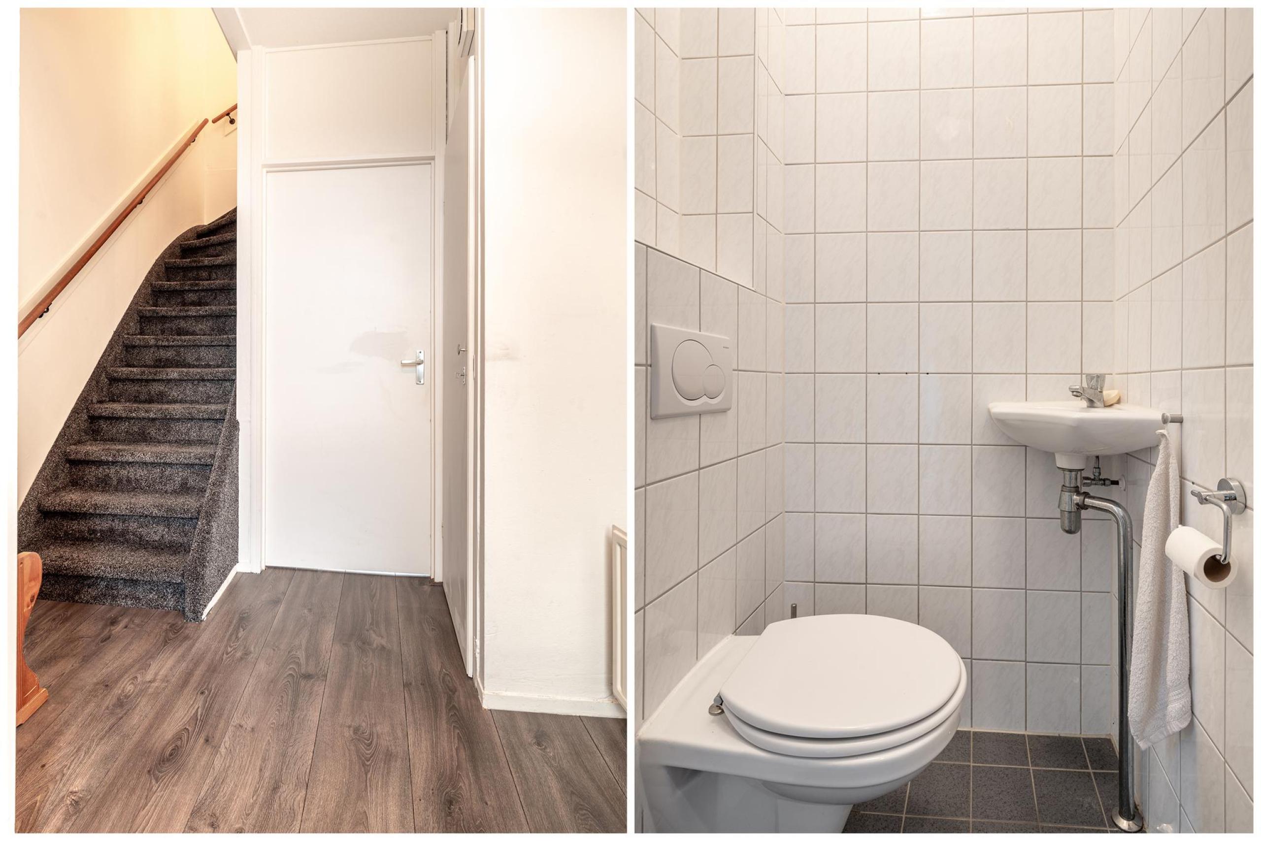 Eerste verdieping: Overloop; drie slaapkamers van respectievelijk 7,0-, 10,0- en 12,5m²; volledig, in lichte kleurstelling betegelde badkamer welke is voorzien van een wastafelmeubel, tweede toilet (vrijhangend), een ligbad en een raam voor daglichttoetreding en natuurlijke ventilatie.