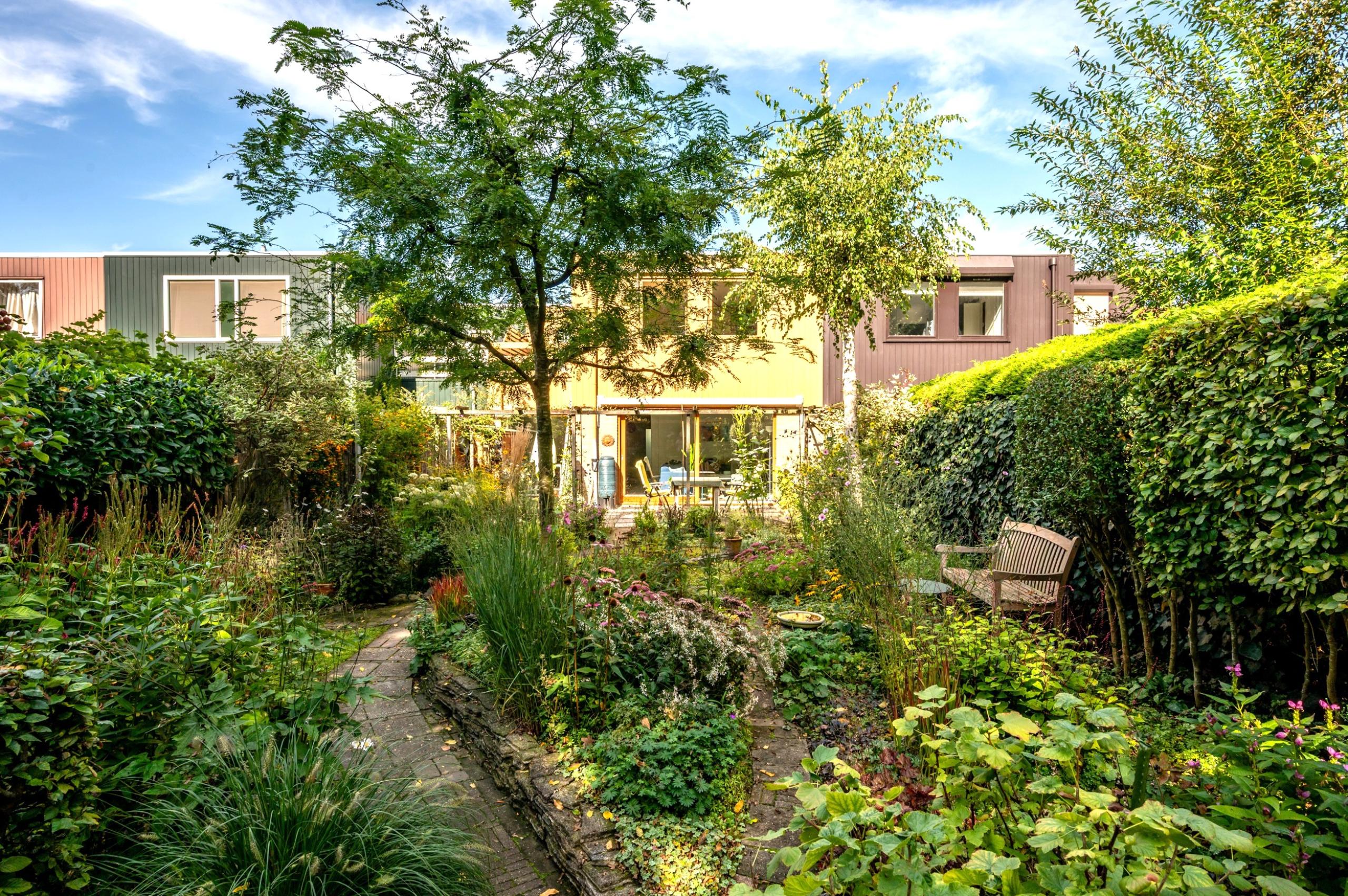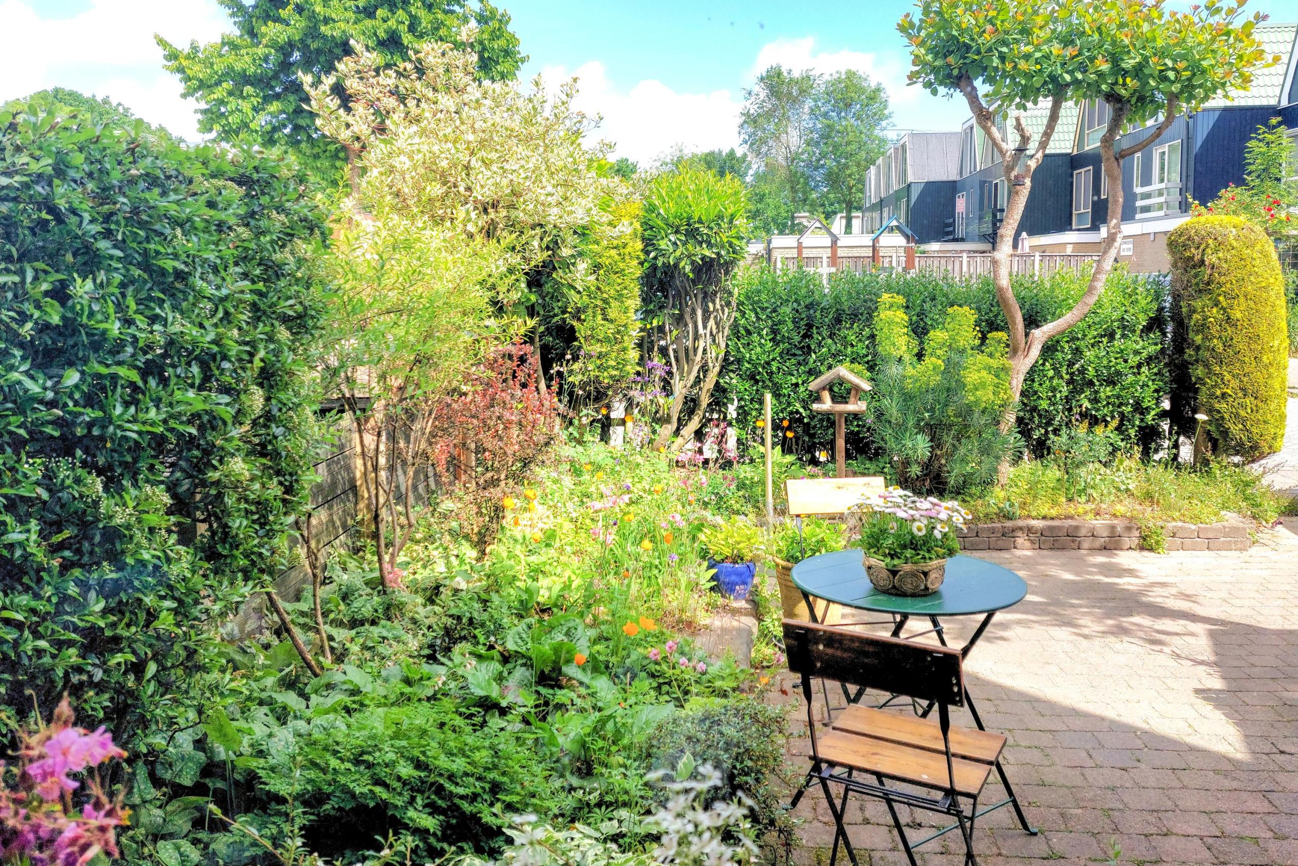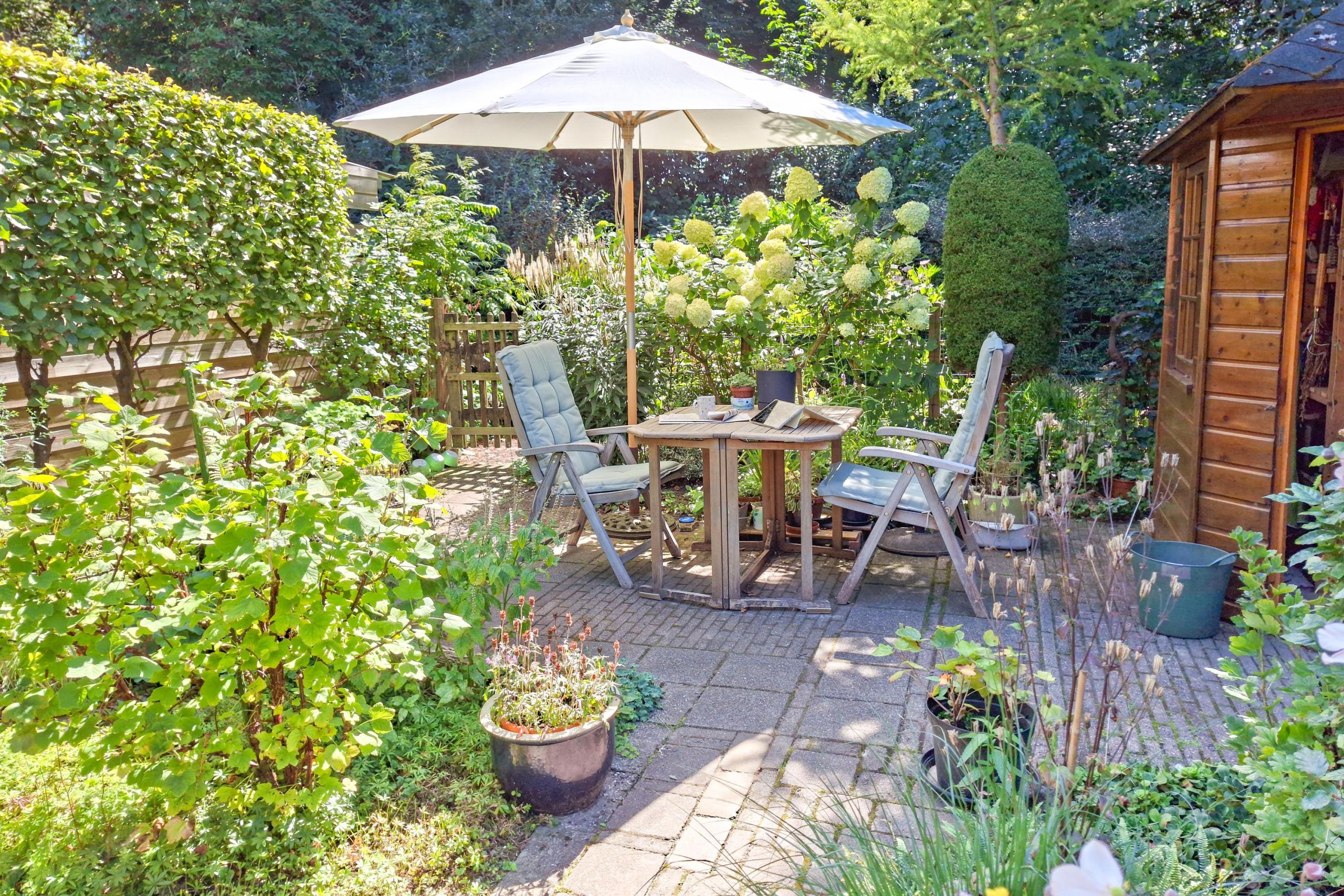 Tuin: De prachtig aangelegde, op het zuiden georiënteerde tuin heeft een afmeting van ongeveer 8 meter breed bij x maar liefst 20 meter diep, welke is voorzien van een ruim terras bij de woning. Naast een grote diversiteit aan fraaie en bijzondere beplanting is de tuin tevens voorzien van een tuinkast, een schuur en een tweede terras. De voortuin is eveneens mooi aangelegd en naast parkeergelegenheid op eigen terrein ook voorzien van fraaie, privacy biedende beplanting.