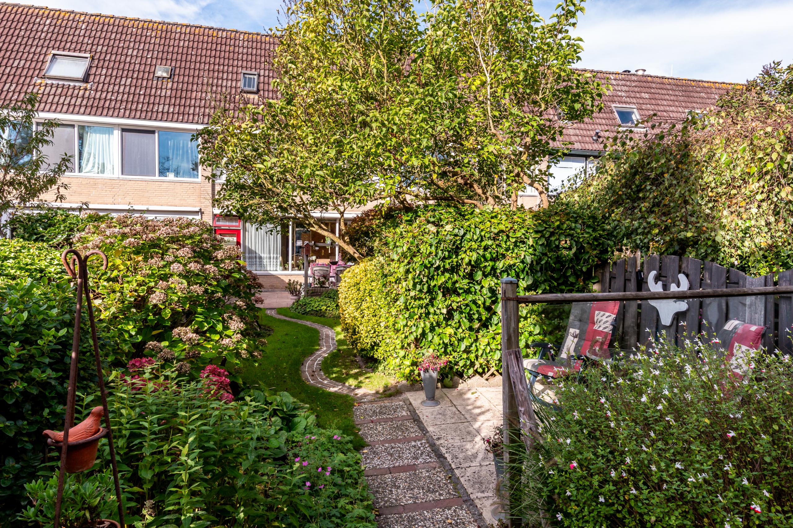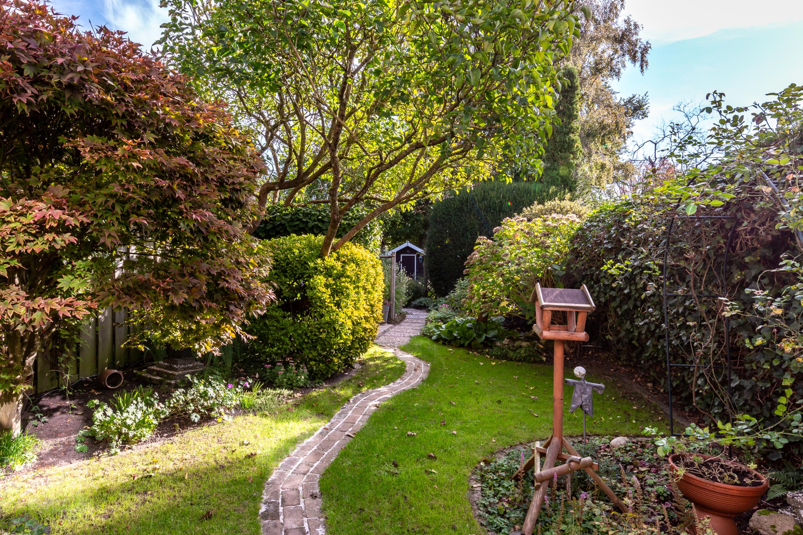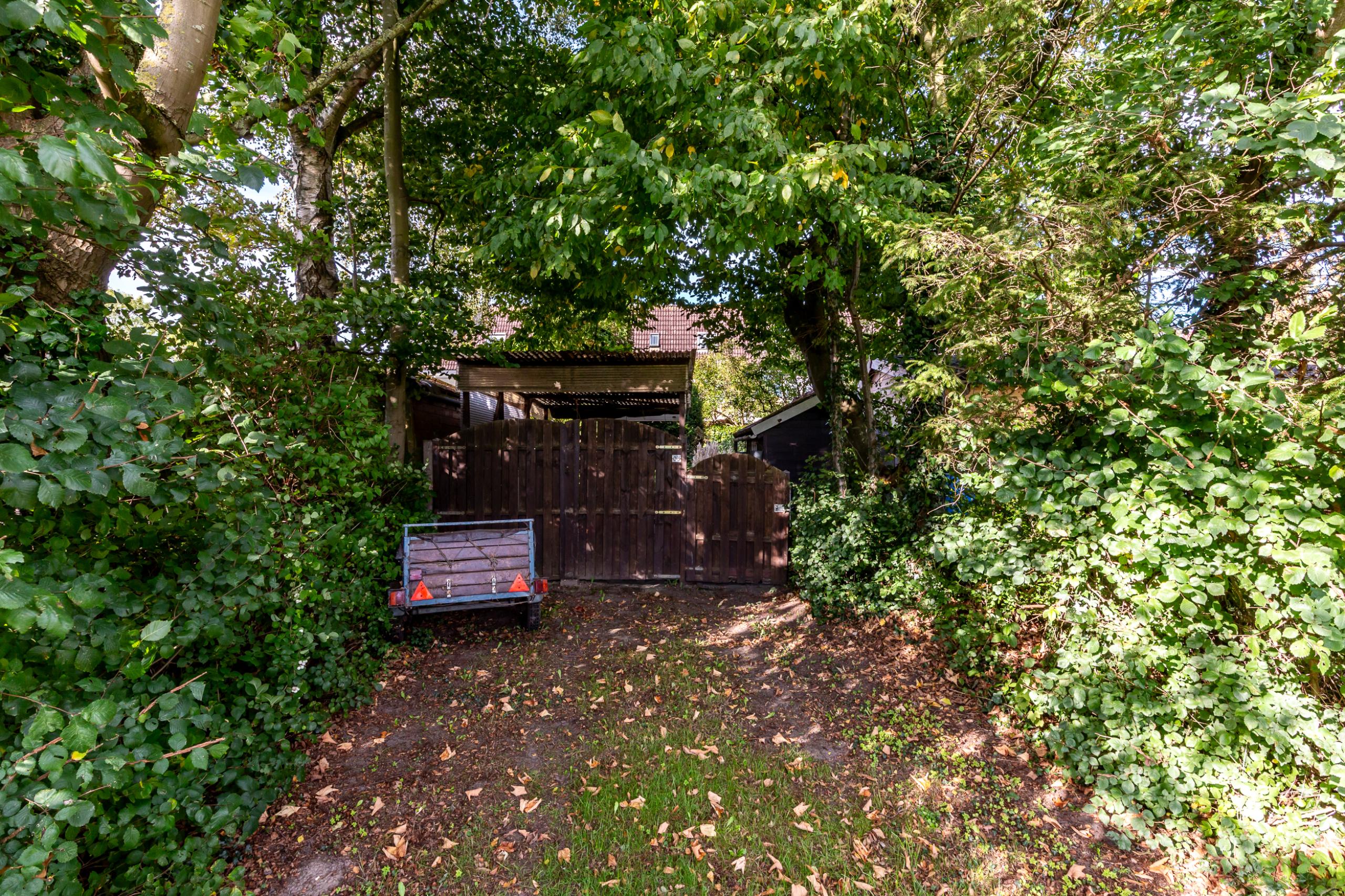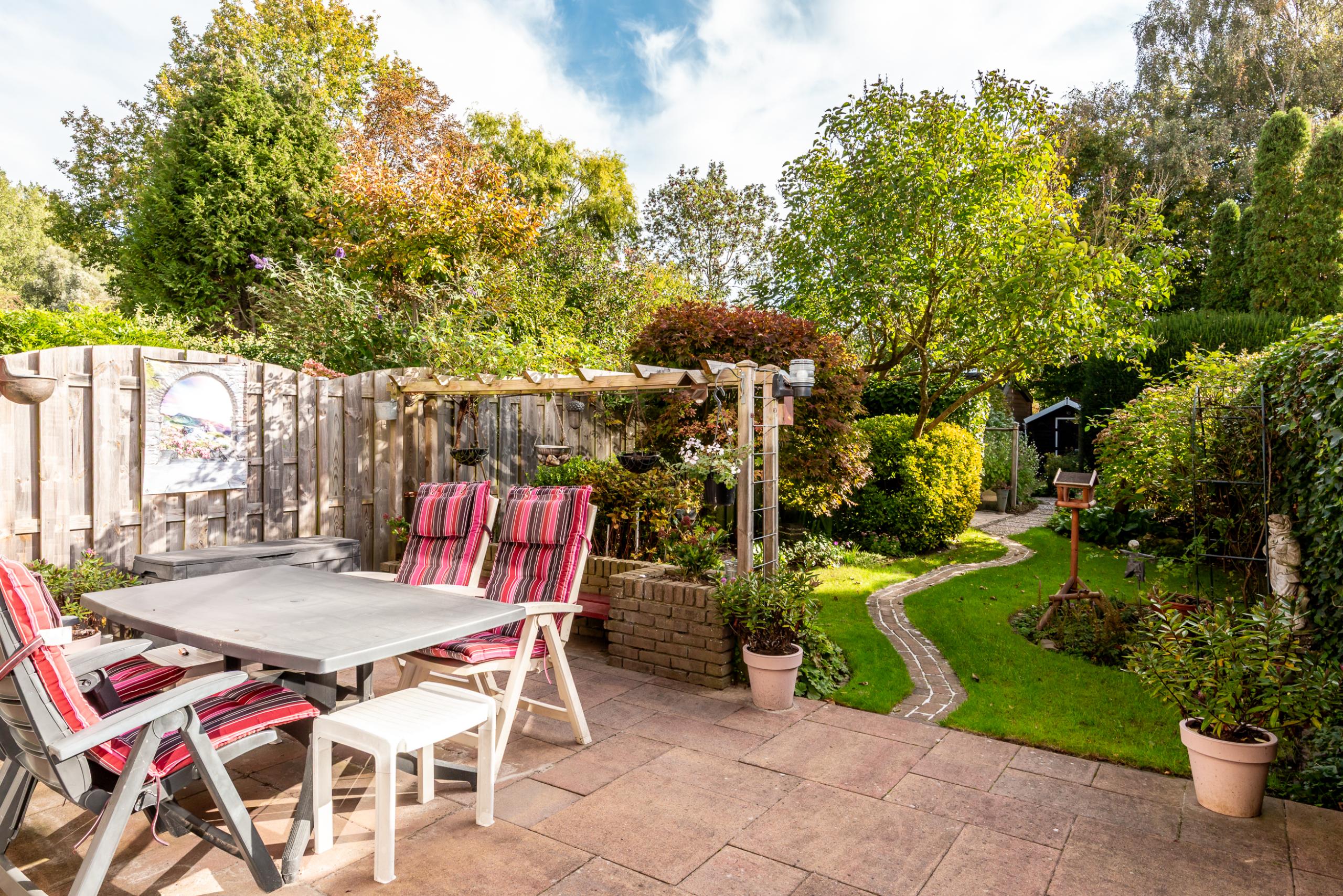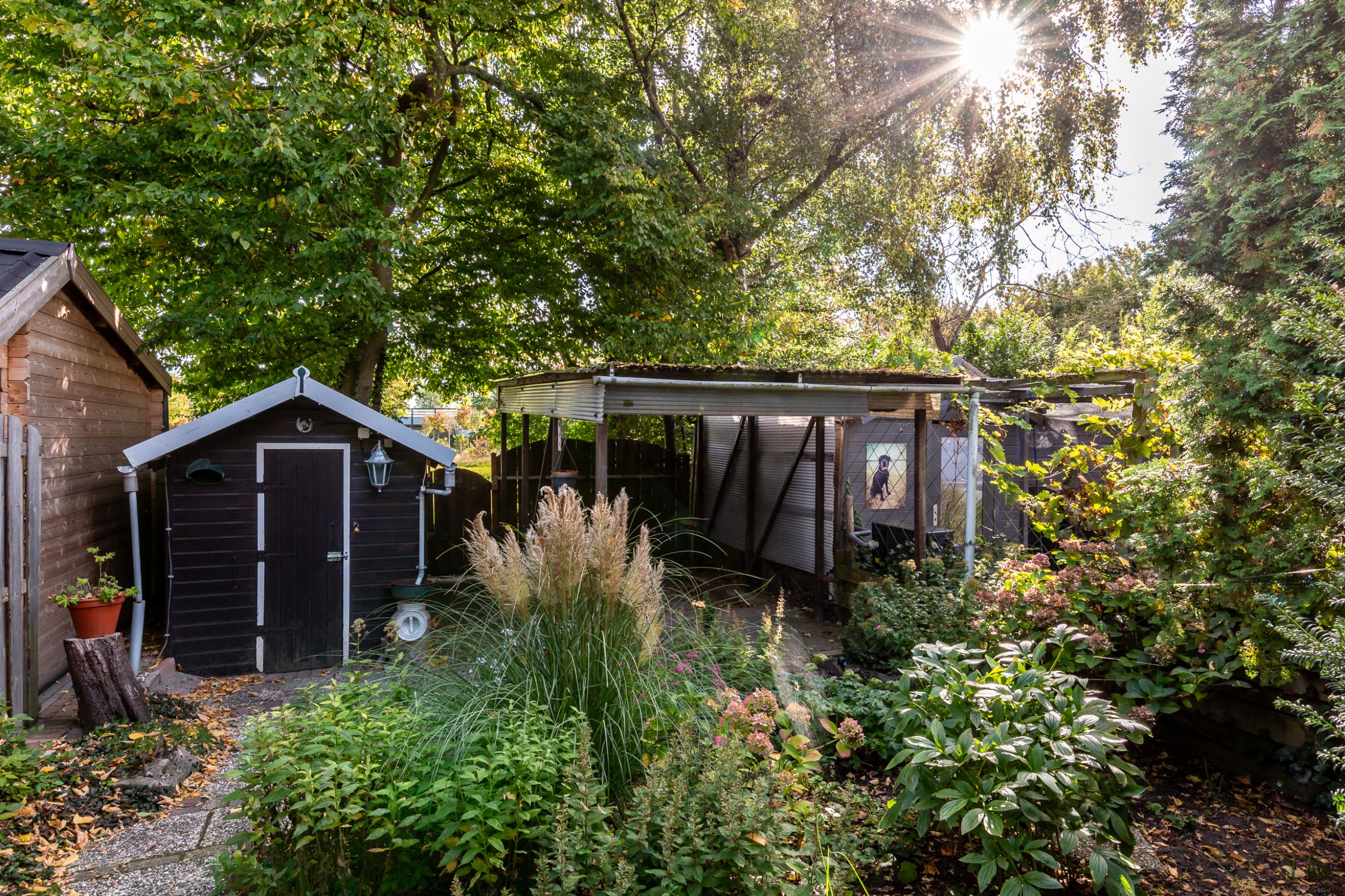Tuin: Een aan openbaar groen gelegen, op het oosten gesitueerde en maar liefst 28!! meter diepe achtertuin. De tuin is voorzien van meerdere terrassen voor eigenlijk altijd een plekje in de zon of schaduw, maar met name veel (volwassen) beplanting en een berging en "carport" achterin. Aan de voorkant van de woning is er parkeergelegenheid op eigen terrein.