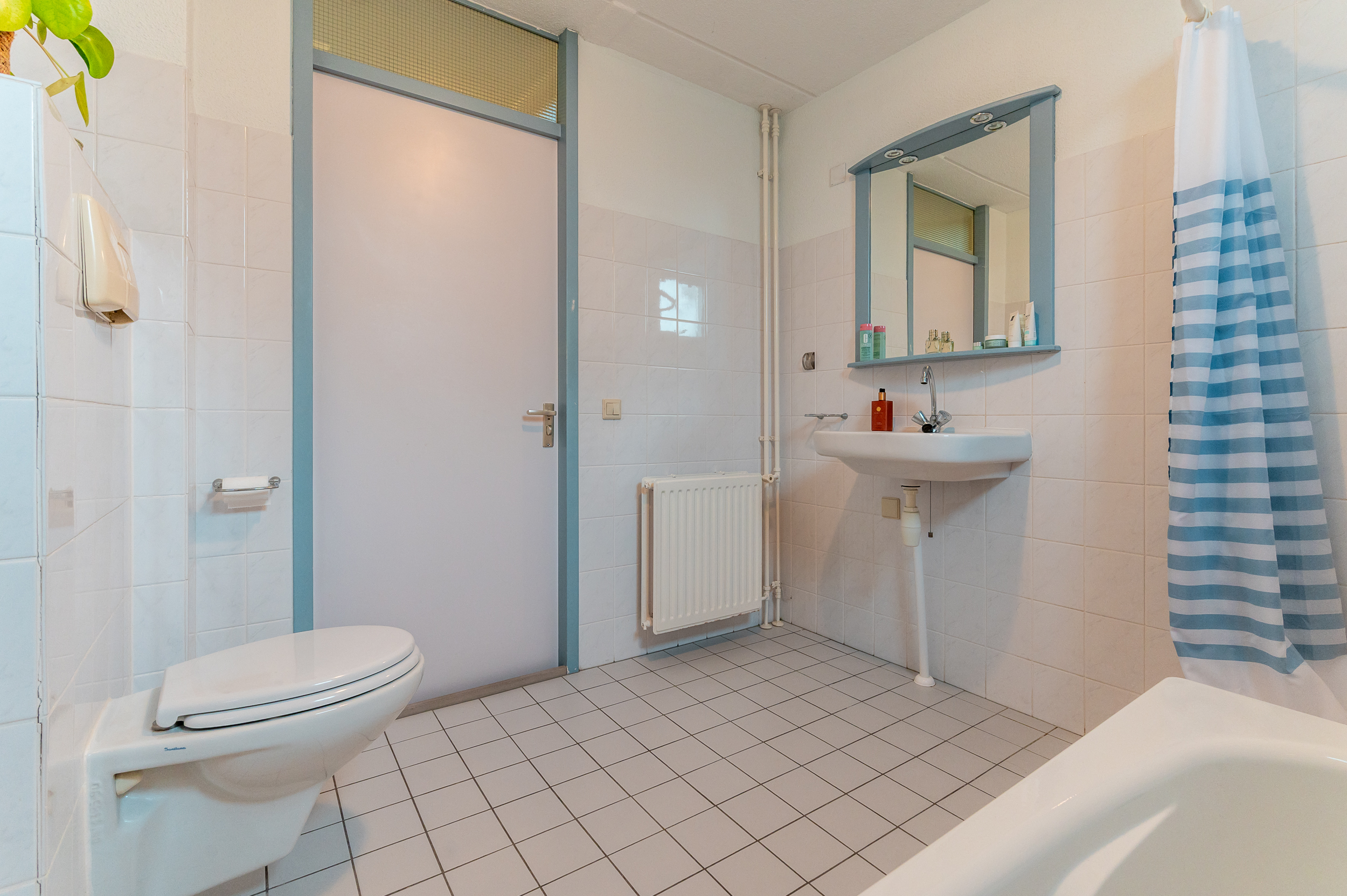 Eerste verdieping: Overloop; twee (voormalig drie) slaapkamers (respectievelijk 10,2m² en 19,7m²); gedeeltelijk betegelde badkamer welke is voorzien van een separate douchehoek, vrijhangend toilet, ligbad, een wastafel alsmede een raam voor natuurlijke ventilatie en daglichttoetreding.