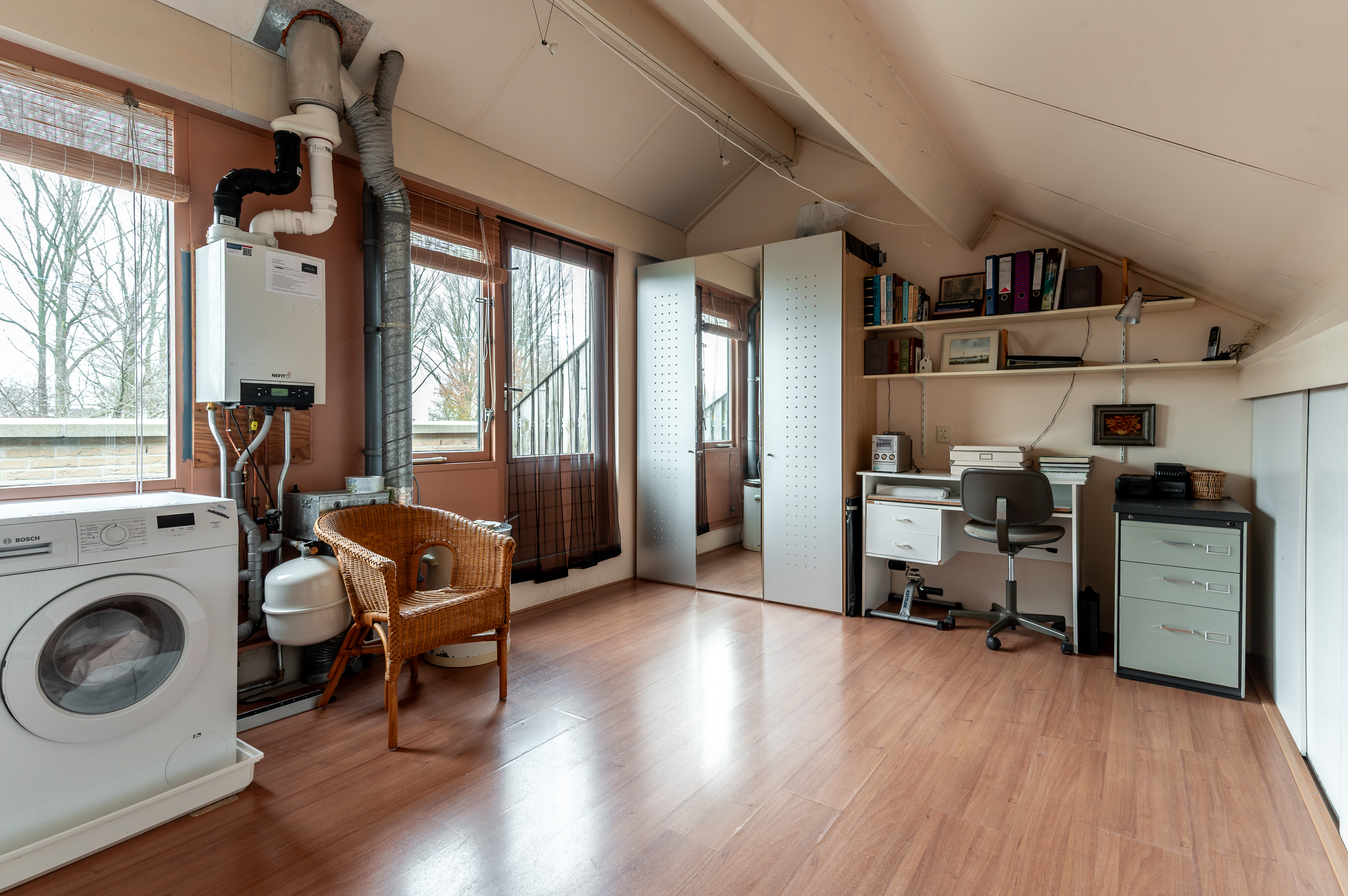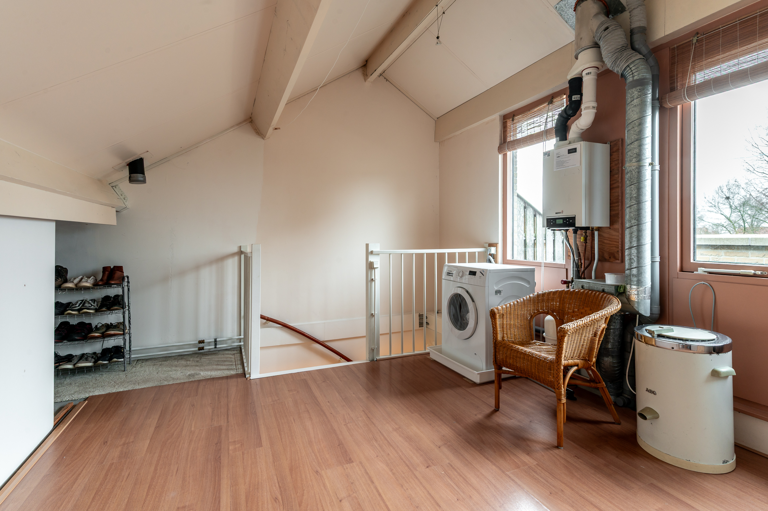 Tweede verdieping: Ruime zolderverdieping (16,5 m²) met toegang tot het dakterras; wasmachine aansluiting en de opstelling van de c.v. ketel; de zolder kan worden gebruikt als vierde slaapkamer of werkplek.