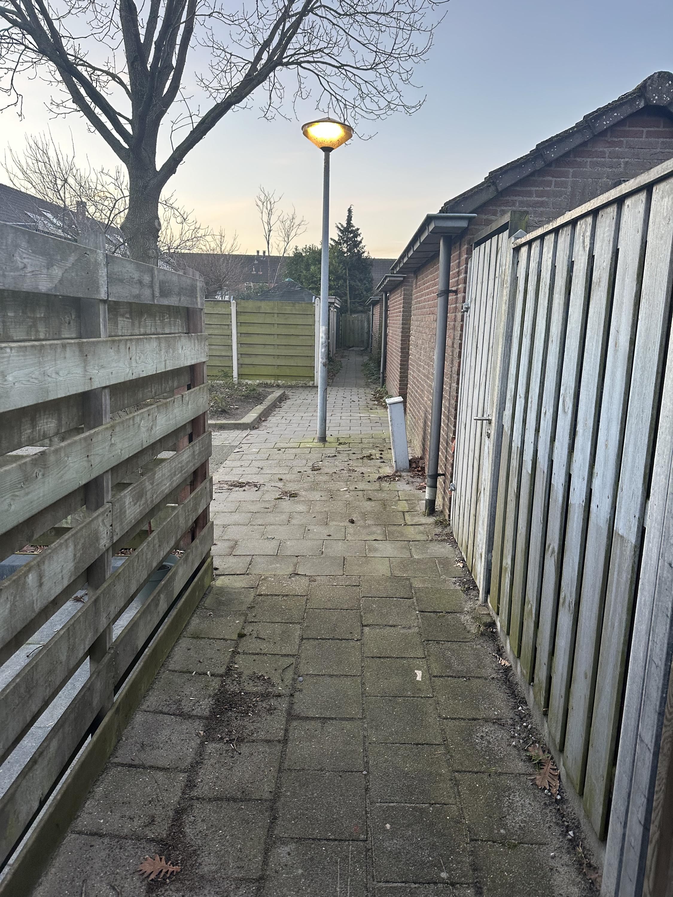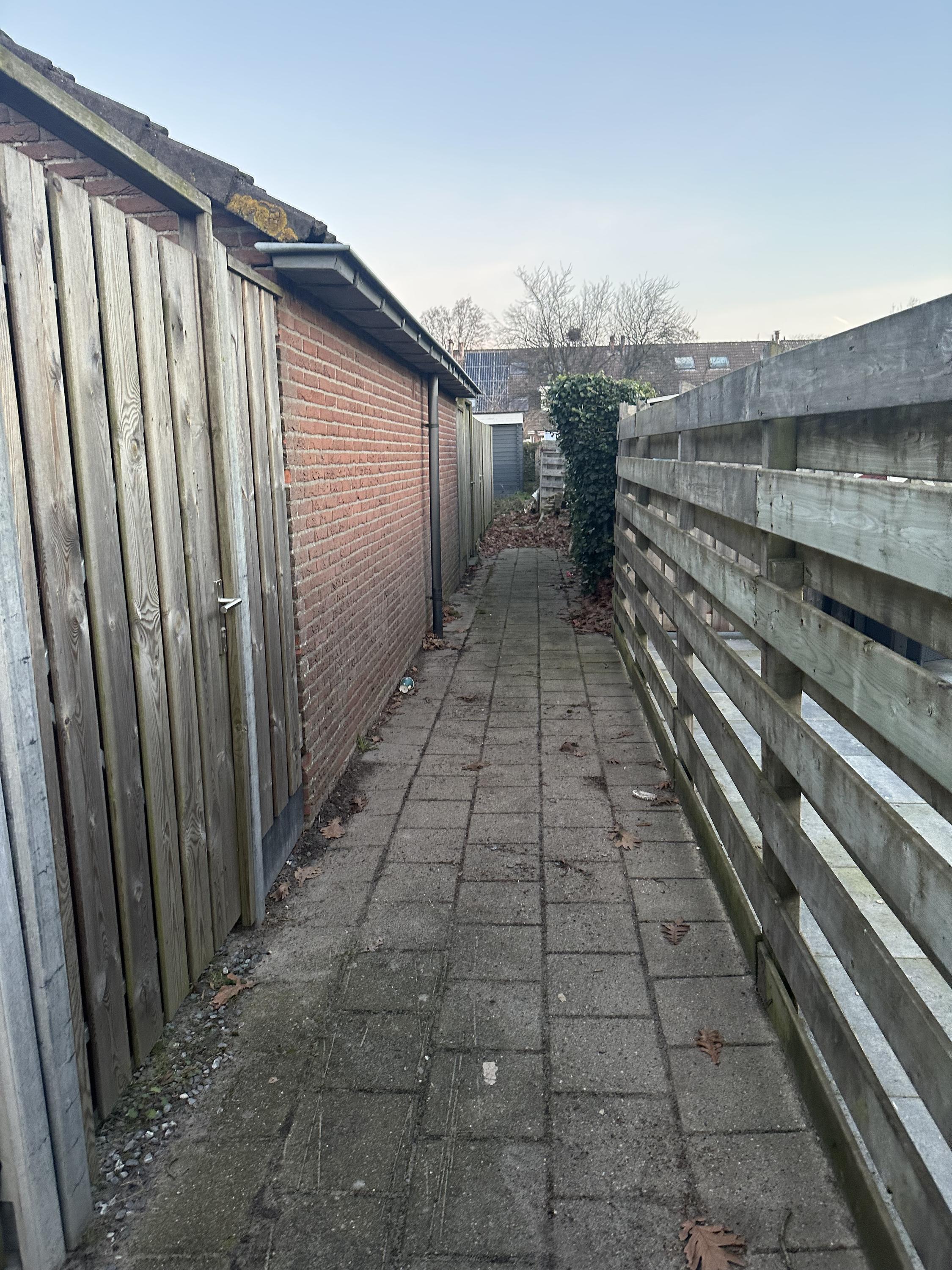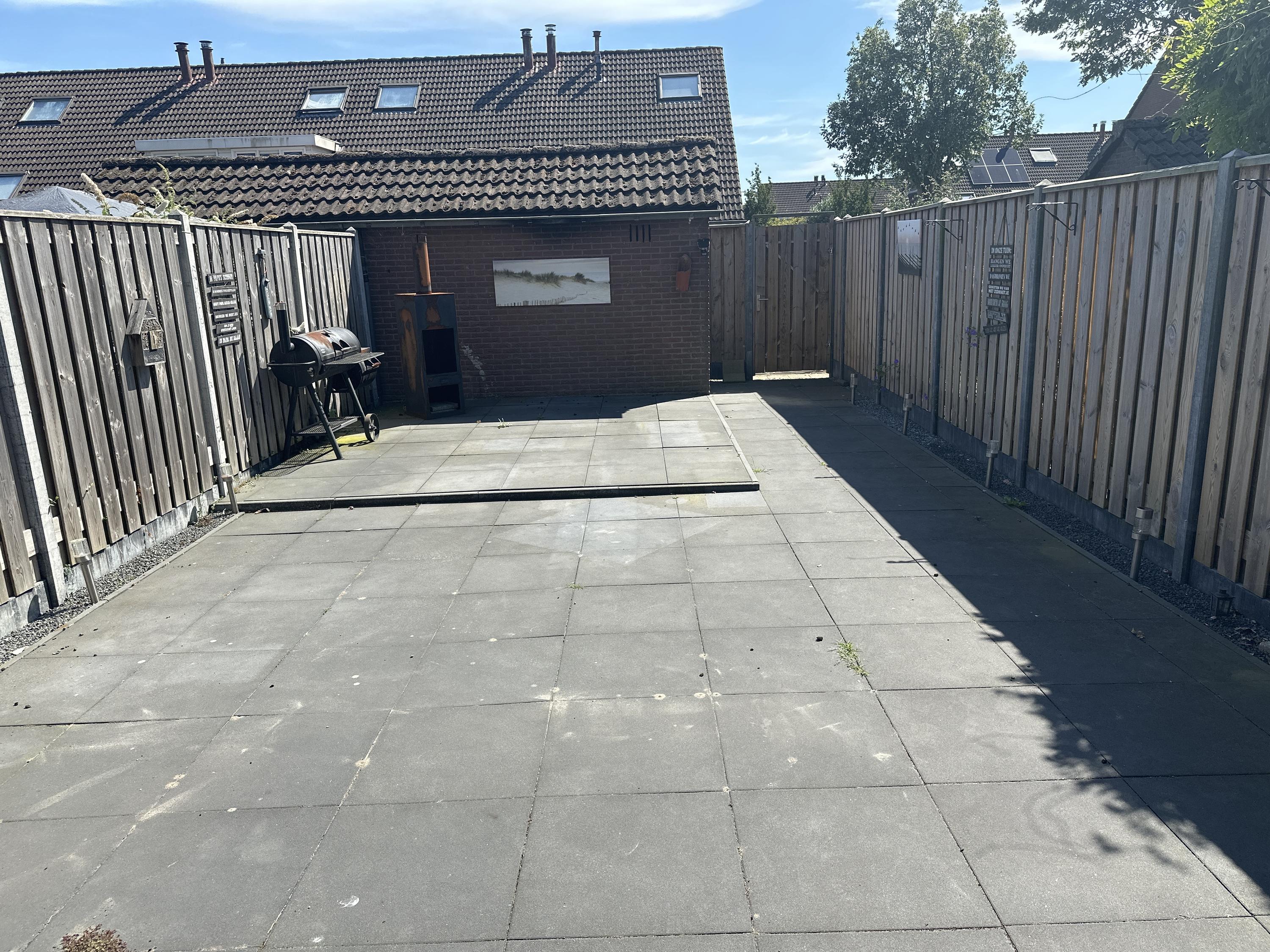 Tuin: De voortuin is gelegen op het het westen en biedt mogelijkheid tot parkeren op eigen terrein. De volledig betegelde achtertuin (12 x 6 meter) is gelegen op het oosten en is voorzien van een vrijstaande stenen berging en achterom.