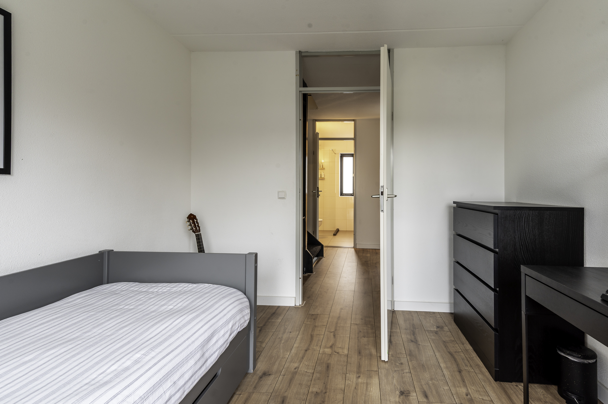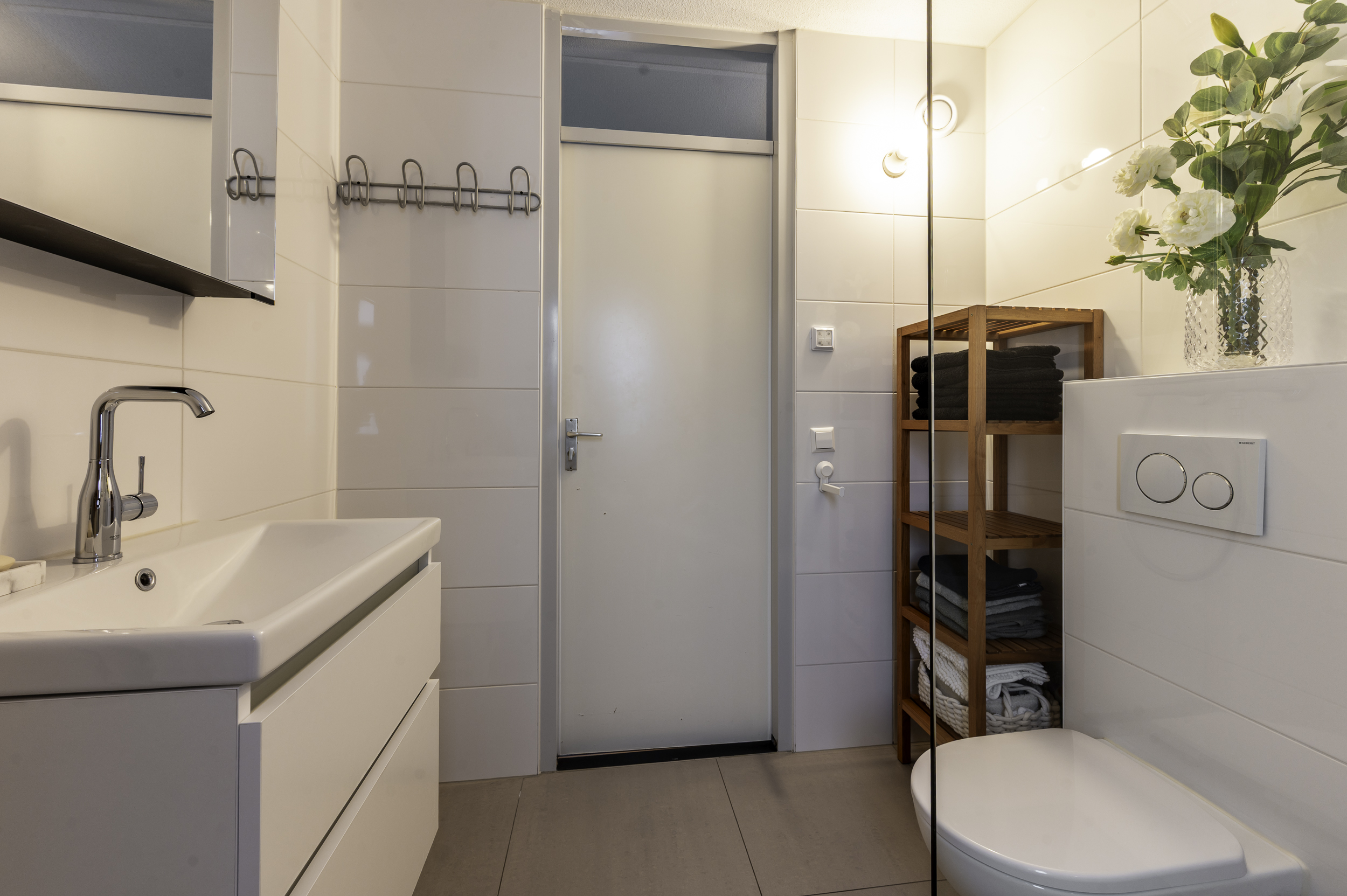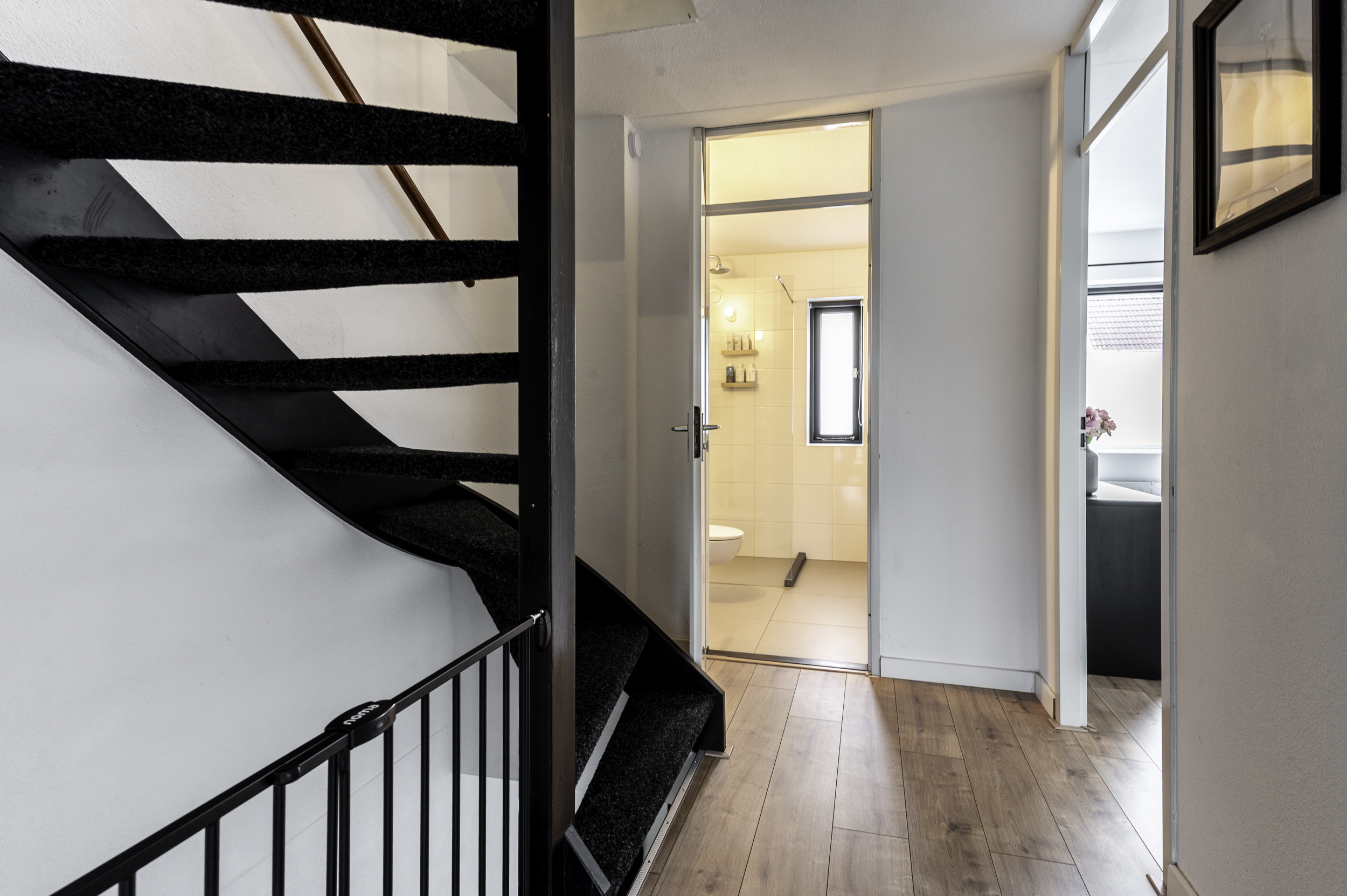 Eerste verdieping: Overloop; drie slaapkamers van respectievelijk 9,6-, 11,5- en 14m²; badkamer uit 2021 welke is voorzien van volledige en royale betegeling, een tweede (eveneens hangend) toilet, radiator, een inloopdouche met glazen douchewand en een wastafelmeubel.
