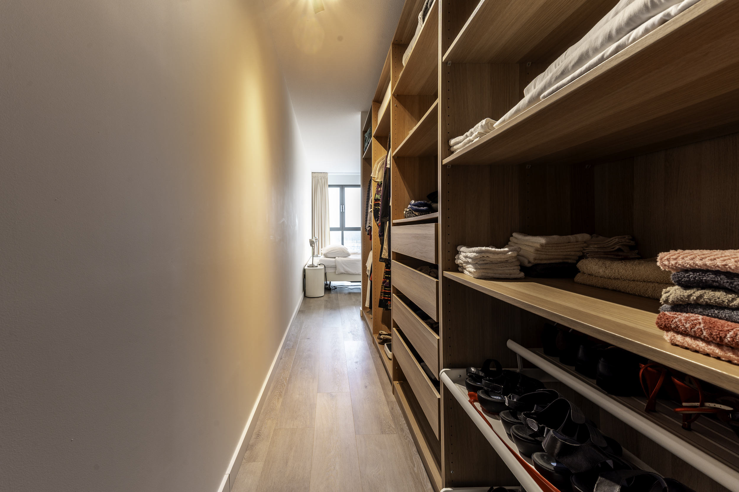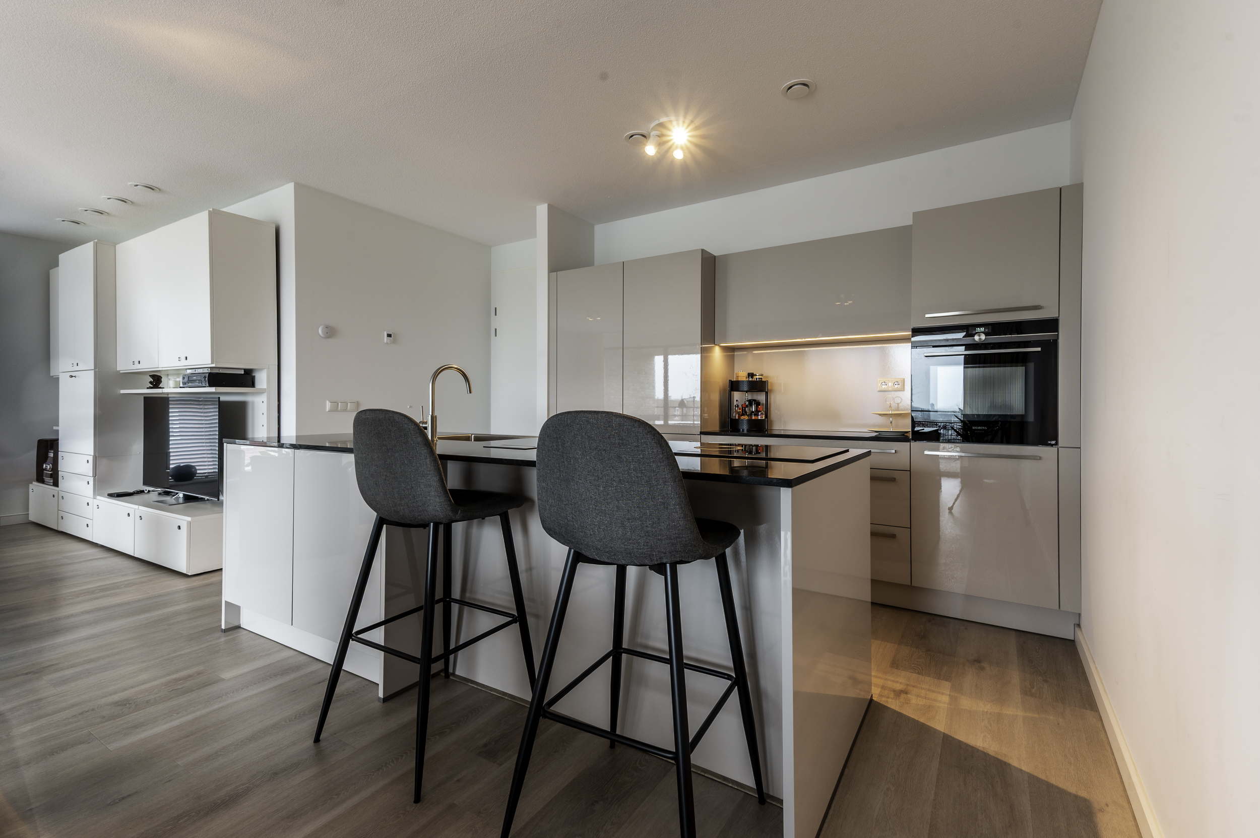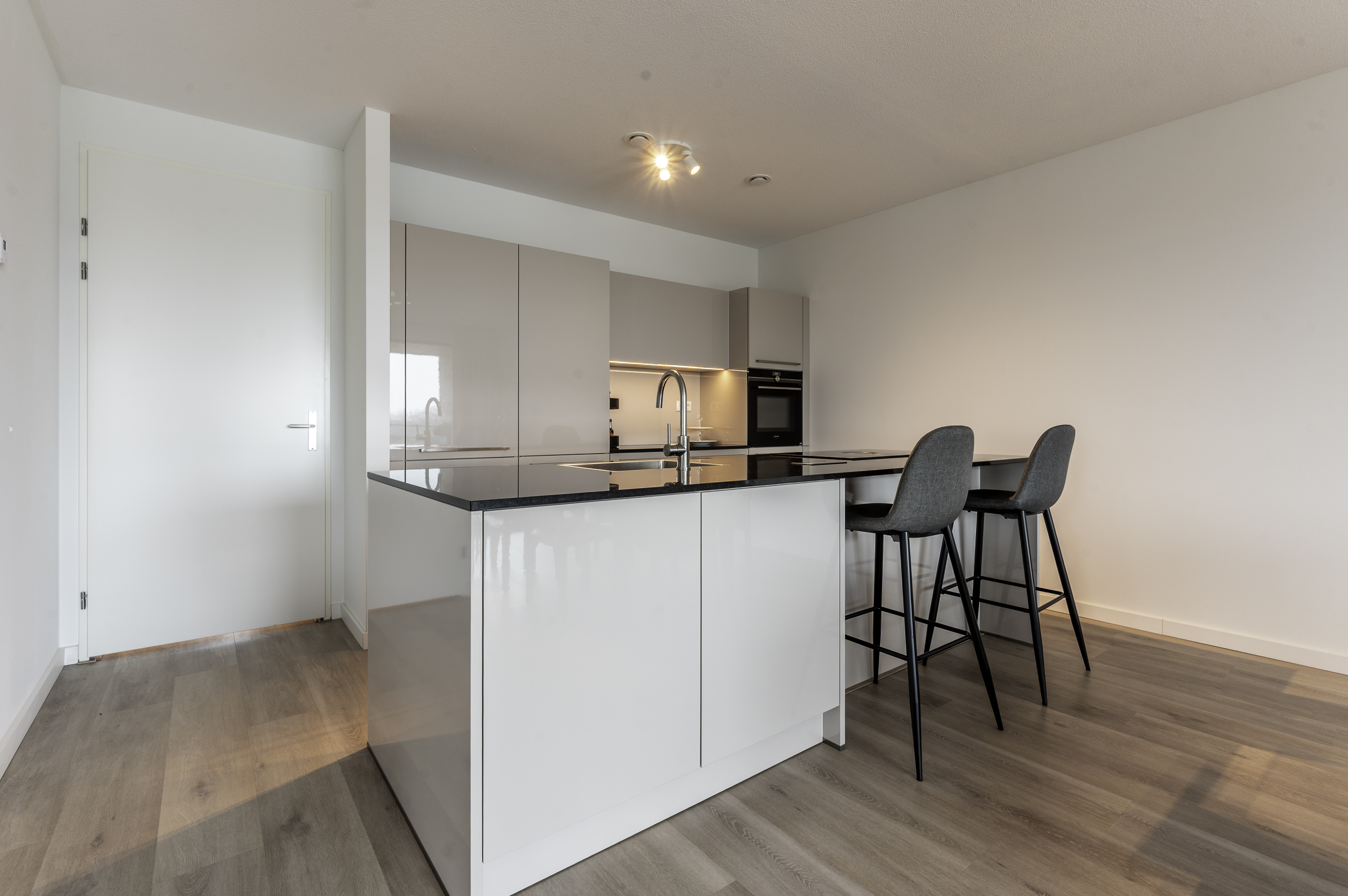 Indeling appartement: Entree/hal met de garderobe; berging/technische ruimte met de witgoedaansluitingen, bergruimte, de warmtepomp, verdeler van de vloerverwarming en de WTW-unit; vrijhangend toilet met fonteintje; twee slaapkamers van respectievelijk 22,1- (incl walk in closet) en 15m²; moderne, volledig betegelde badkamer welke is voorzien van een wastafelmeubel met spiegelkast met verlichting, een vrijstaand ligbad, inloopdouche (met zitje) en vloerverwarming; balkon/terrasgerichte woonkamer met open keuken (samen ruim 50m²) en door de schuifpui toegang tot het terras; in lichte kleurstelling uitgevoerde open keuken met kookeiland, welke voorzien is van ondermeer een inductie kookplaat met interne afzuiging, combi-oven, koelkast, ladenvriezer en een volledig geïntegreerde vaatwasser en een Quooker.