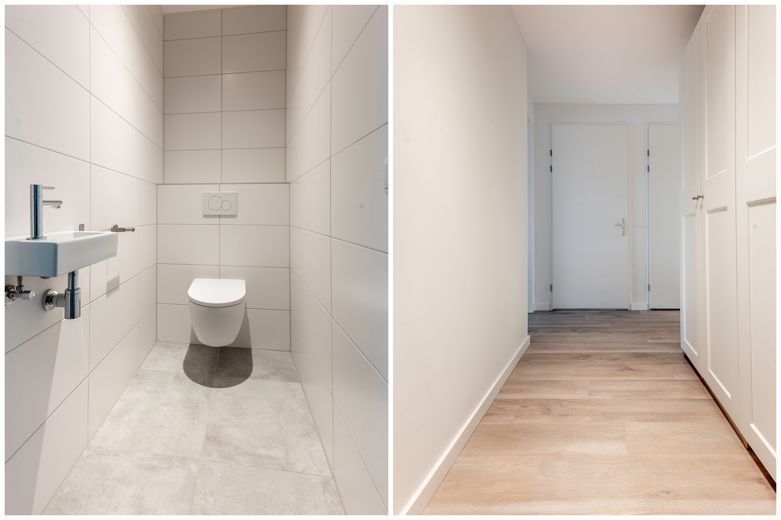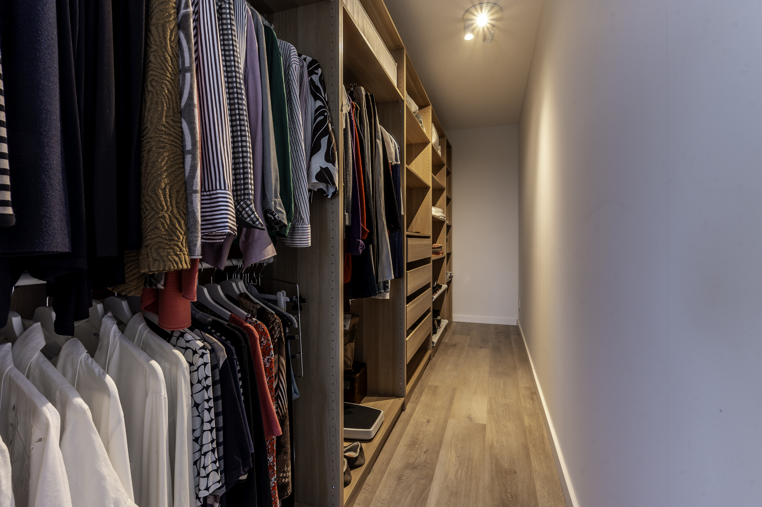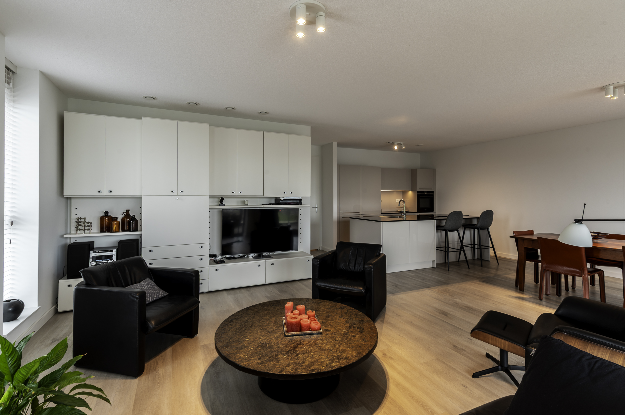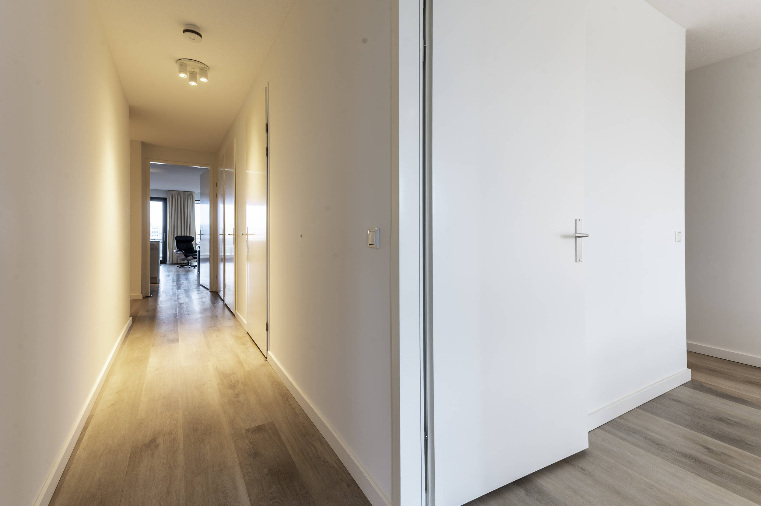 Indeling appartement: Entree/hal met de garderobe; berging/technische ruimte met de witgoedaansluitingen, bergruimte, de warmtepomp, verdeler van de vloerverwarming en de WTW-unit; vrijhangend toilet met fonteintje; twee slaapkamers van respectievelijk 22,1- (incl walk in closet) en 15m²; moderne, volledig betegelde badkamer welke is voorzien van een wastafelmeubel met spiegelkast met verlichting, een vrijstaand ligbad, inloopdouche (met zitje) en vloerverwarming; balkon/terrasgerichte woonkamer met open keuken (samen ruim 50m²) en door de schuifpui toegang tot het terras; in lichte kleurstelling uitgevoerde open keuken met kookeiland, welke voorzien is van ondermeer een inductie kookplaat met interne afzuiging, combi-oven, koelkast, ladenvriezer en een volledig geïntegreerde vaatwasser en een Quooker.