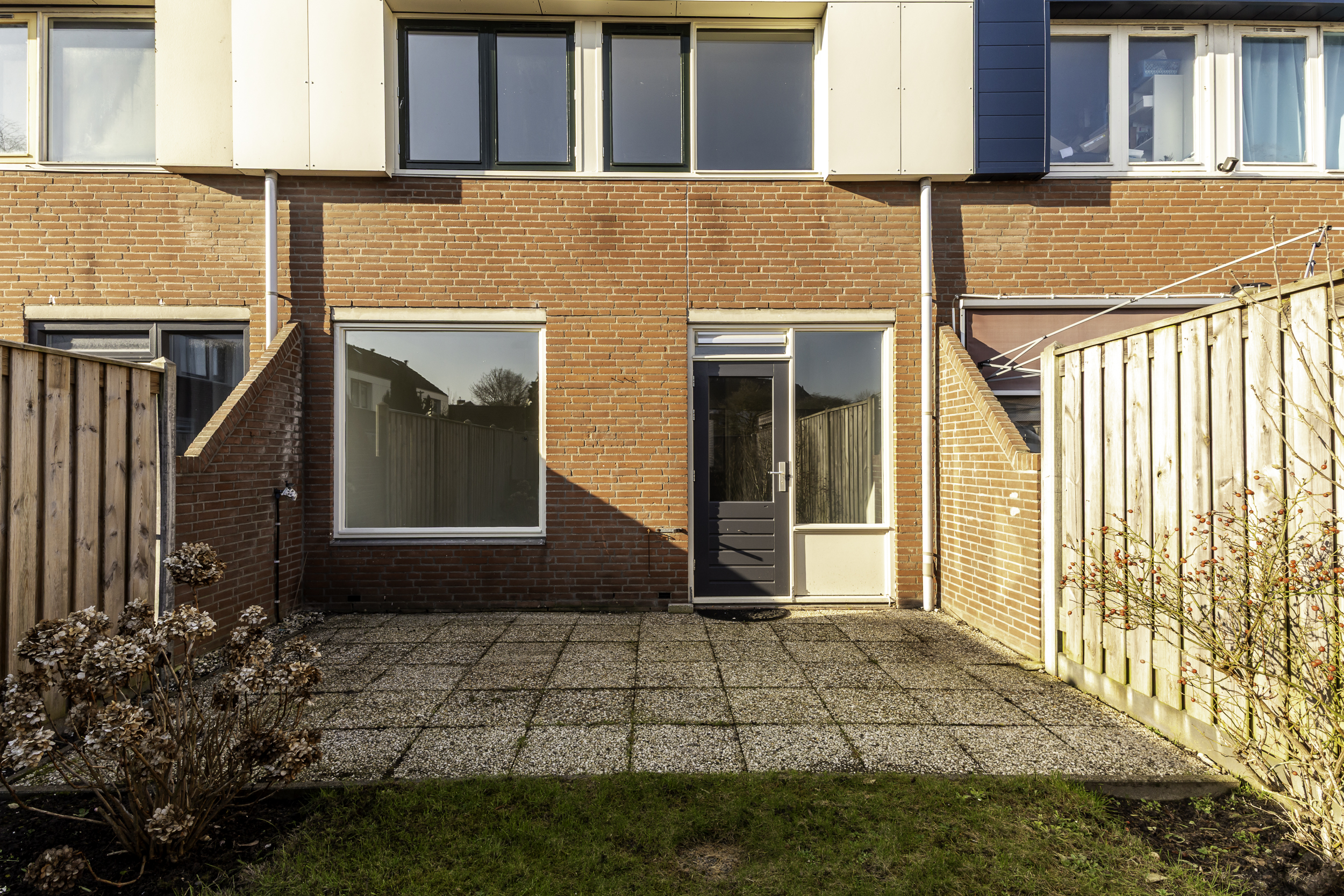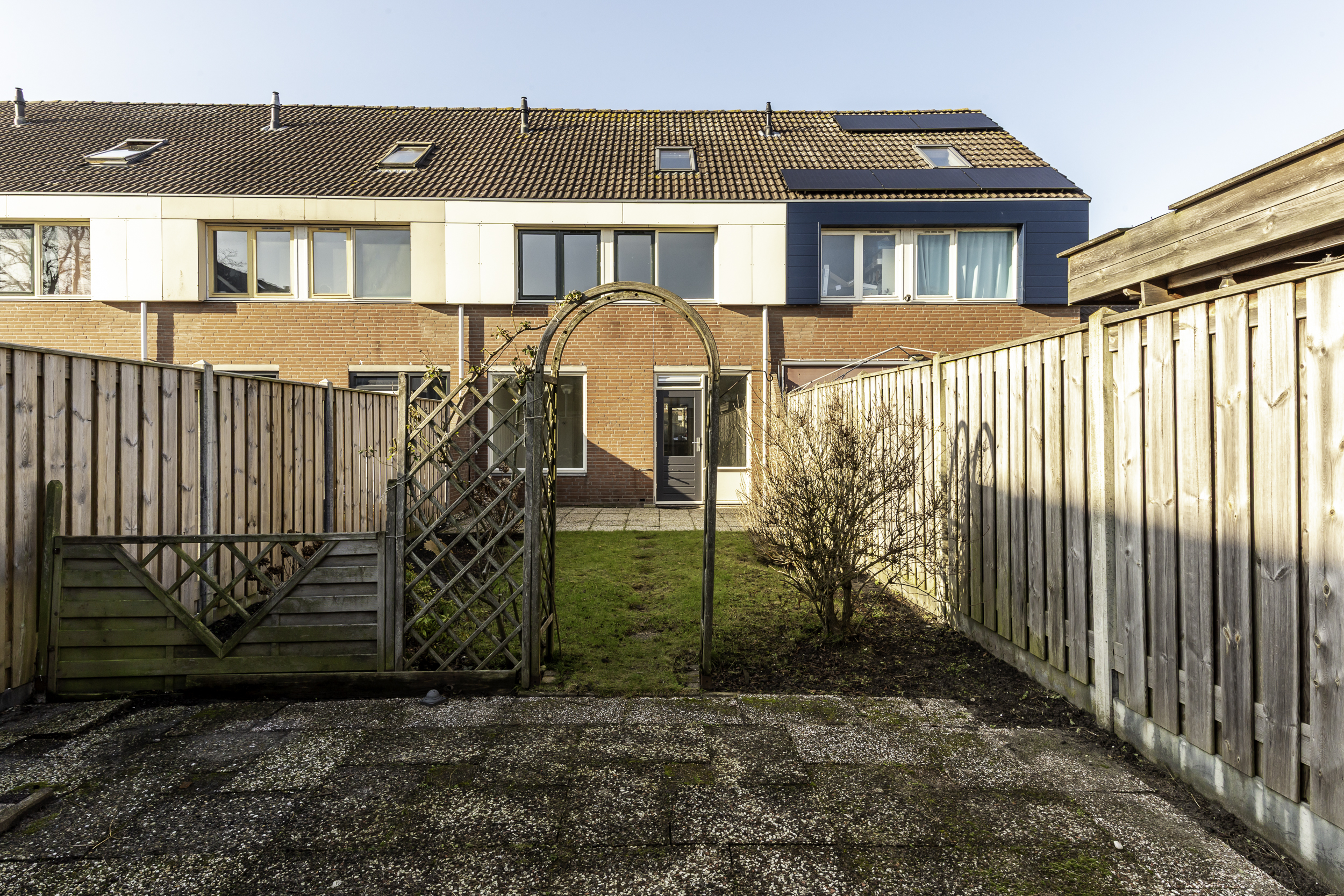 Tuin: Aan de voorzijde is de tuin voorzien van bestrating. Aan de achterzijde is de tuin voorzien van bestrating, een gazon, beplanting en een erfafscheiding met achterom. De achtertuin meet circa 11,5 meter diep en 6 meter breed en is gelegen op het oosten.