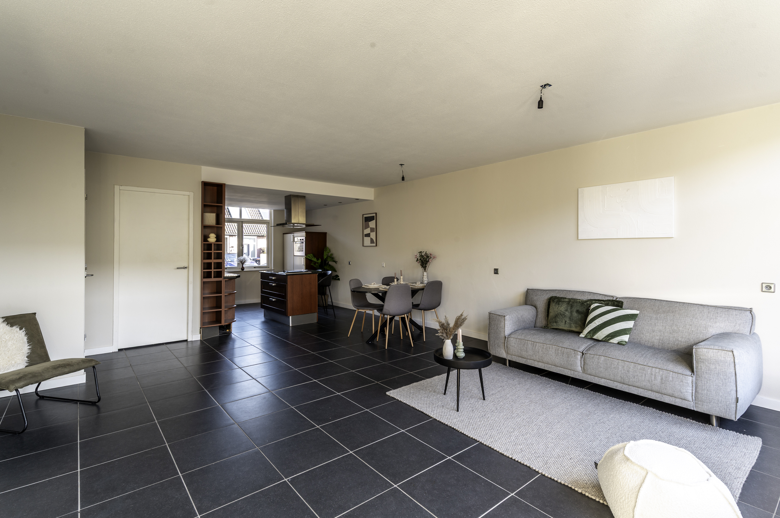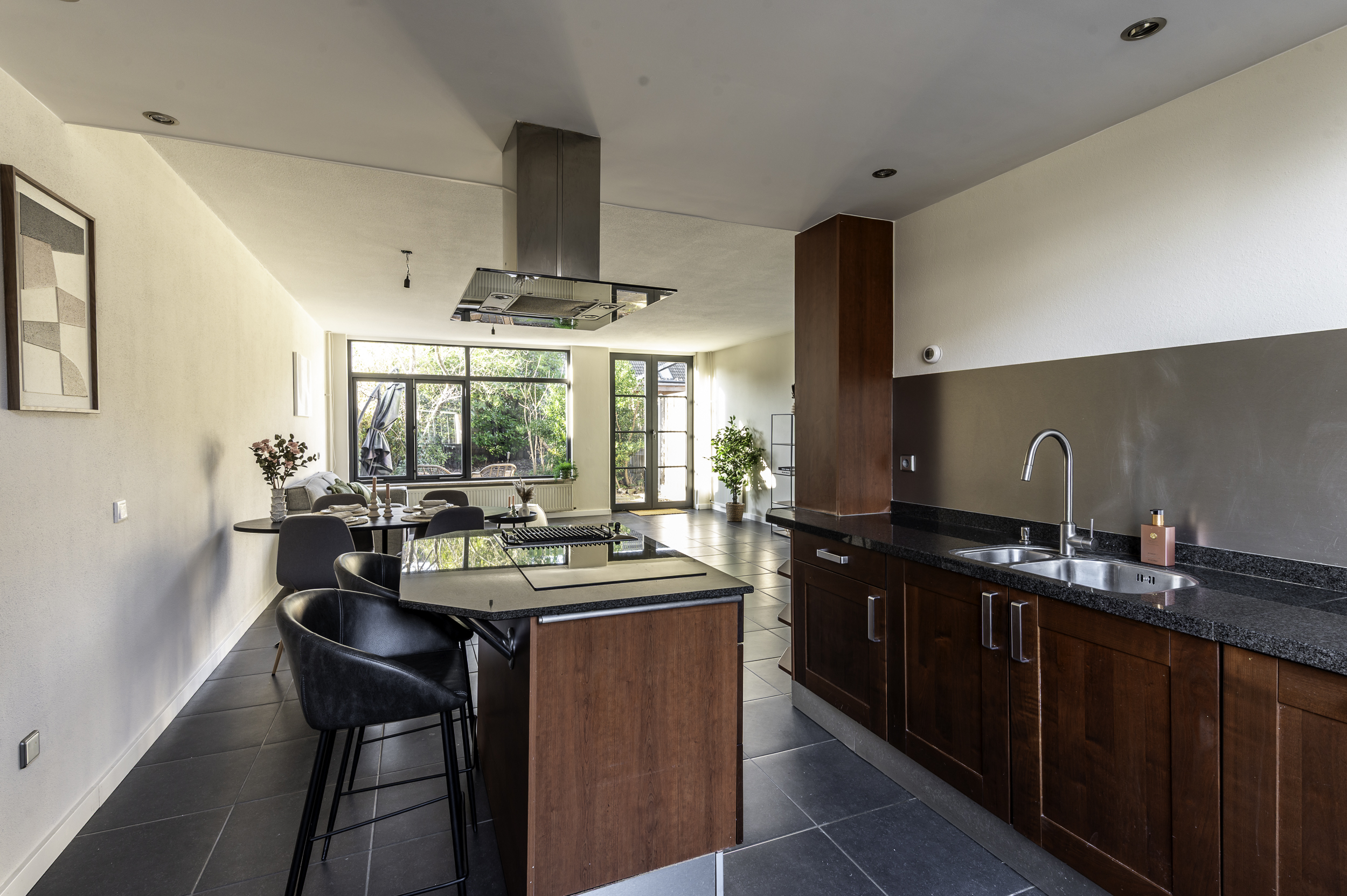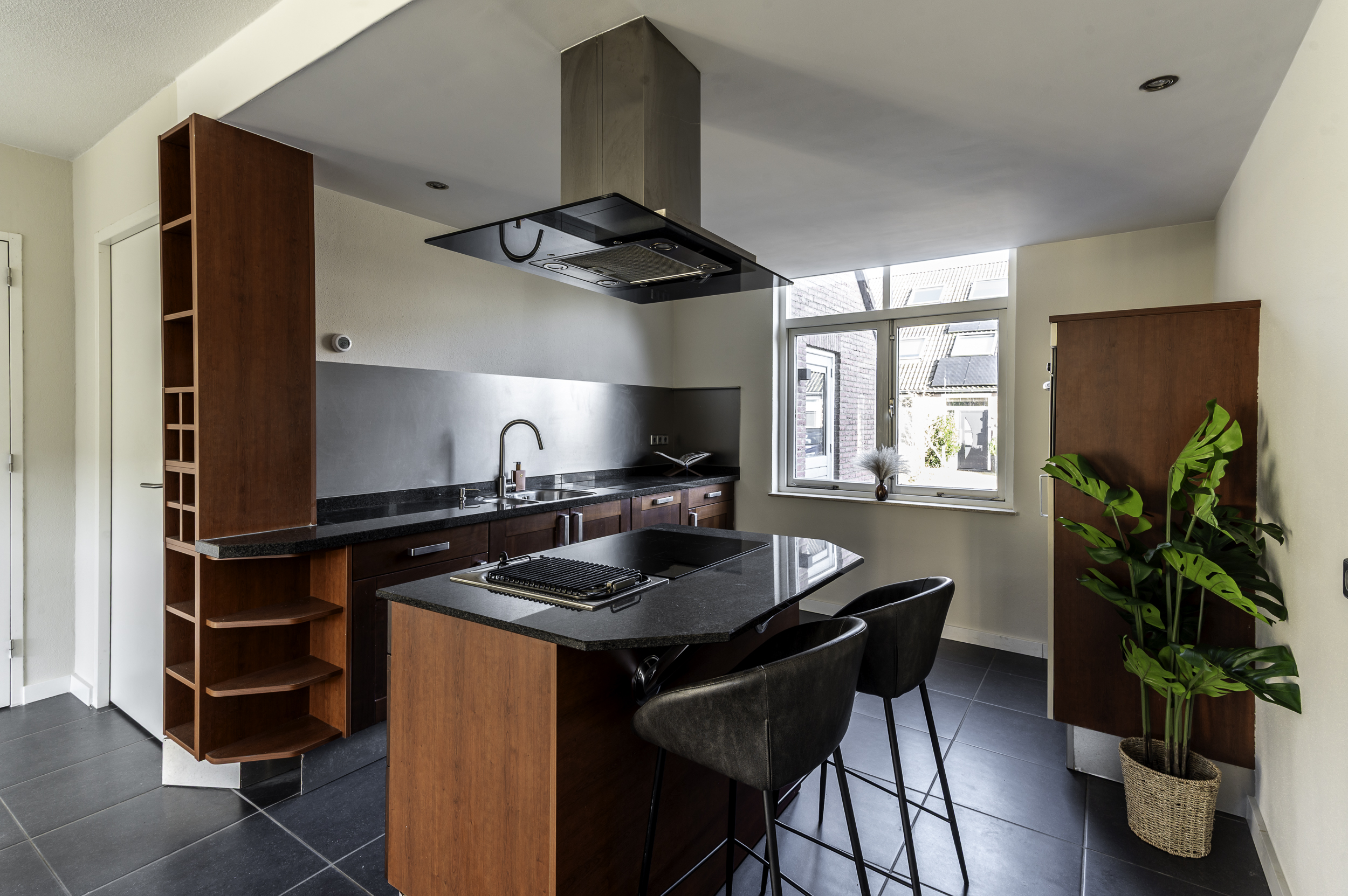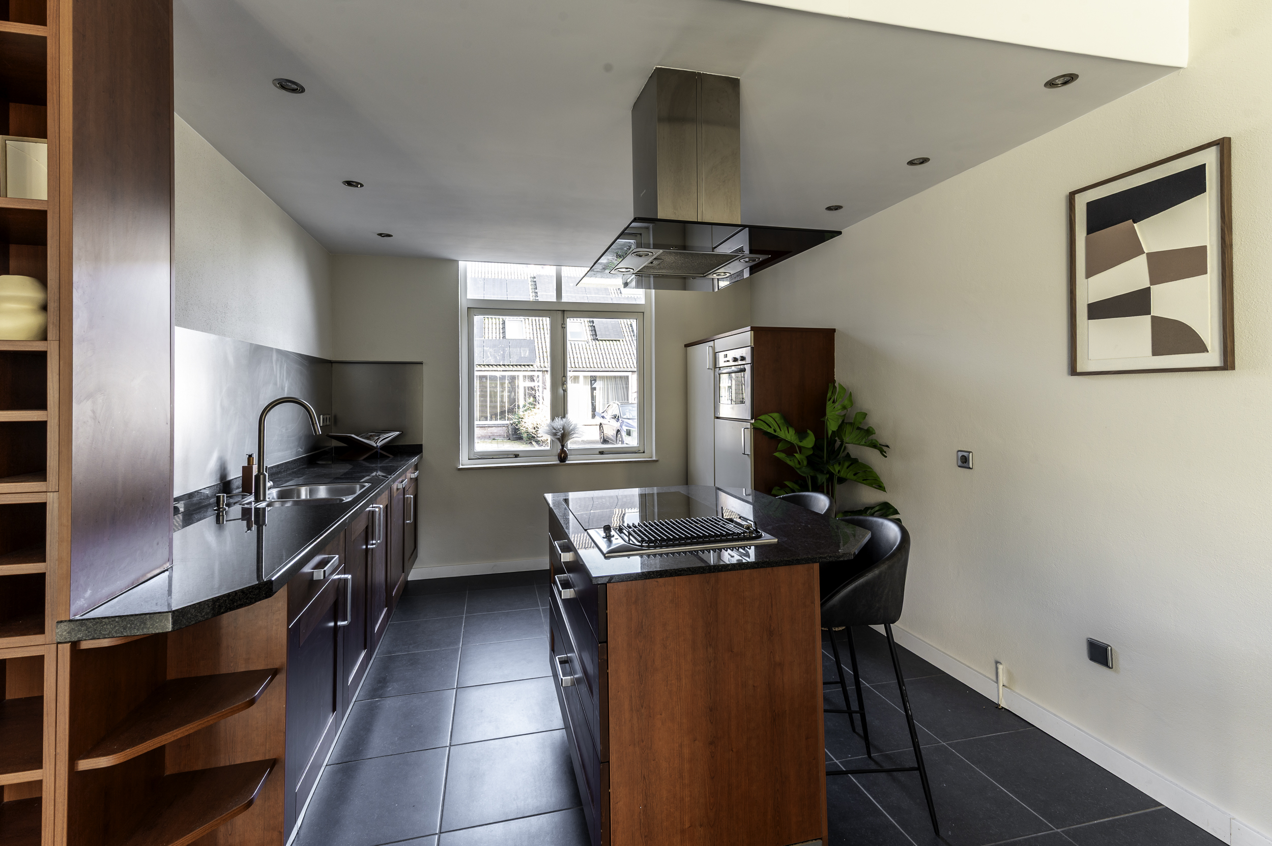 Begane grond: Entree; hal met meterkast; tuingerichte woonkamer van ongeveer 35m² met een trapkast en openslaande deuren naar de achtertuin; ruime opstel mogelijkheden voor eettafel aanwezig; keurige keuken aan de voorzijde van de woning welke onder meer is voorzien van een kookeiland met een inductiekookplaat, grill en afzuigkap; verder is de keuken voorzien van een oven, koelkast, vriezer en een vaatwasser.