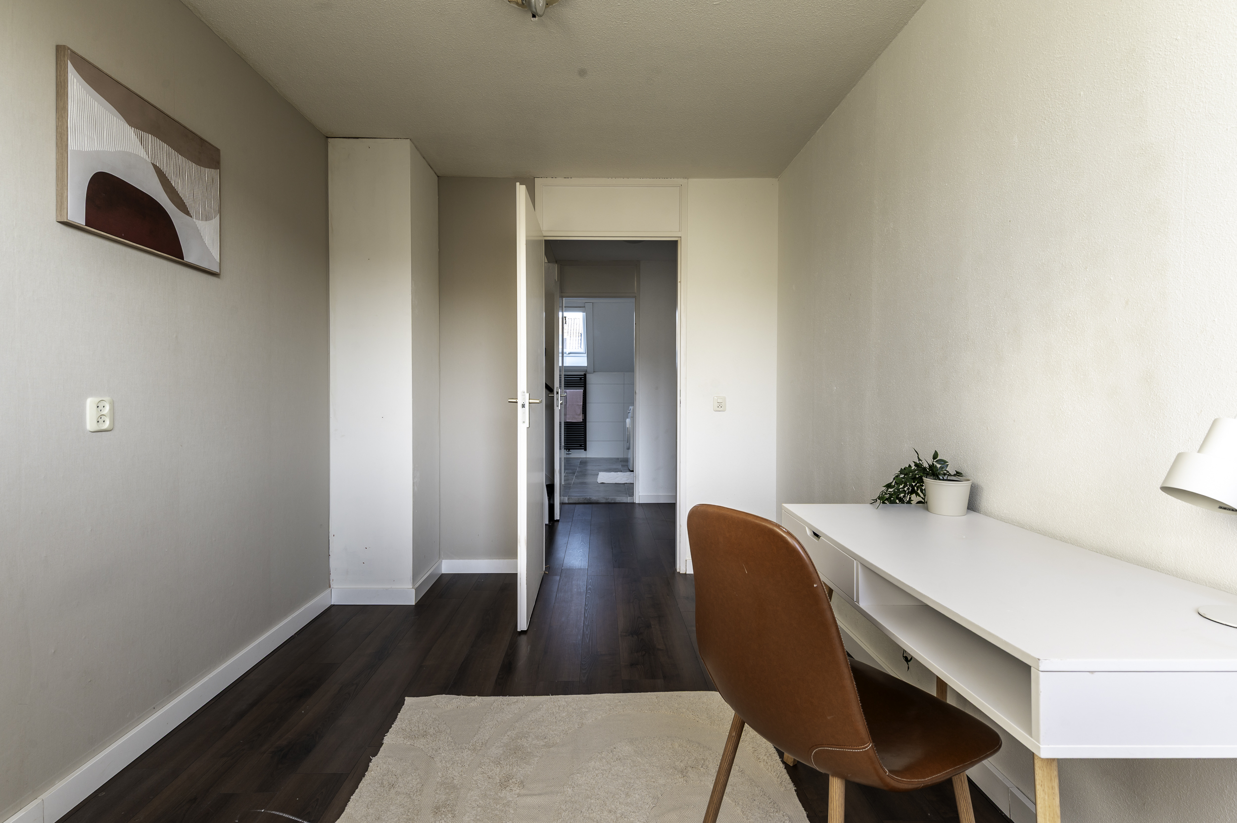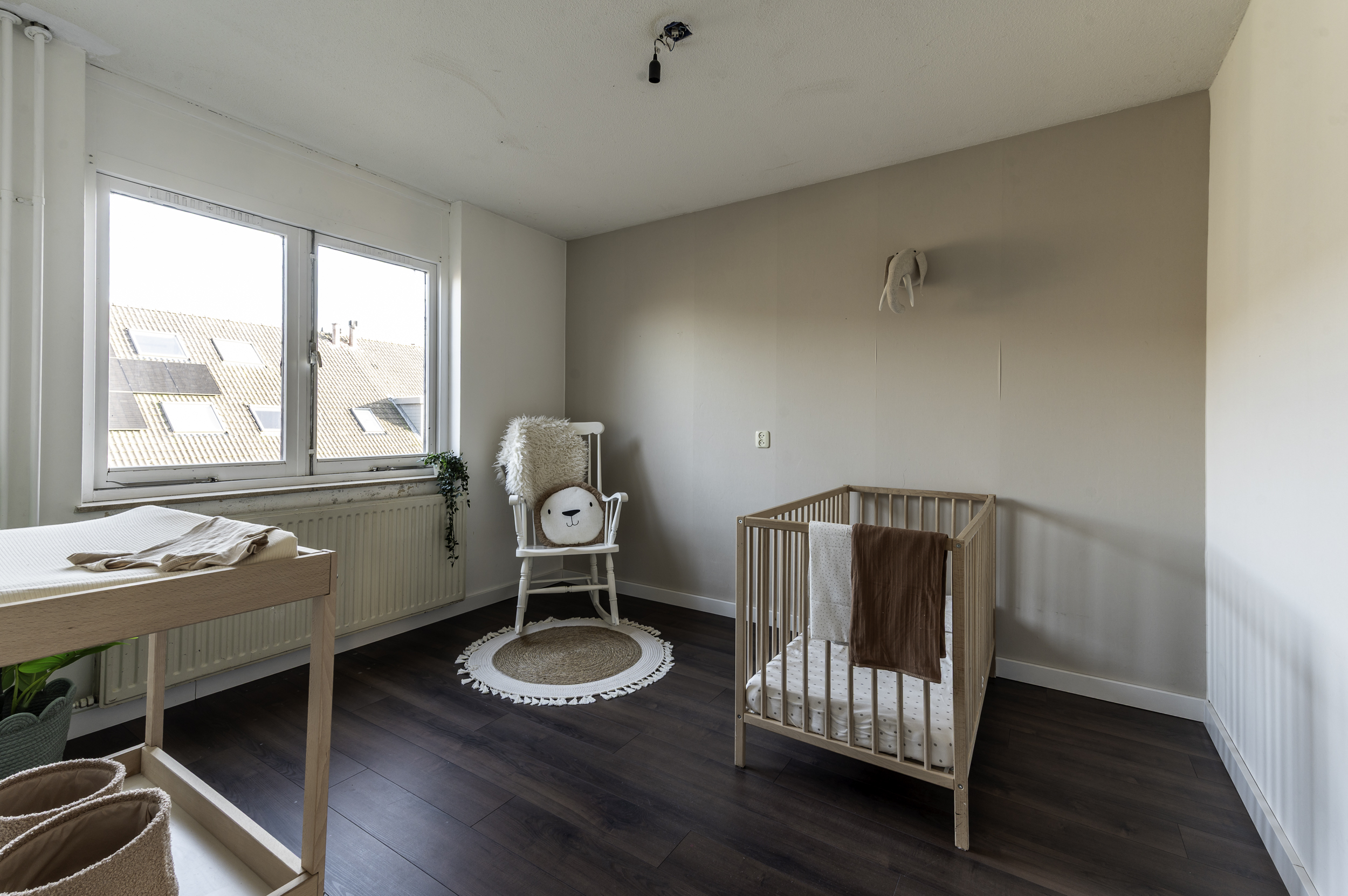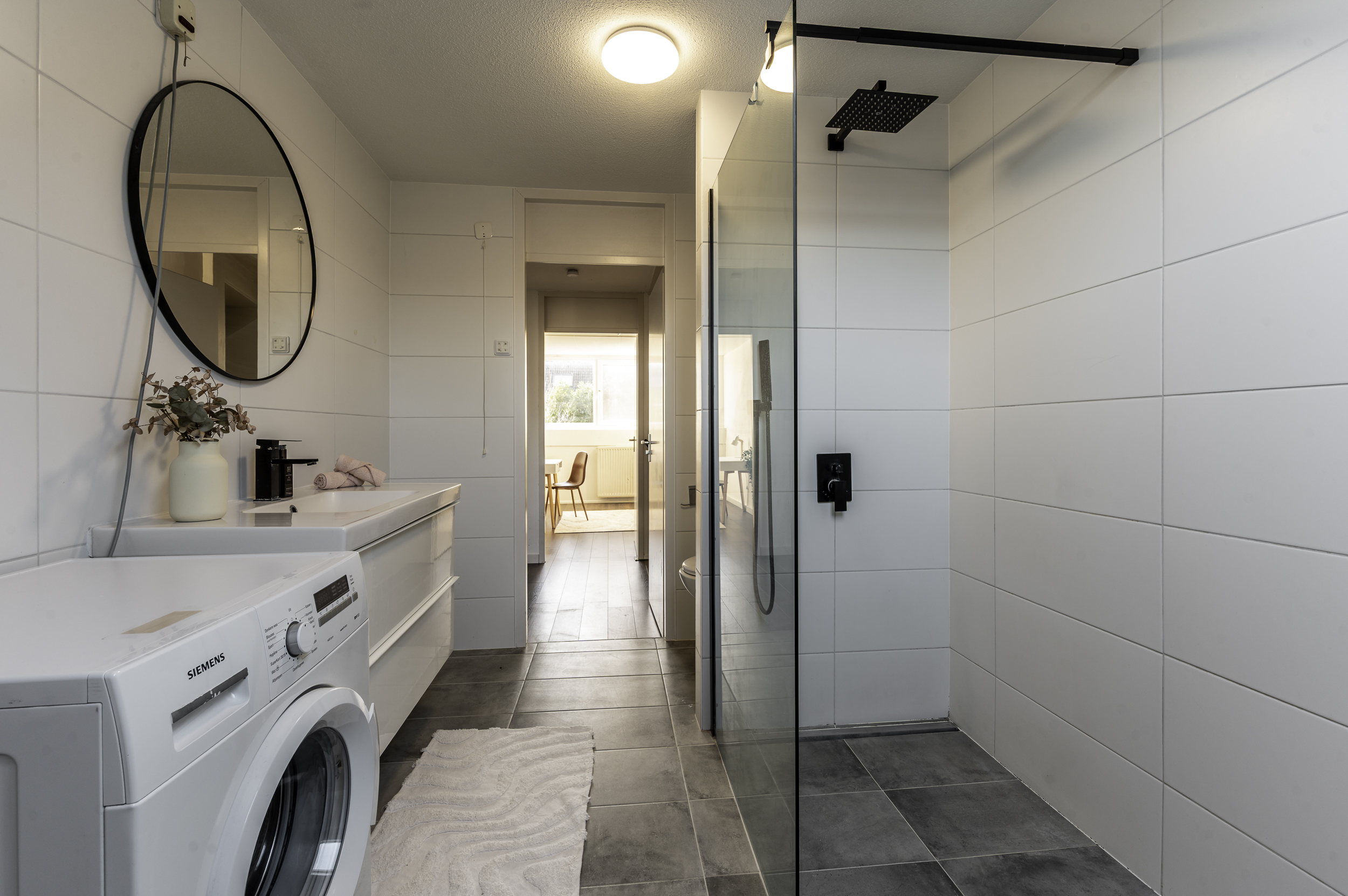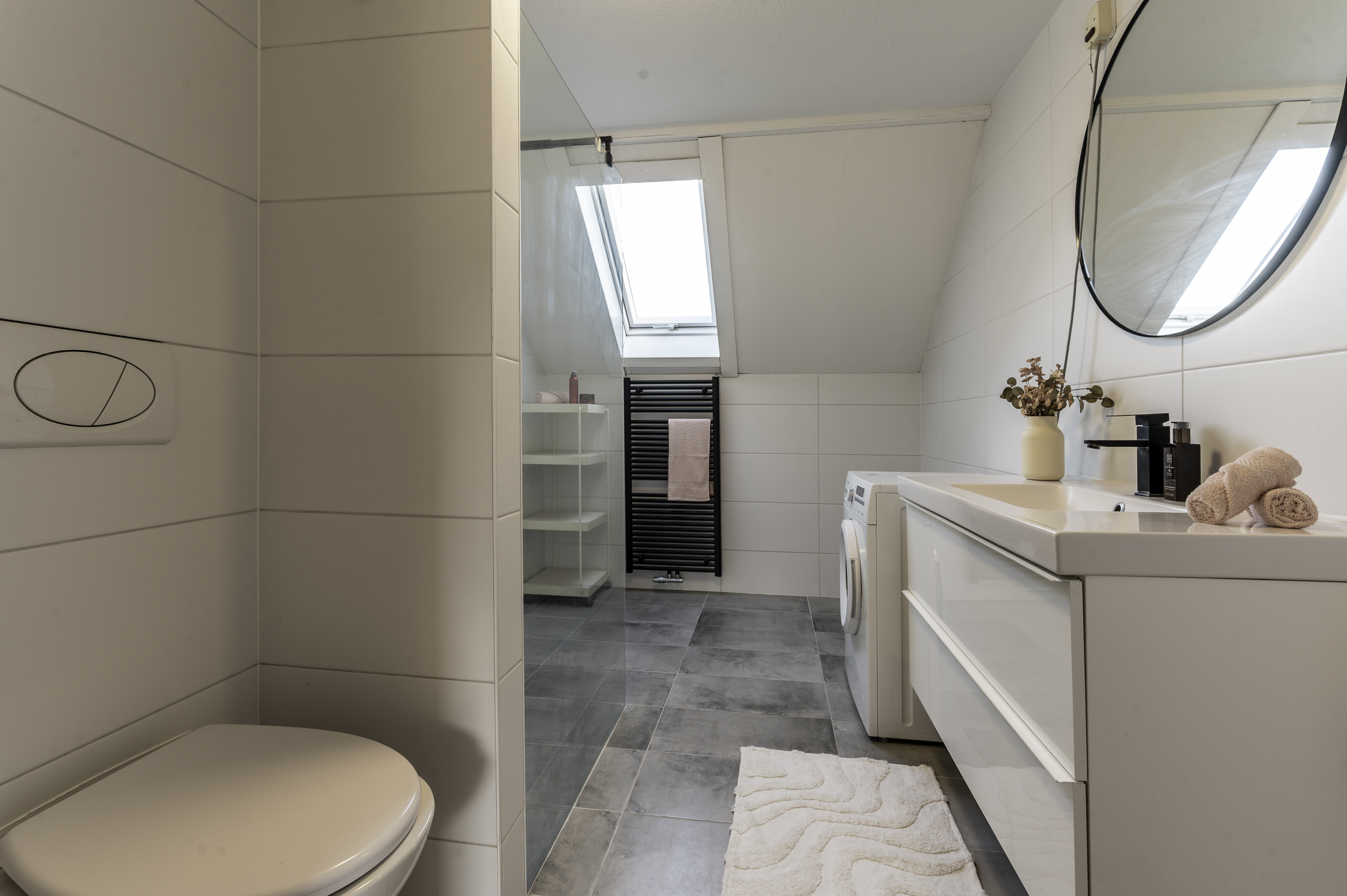 Eerste verdieping: Overloop; drie slaapkamers van respectievelijk 9,8-, 9,9- en 14,7m², waarvan; volledig betegelde badkamer welke in 2023 is vernieuwd en is voorzien van een inloopdouche, radiator, wastafelmeubel, een tweede toilet, de wasmachineaansluiting en een dakraam voor natuurlijk lichtinval en ventilatie.