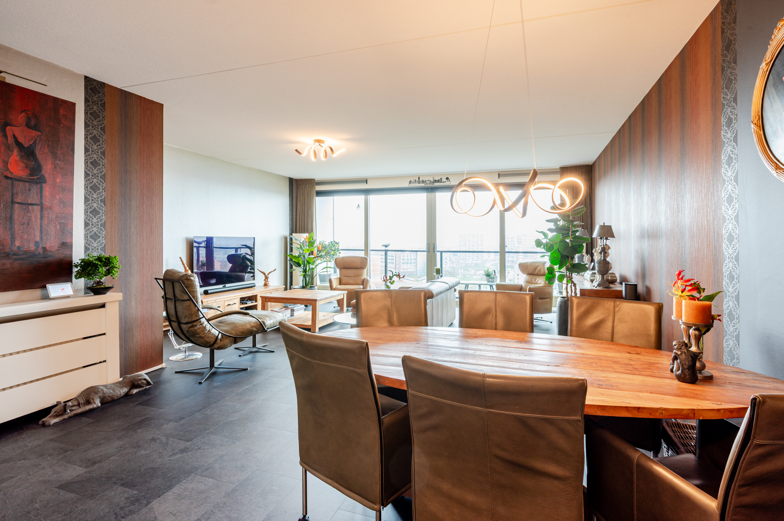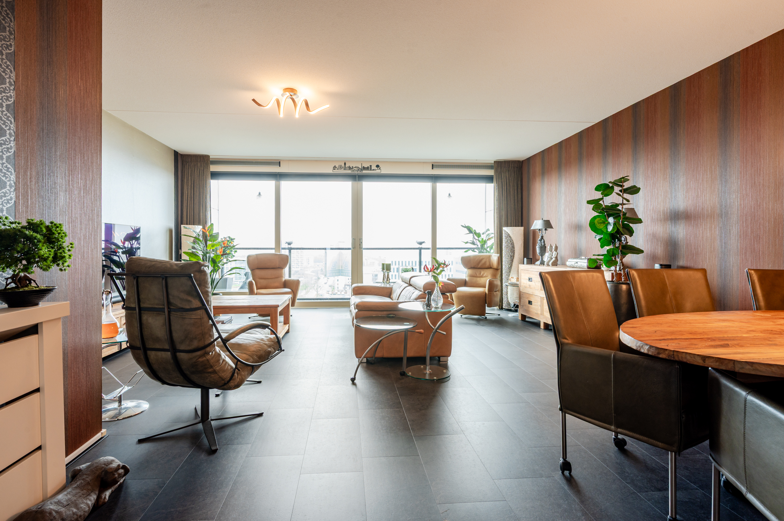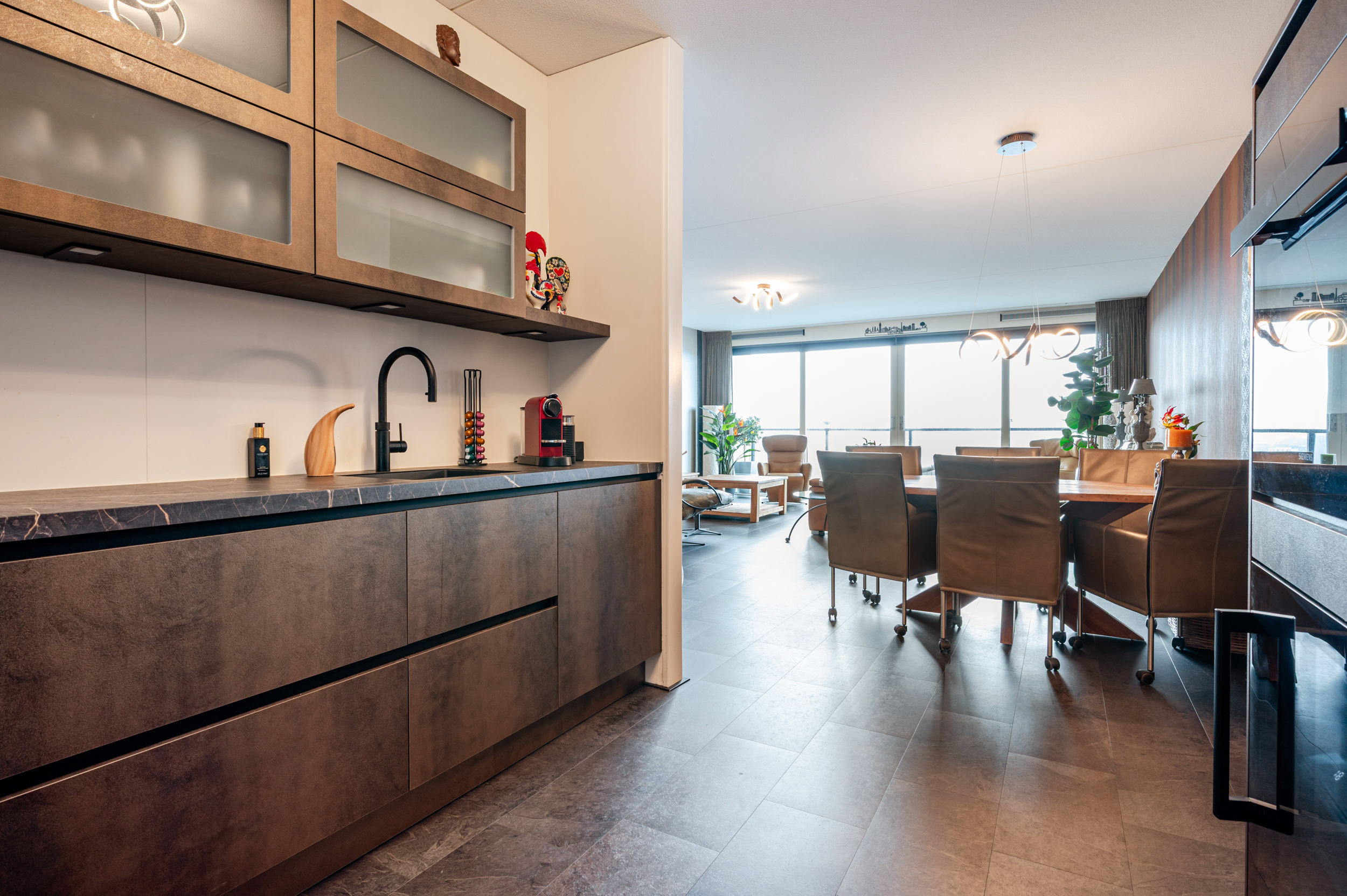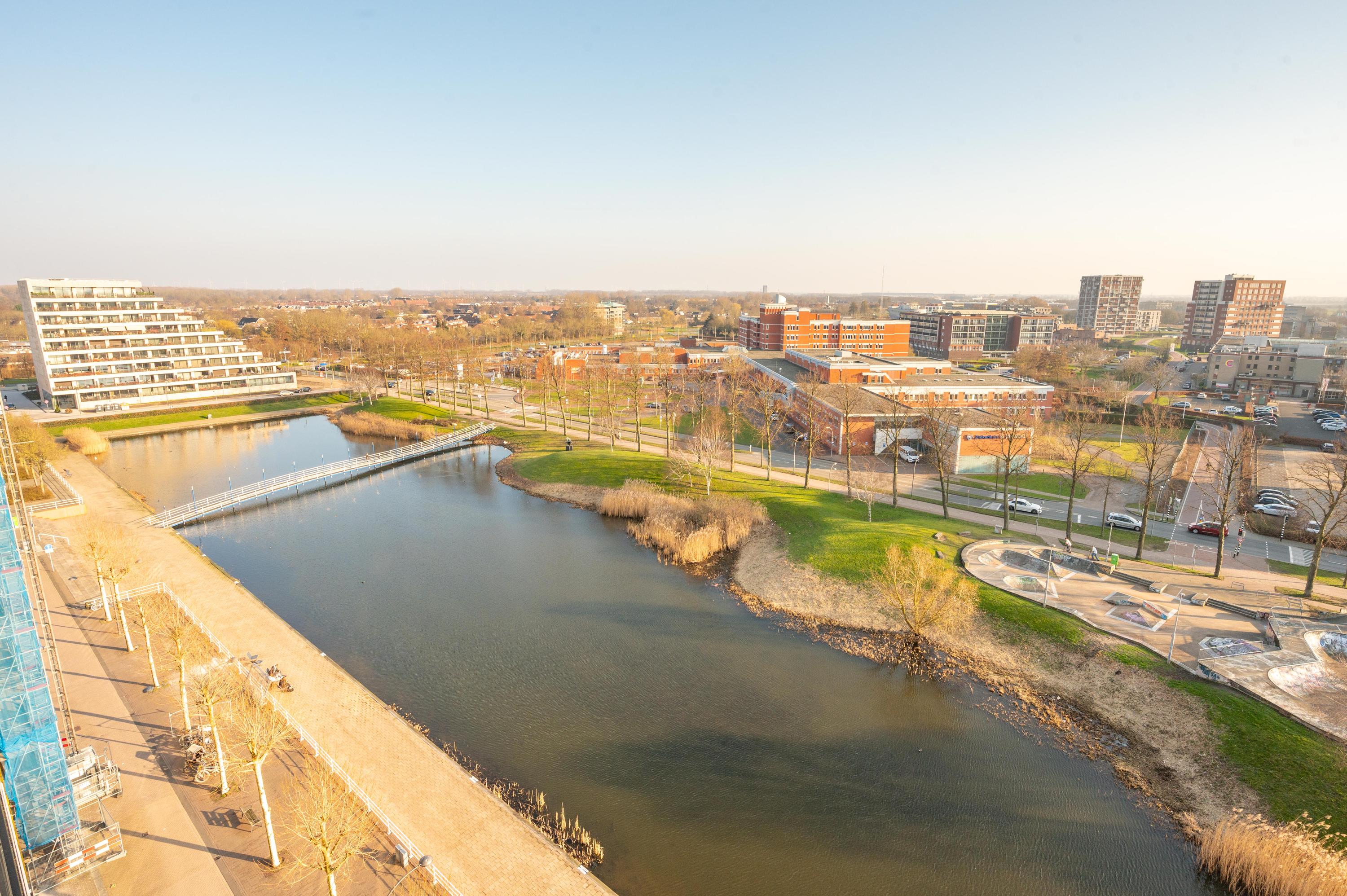 Achtste verdieping (appartement): Entree; hal met meterkast, toilet en toegang tot de woonkamer, twee slaapkamers en de badkamer; woonkamer van 44m² met twee schuifdeuren welke toegang bieden tot het een het balkon op het zuiden van 6 meter breed met uitzicht op een waterpartij; keuken uit 2024 in hoekopstelling en voorzien van onder meer een Quooker, oven, (wijn)klimaatkast, een Bora inductiekookplaat met interne afzuiging, vaatwasser en toegang tot de bijkeuken; bijkeuken met witgoedaansluitingen, de CV-opstelling en de mv-box (beide in 2021 vervangen) ; twee slaapkamers van respectievelijk 13,1- en 20,3m²; badkamer welke in 2021 is vervangen en is voorzien van volledige betegeling, een zgn. Japans toilet (toilet met bidetfunctie), een wastafelmeubel met 2 wastafels en 2 spiegels en een ruime inloopdouche met regendouche en een sunshower.