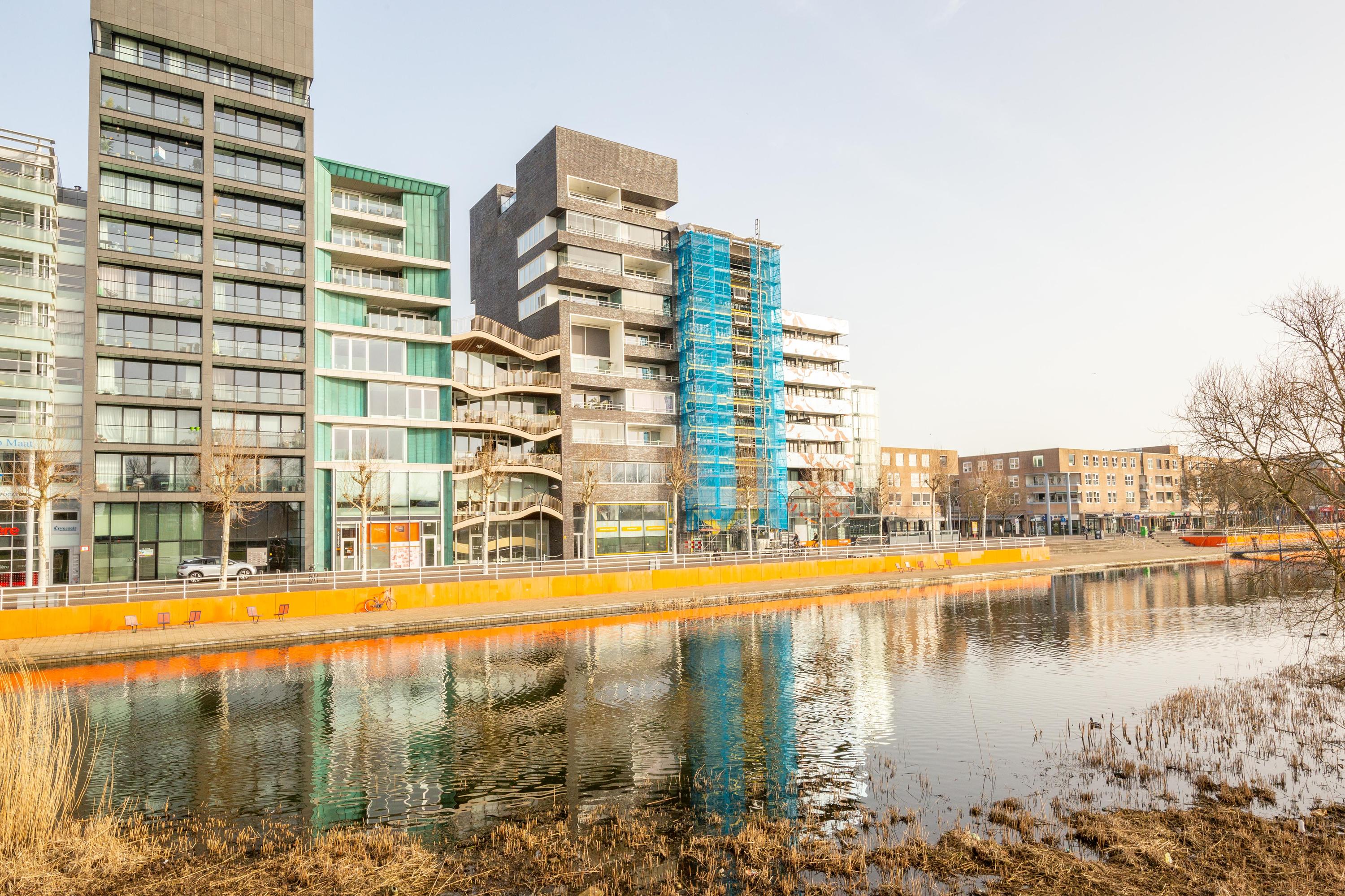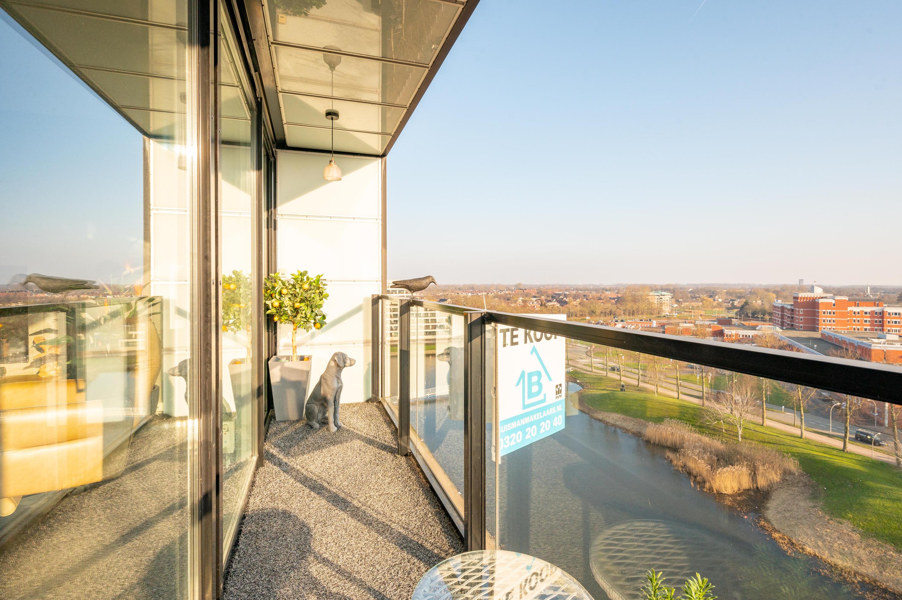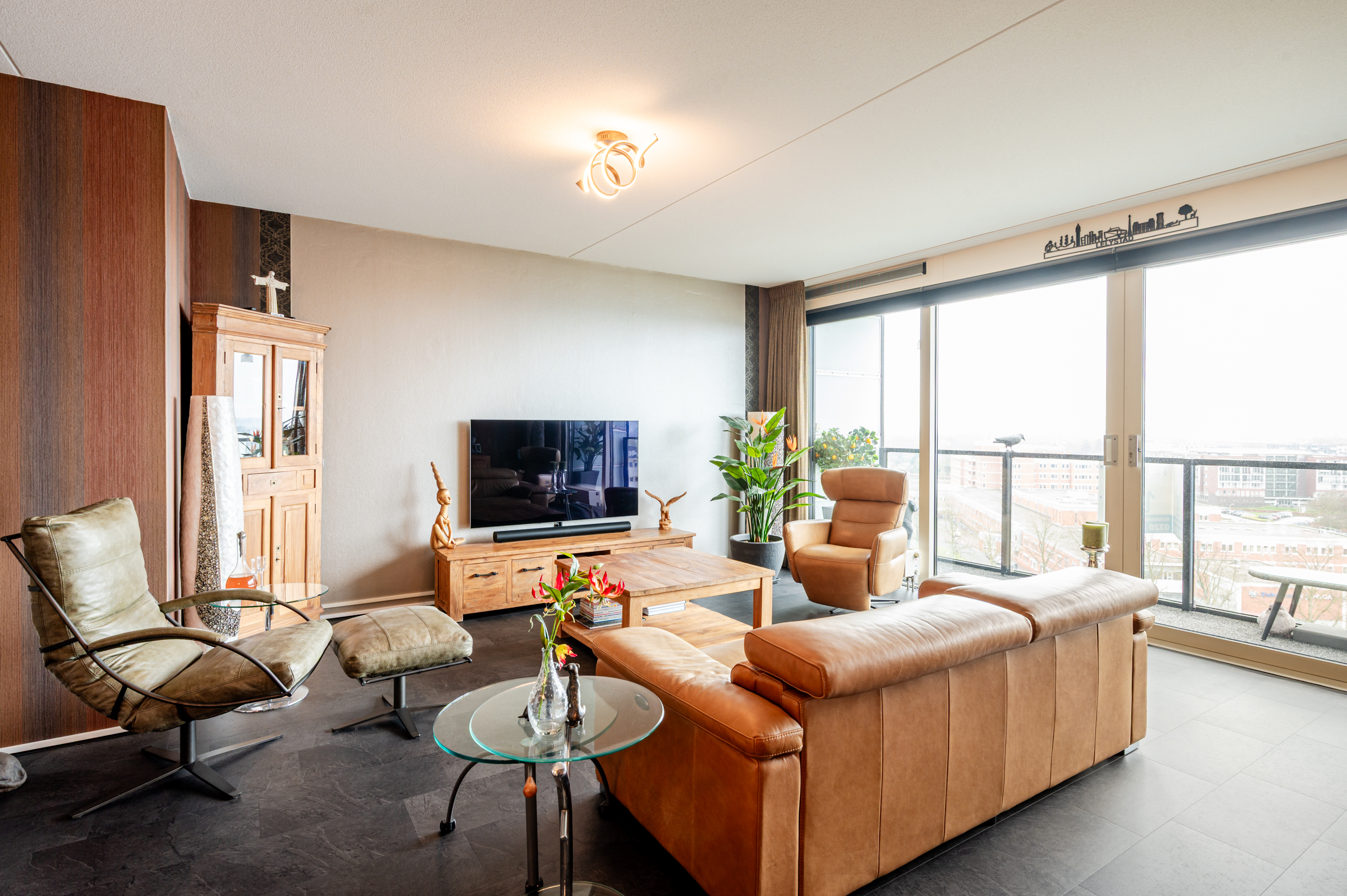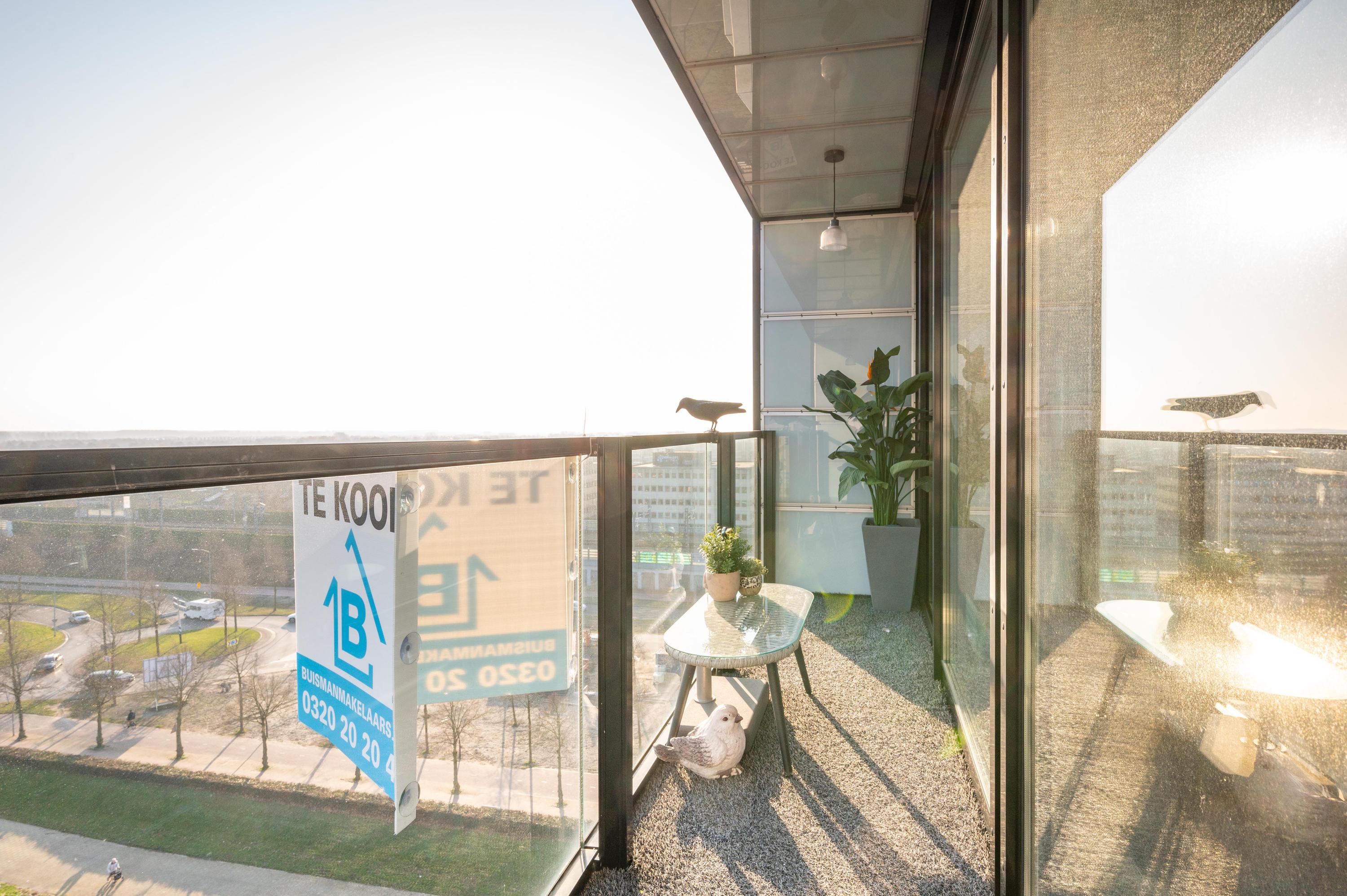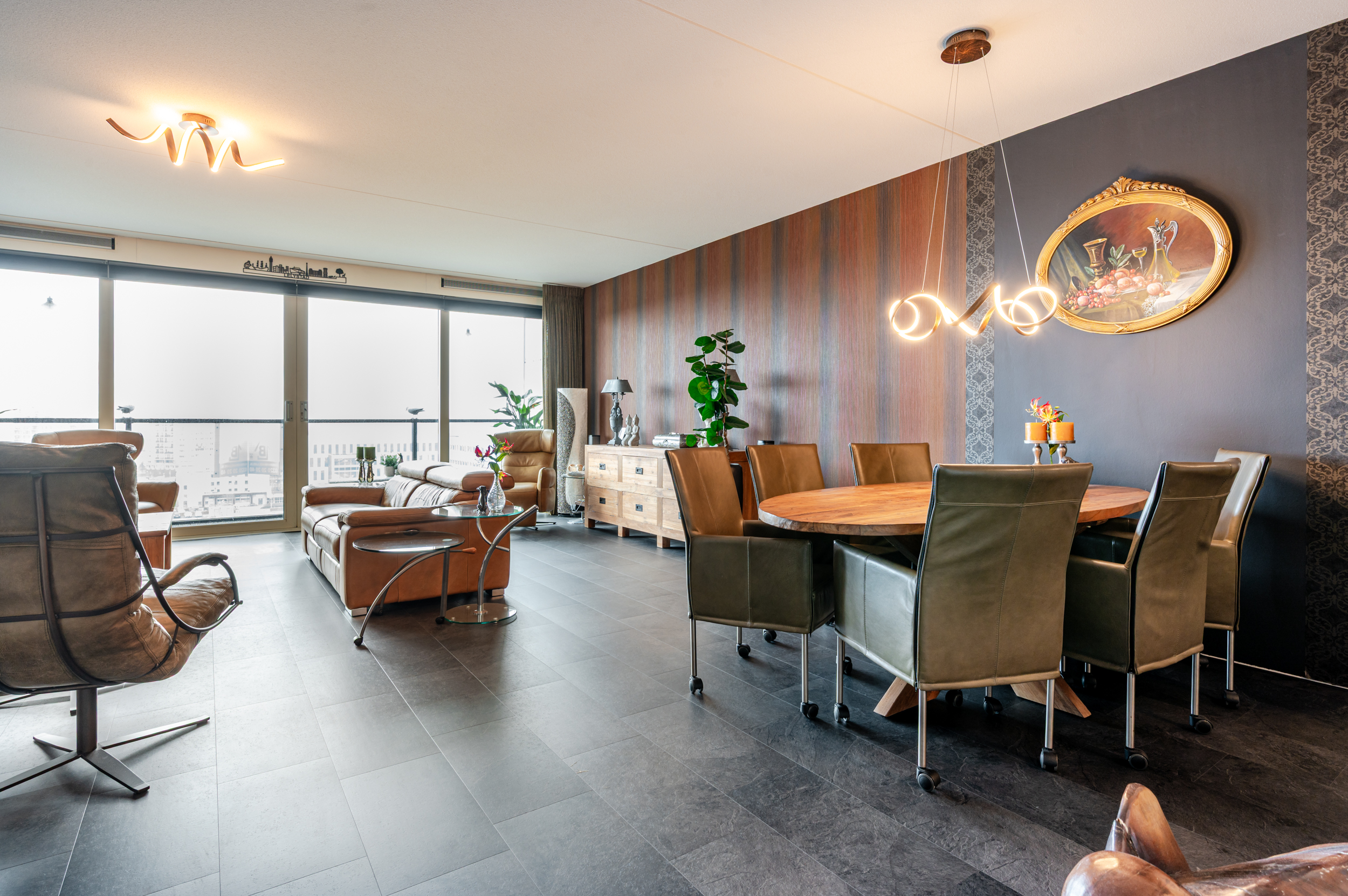 Achtste verdieping (appartement): Entree; hal met meterkast, toilet en toegang tot de woonkamer, twee slaapkamers en de badkamer; woonkamer van 44m² met twee schuifdeuren welke toegang bieden tot het een het balkon op het zuiden van 6 meter breed met uitzicht op een waterpartij; keuken uit 2024 in hoekopstelling en voorzien van onder meer een Quooker, oven, (wijn)klimaatkast, een Bora inductiekookplaat met interne afzuiging, vaatwasser en toegang tot de bijkeuken; bijkeuken met witgoedaansluitingen, de CV-opstelling en de mv-box (beide in 2021 vervangen) ; twee slaapkamers van respectievelijk 13,1- en 20,3m²; badkamer welke in 2021 is vervangen en is voorzien van volledige betegeling, een zgn. Japans toilet (toilet met bidetfunctie), een wastafelmeubel met 2 wastafels en 2 spiegels en een ruime inloopdouche met regendouche en een sunshower.