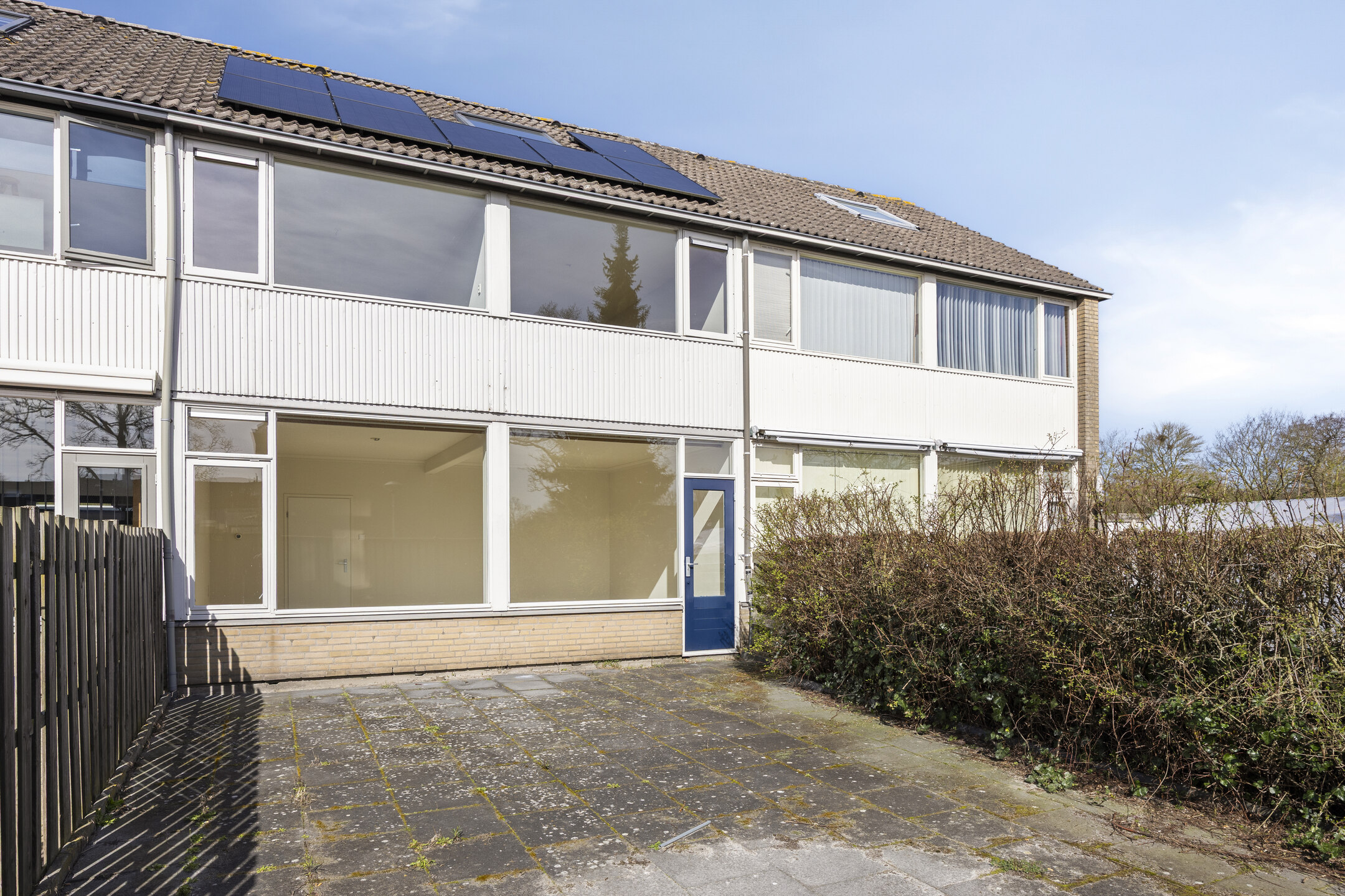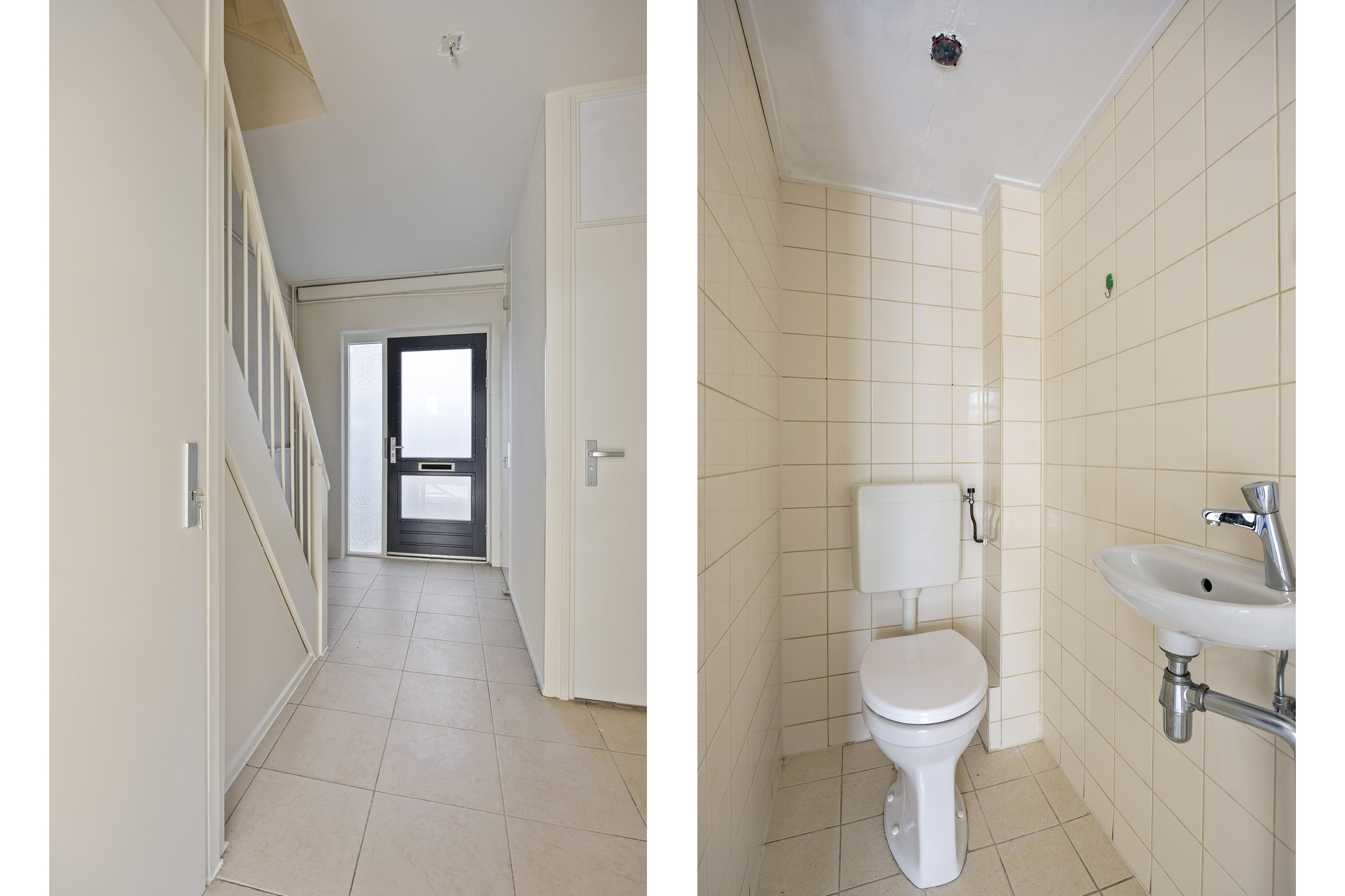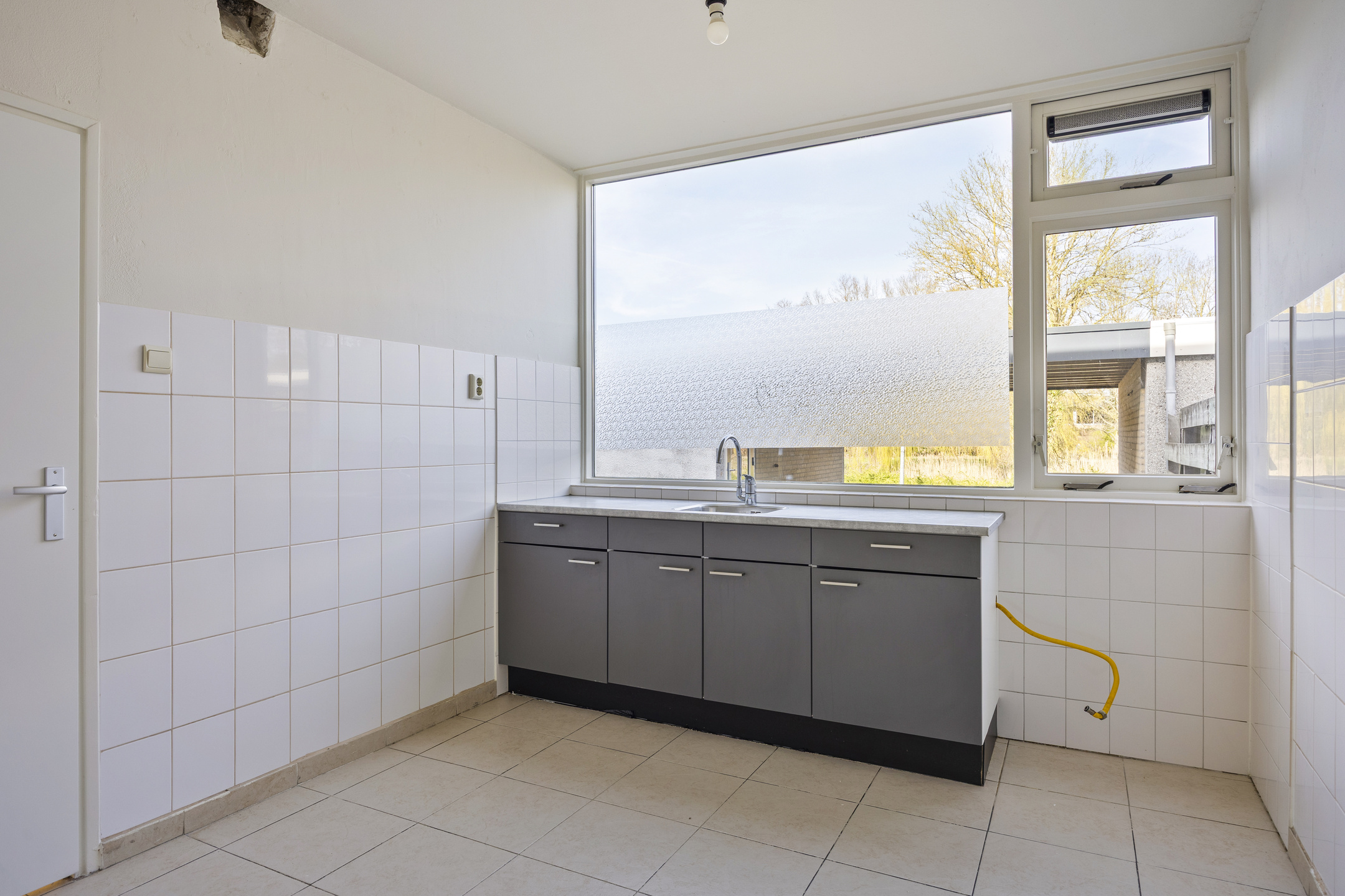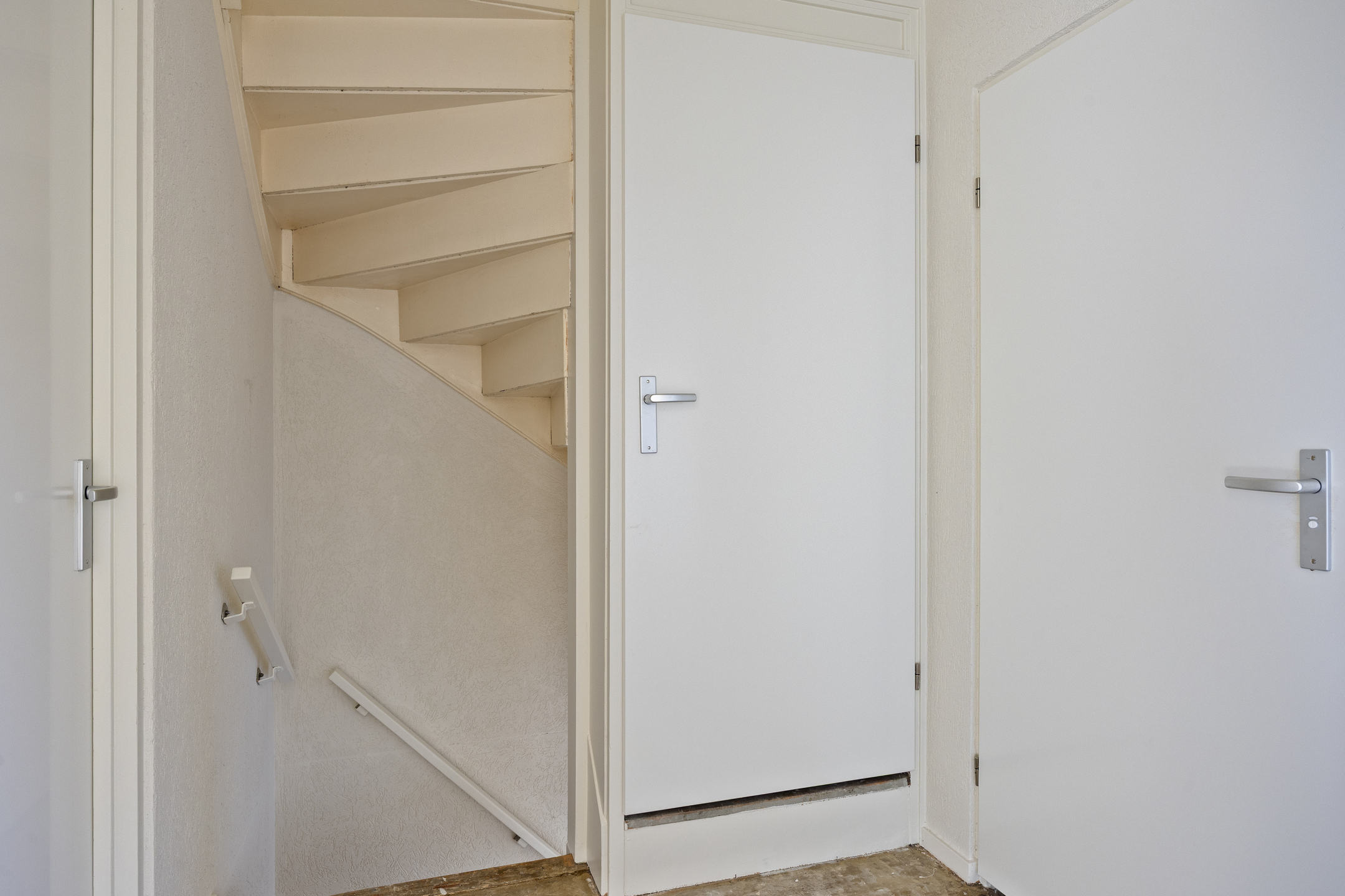 Begane grond: Entree, hal met de meterkast (automaten en v.v. glasvezel); toilet met fonteintje, trapopgang naar de eerste verdieping en toegang tot de royale woonkamer en separate keuken; de tuingerichte woonkamer meet 25m² en biedt een grote hoeveelheid lichtinval door de vele raampartijen; de separate (woon)keuken van 12,4m² bevindt zich aan de voorzijde van de woning en is voorzien van een eenvoudig, standaard keukenblok zonder enige apparatuur.