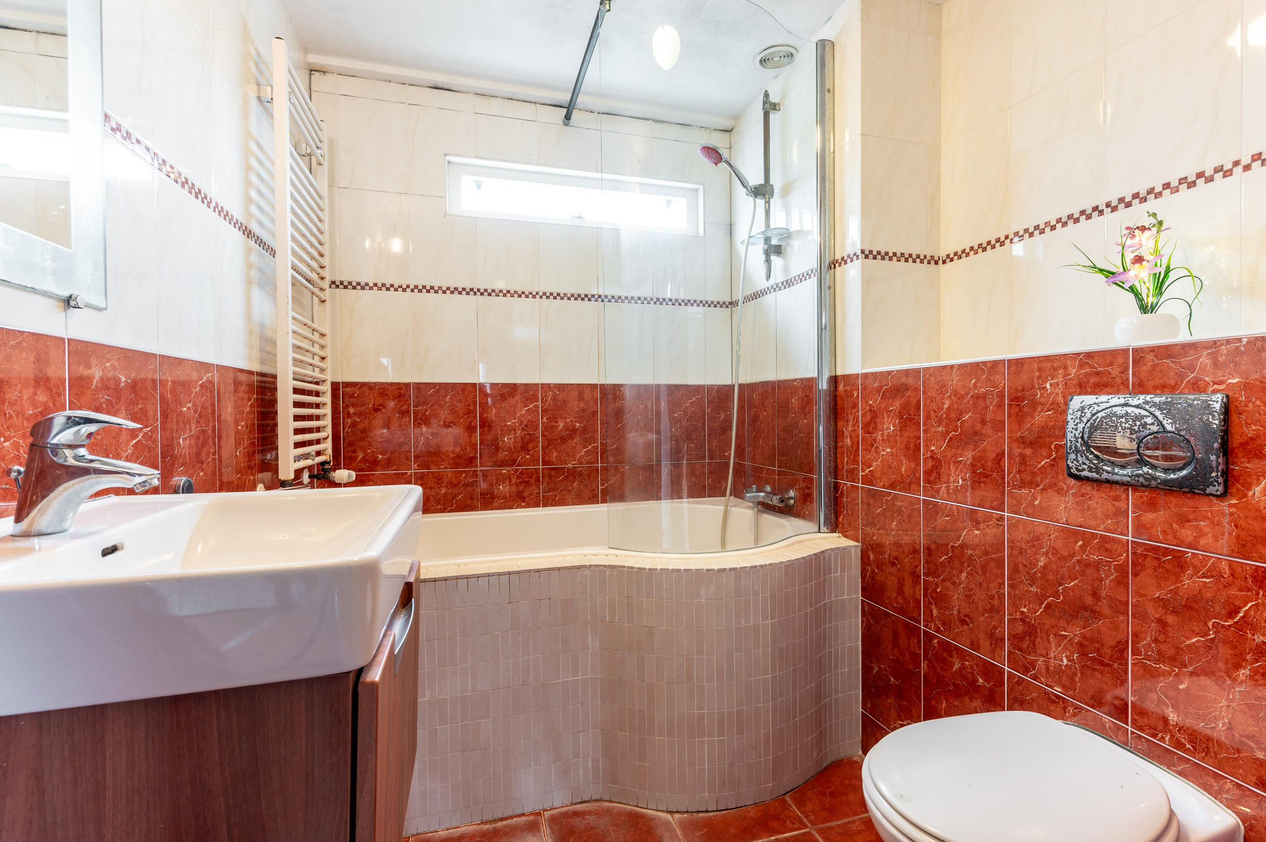 Eerste verdieping: Overloop; volledig betegelde badkamer (2005) welke is voorzien van een ligbad waarin ook gedouched kan worden, een wastafelmeubel, tweede toilet (vrijhangend), een designradiator alsmede een raam voor natuurlijke ventilatie en daglichttoetreding; drie slaapkamers van respectievelijk 12,1- / 11,4- en 8,6m². Deze verdieping is voorzien van een beuken stroken laminaatvloer.