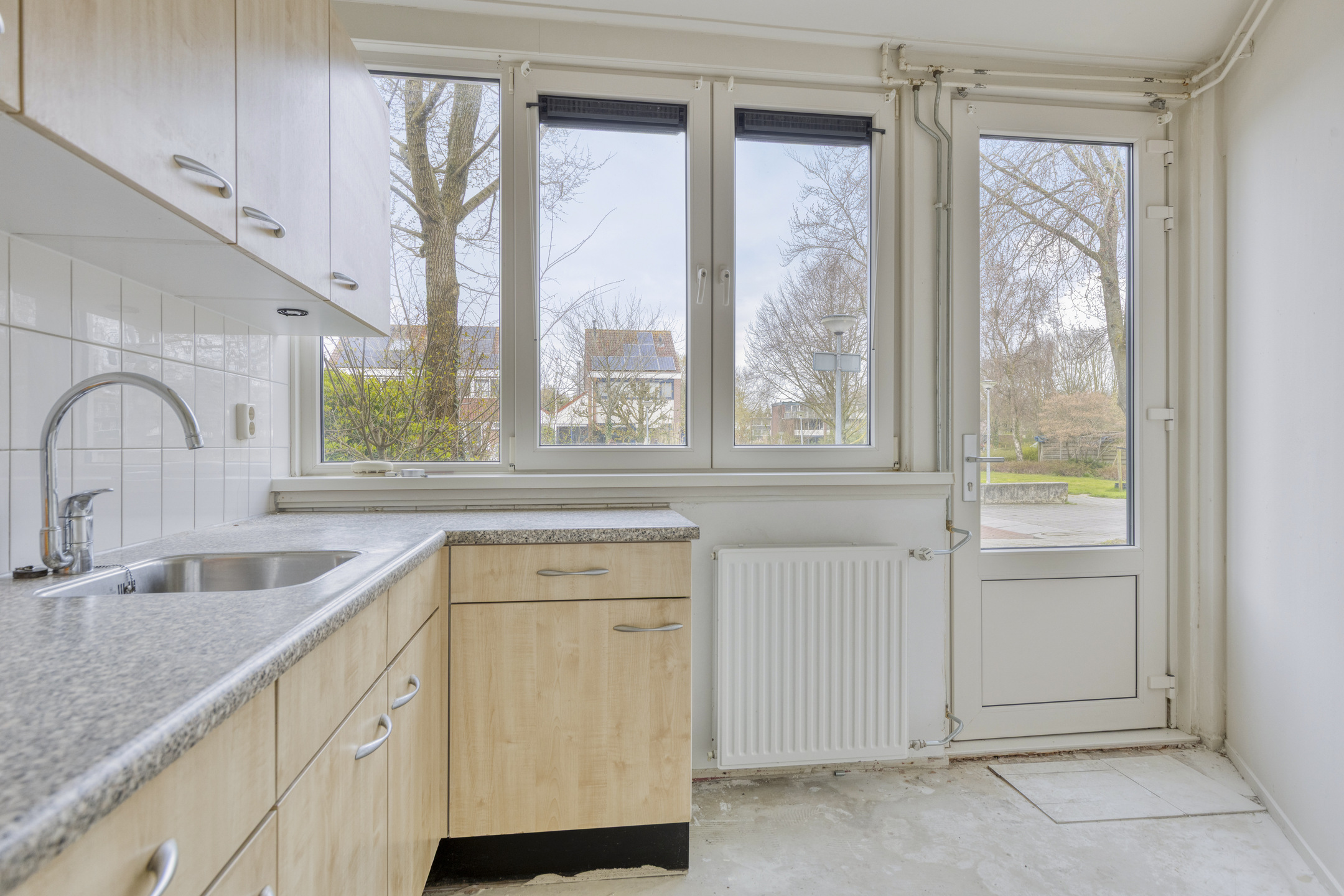 Begane grond: Overdekte entree, hal, toilet en fonteintje, meterkast, trapopgang naar de eerste verdieping; door de aanwezigheid van de vele ramen een heerlijke lichte tuingericht woonkamer (27,8m²) en geeft toegang tot de tuin door twee openslaande deuren; in Ahorn kleurstelling uitgevoerde, straatgerichte keuken in standaard L-opstelling, welke is voorzien van een afzuigkap.